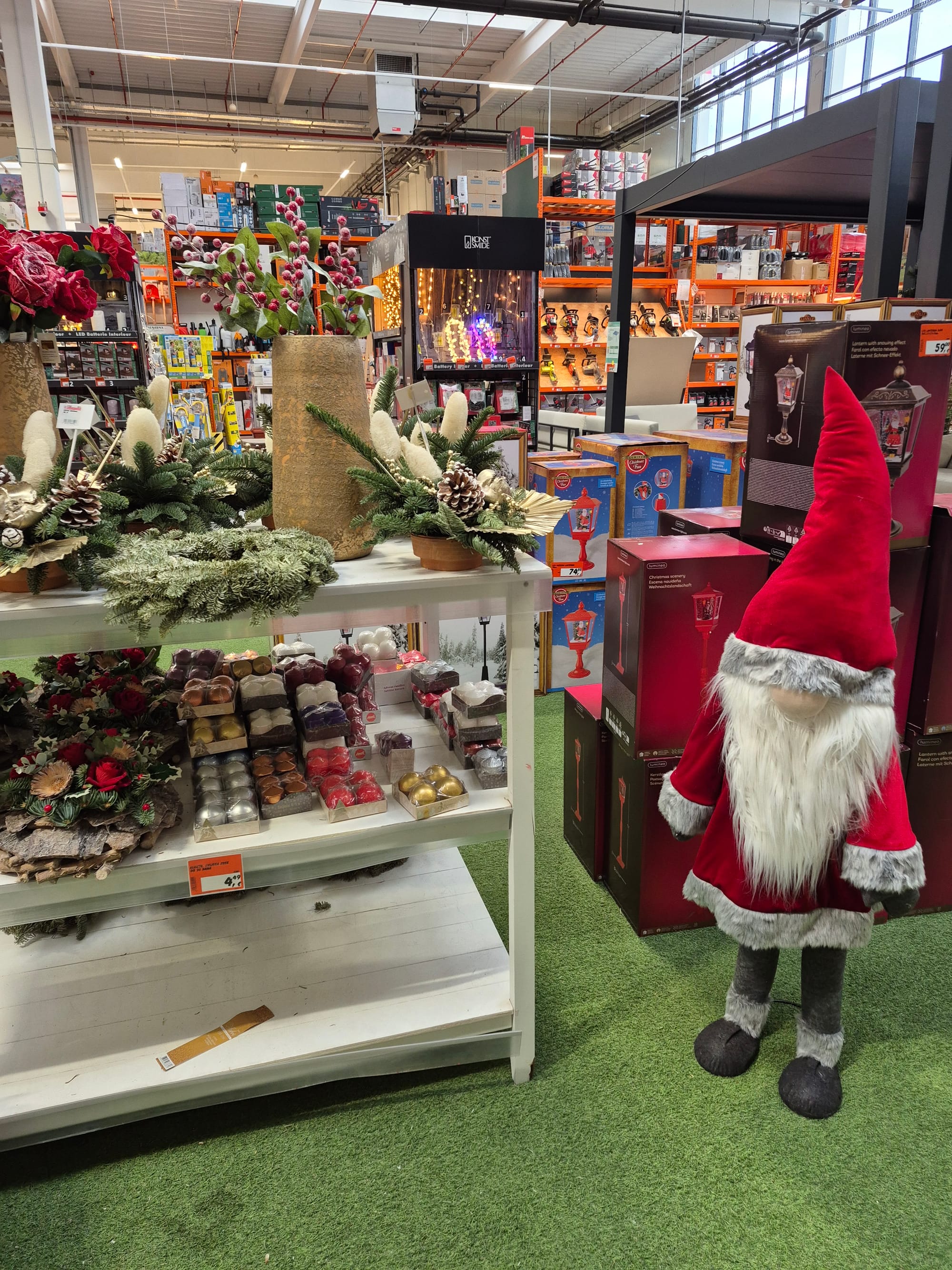 Andreas verzieht sich zu den Schrauben, Kabeln und dem Nautic Zubehör, ich schaue mich anderweitig um und entdecke die Weihnachtsabteilung. Die aufgestellten Weihnachtsmänner trällern durcheinander ihre Weihnachtslieder.