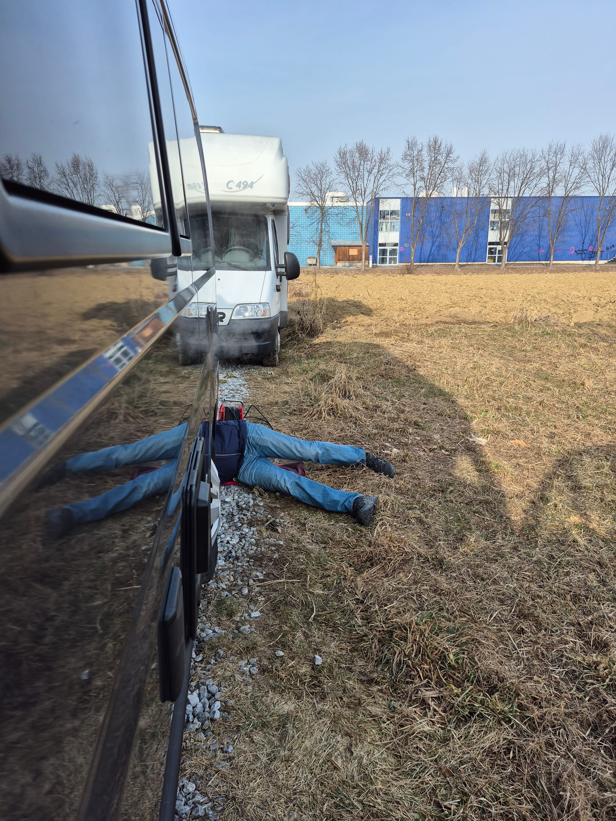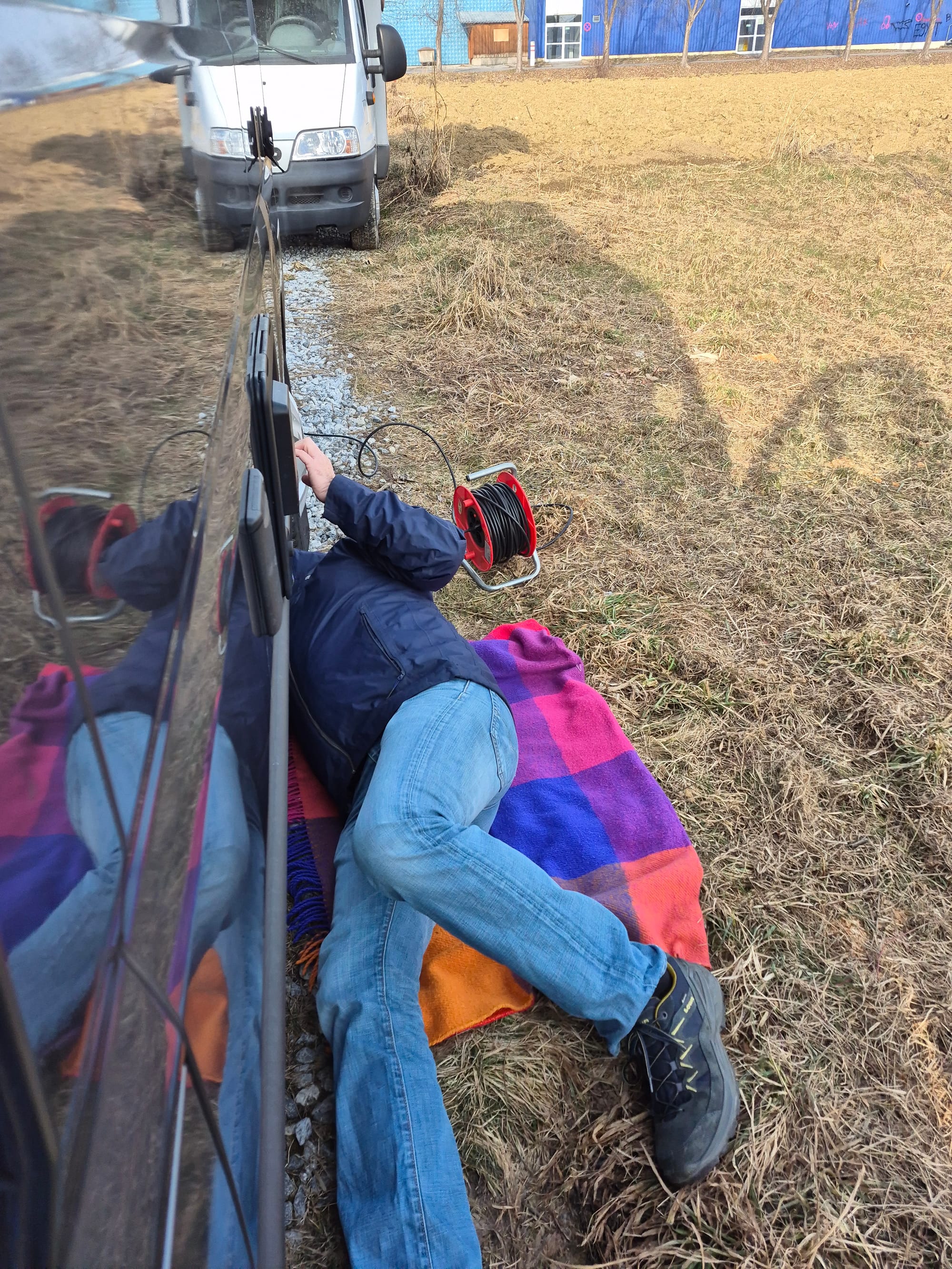 Der Luftbalg von Luigis Luftfederung ist eingefroren. Diese eisigen Minusgrade ist er nicht gewohnt. Andreas muss erst fönen bevor wir weiterfahren können.