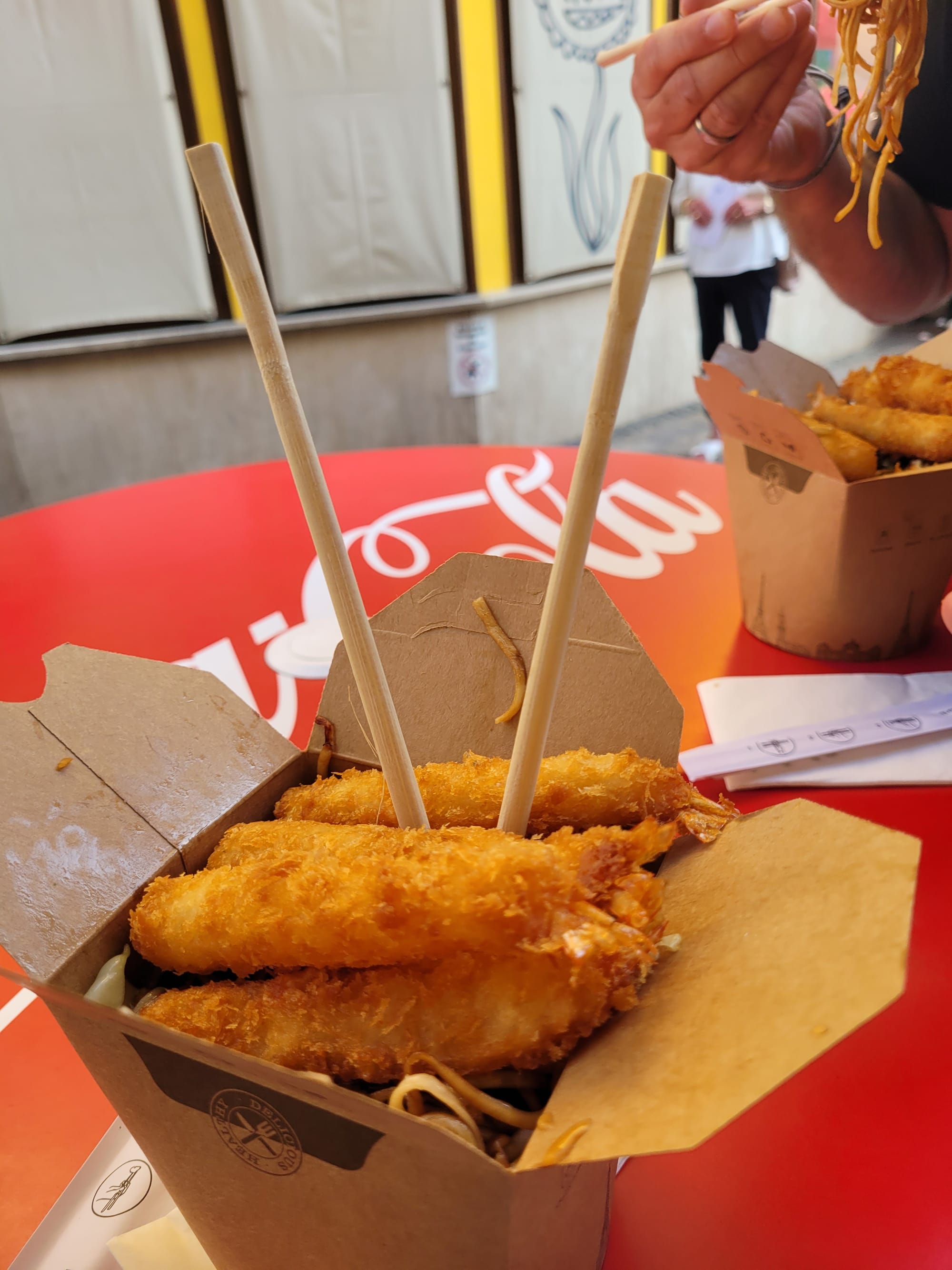 Andreas und ich starten am Franziskaner Platz mit asiatischen Gemüsenudeln und Kokosgarnelen.