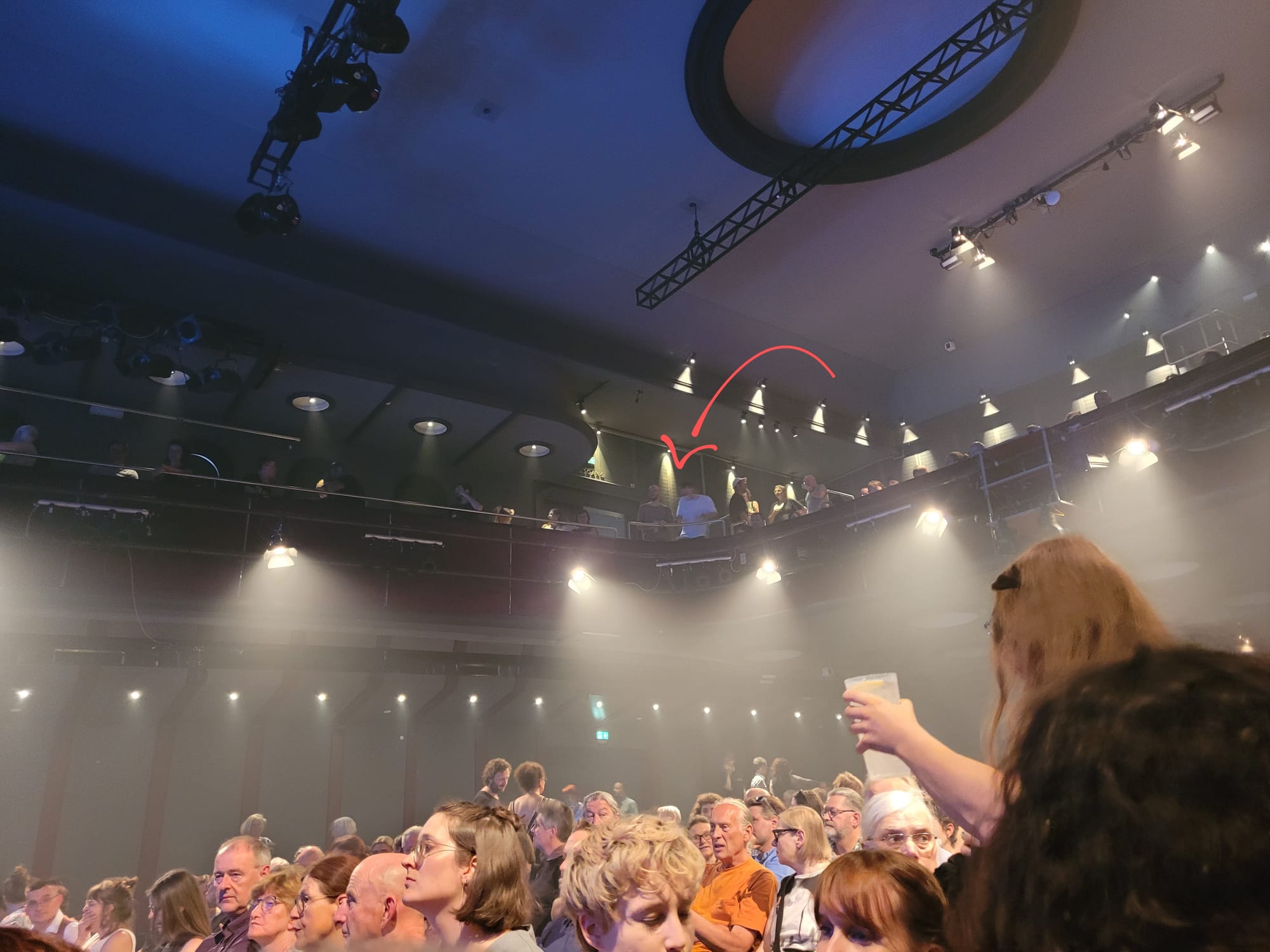 Matthias schließt sich mit seinem Freund auch an, die beiden haben aber schlauerweise Stehplatzkarten oben auf dem Balkon gekauft, wir Sitzplatzkarten unten in der vierten Reihe - warum auch immer.