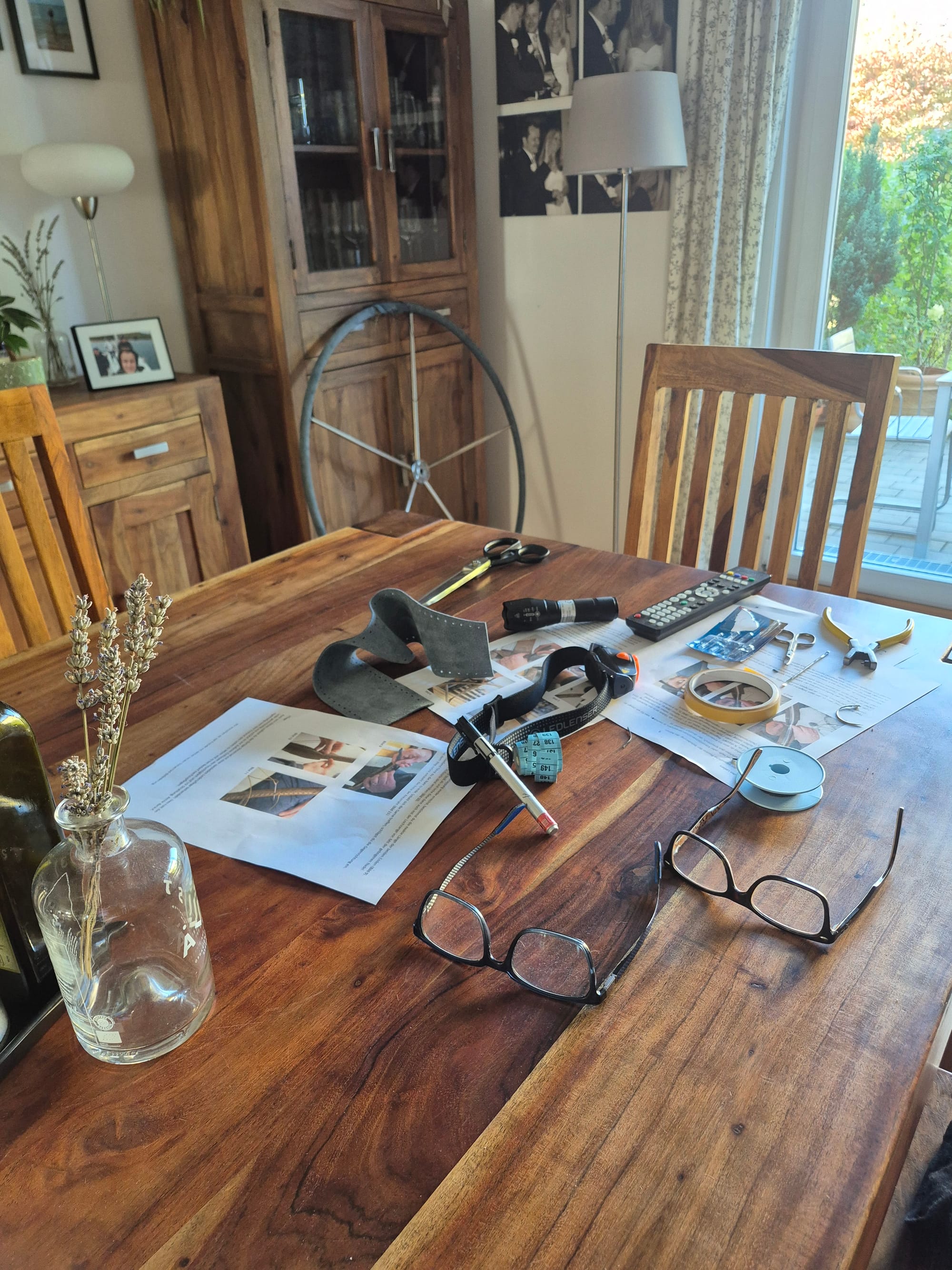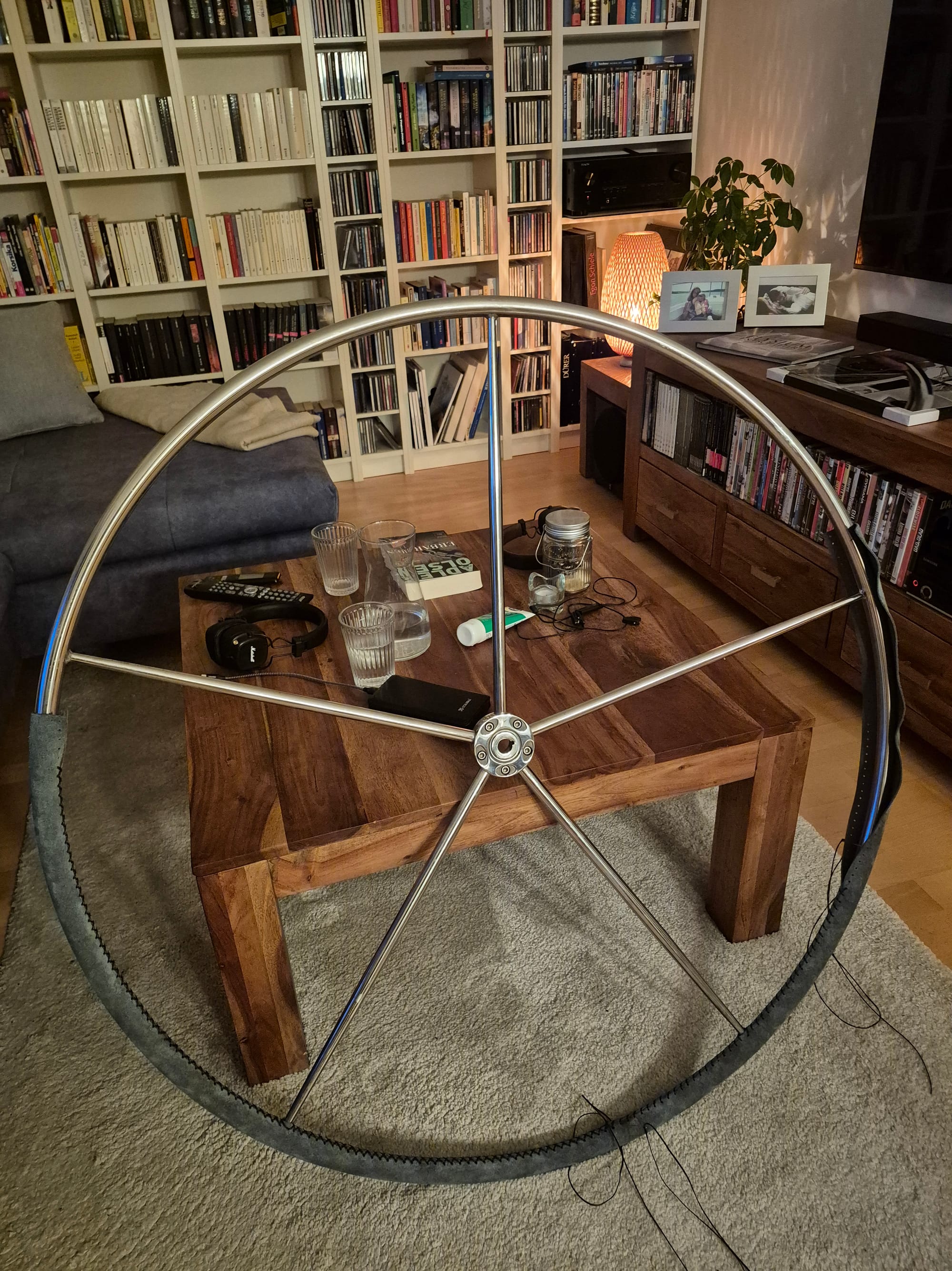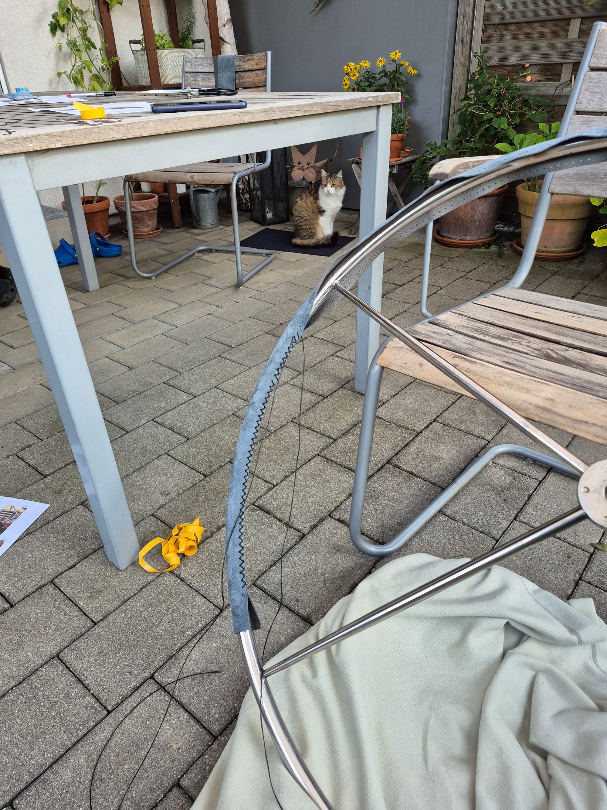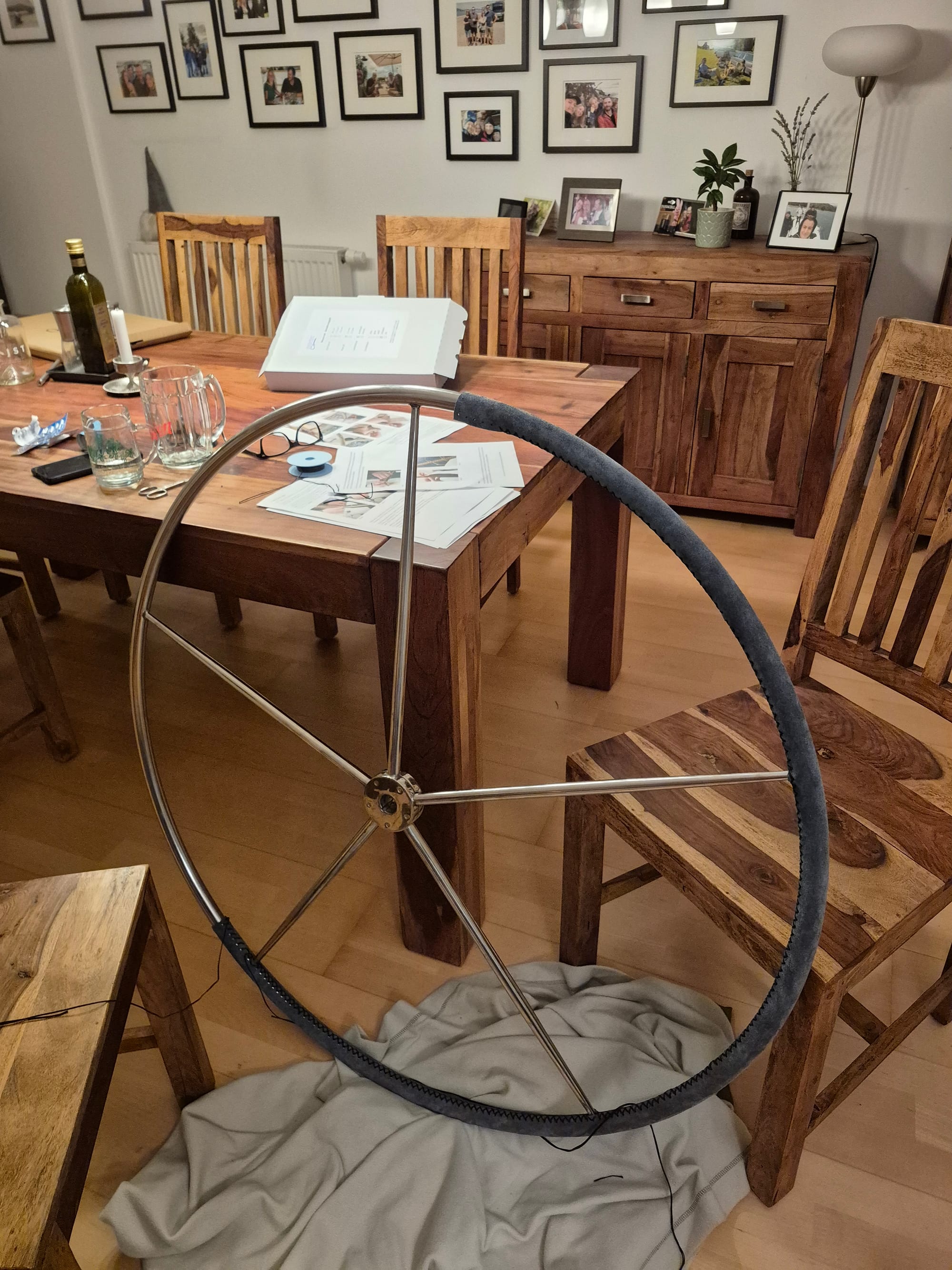 ...und das Steuerrad mit Kreuzstich bezogen. Zuerst im Garten unter Aufsicht von Mimi...