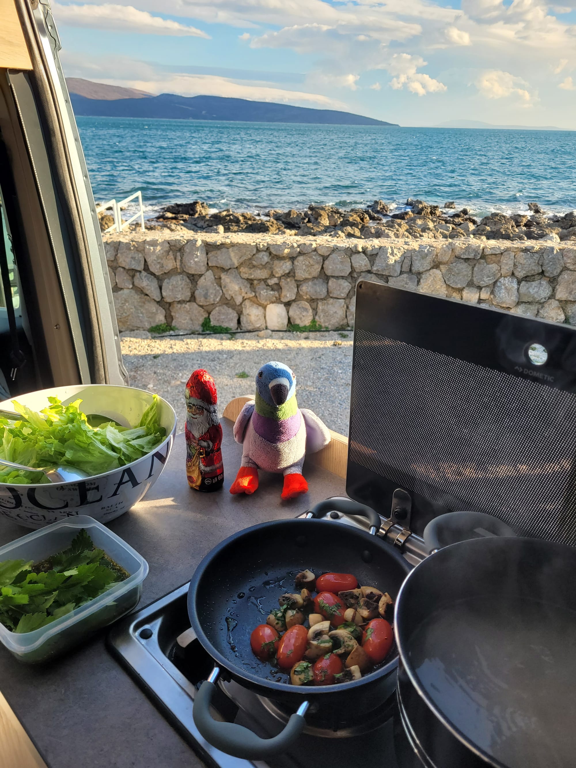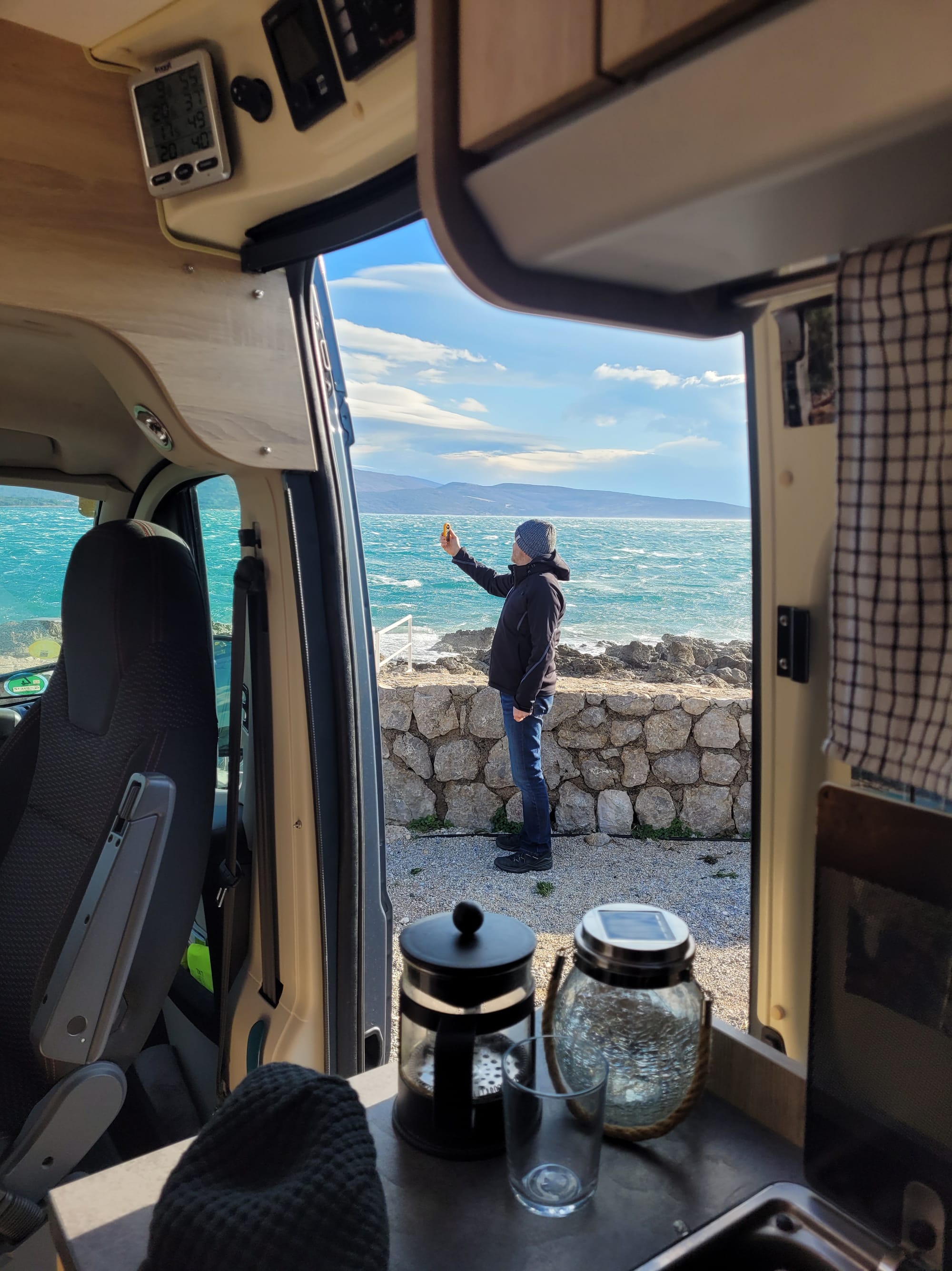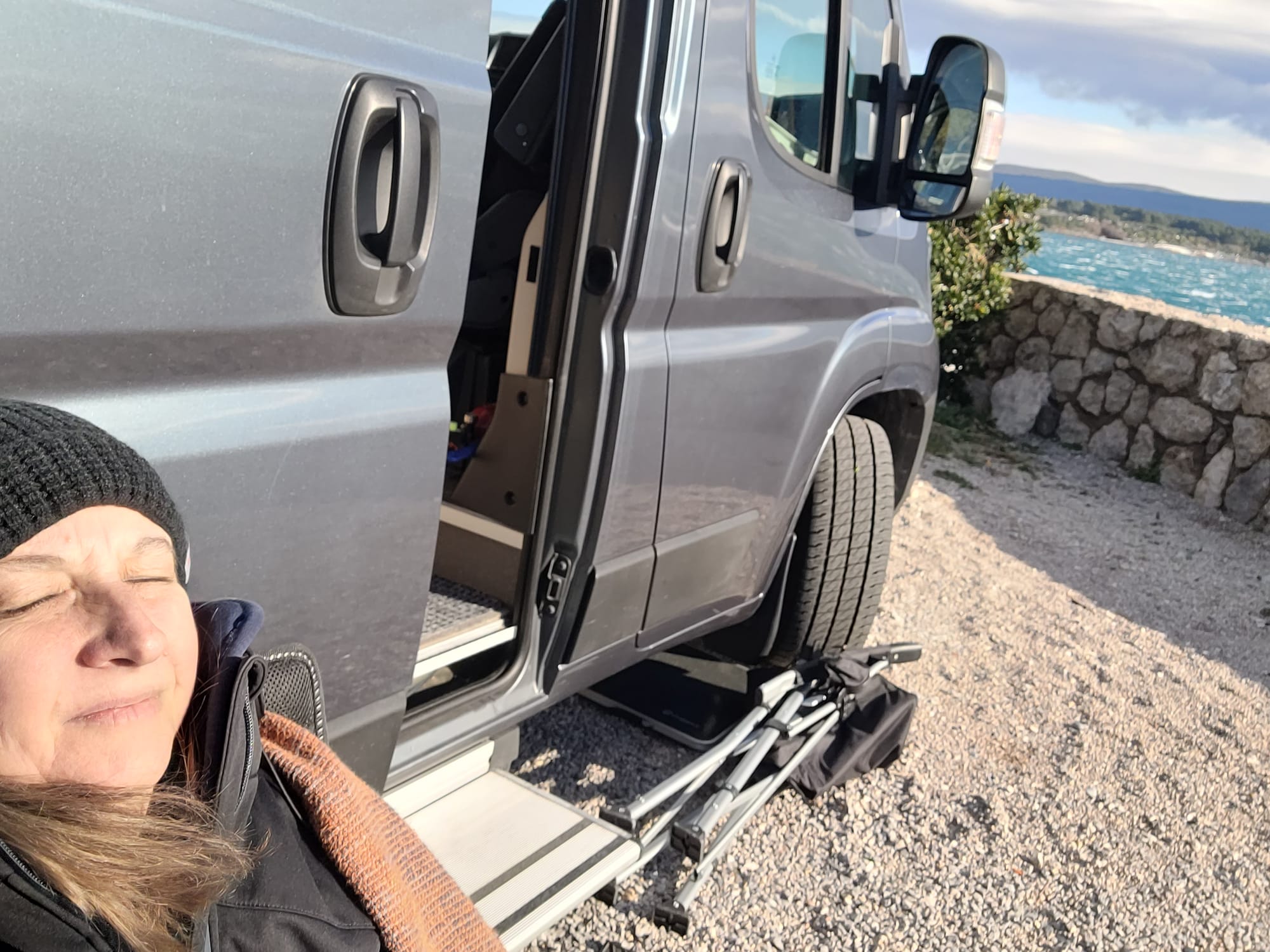 Trotz Wind scheint die Sonne so warm, dass wir die Schiebetür beim Luigi offen lassen.