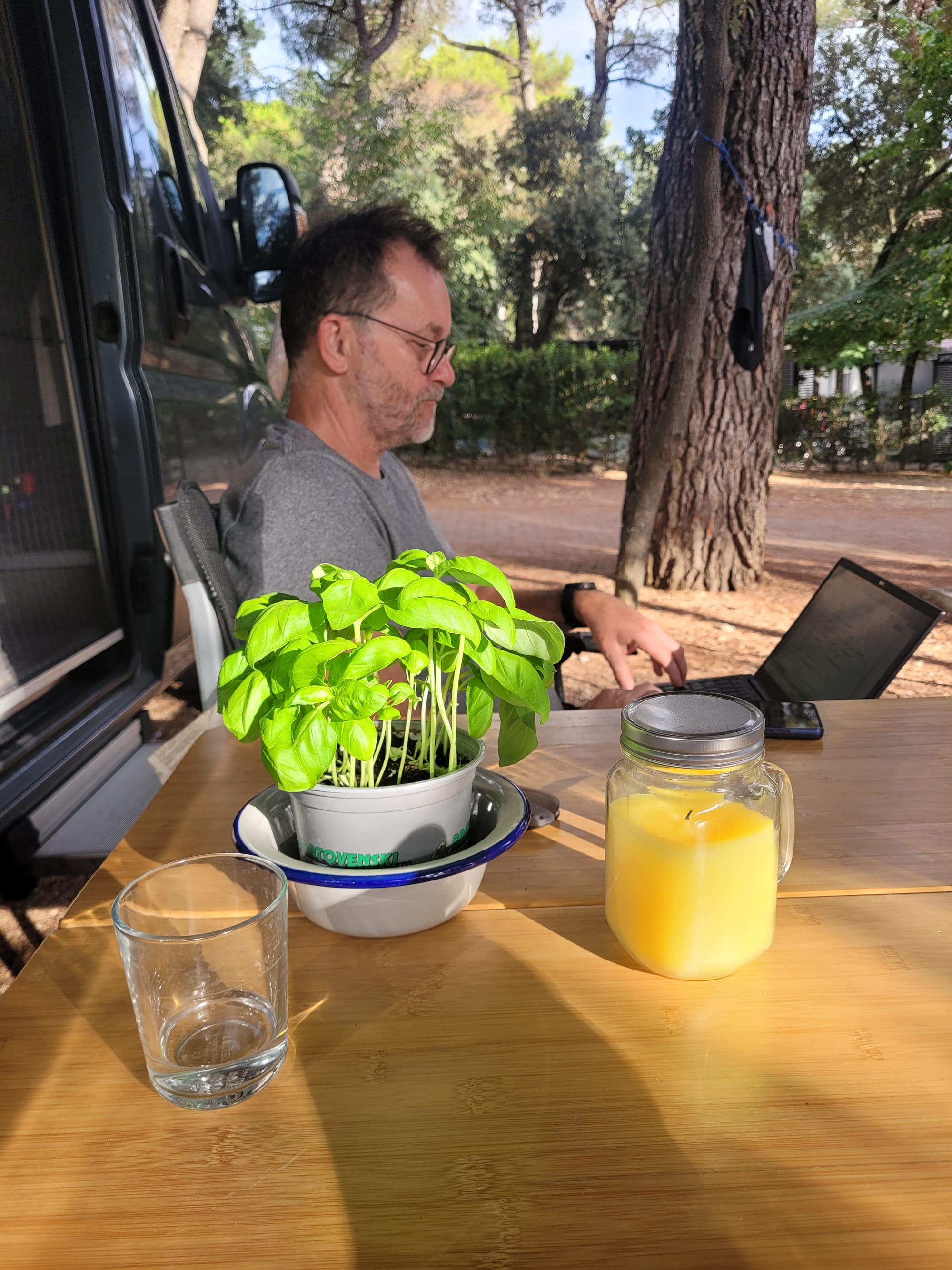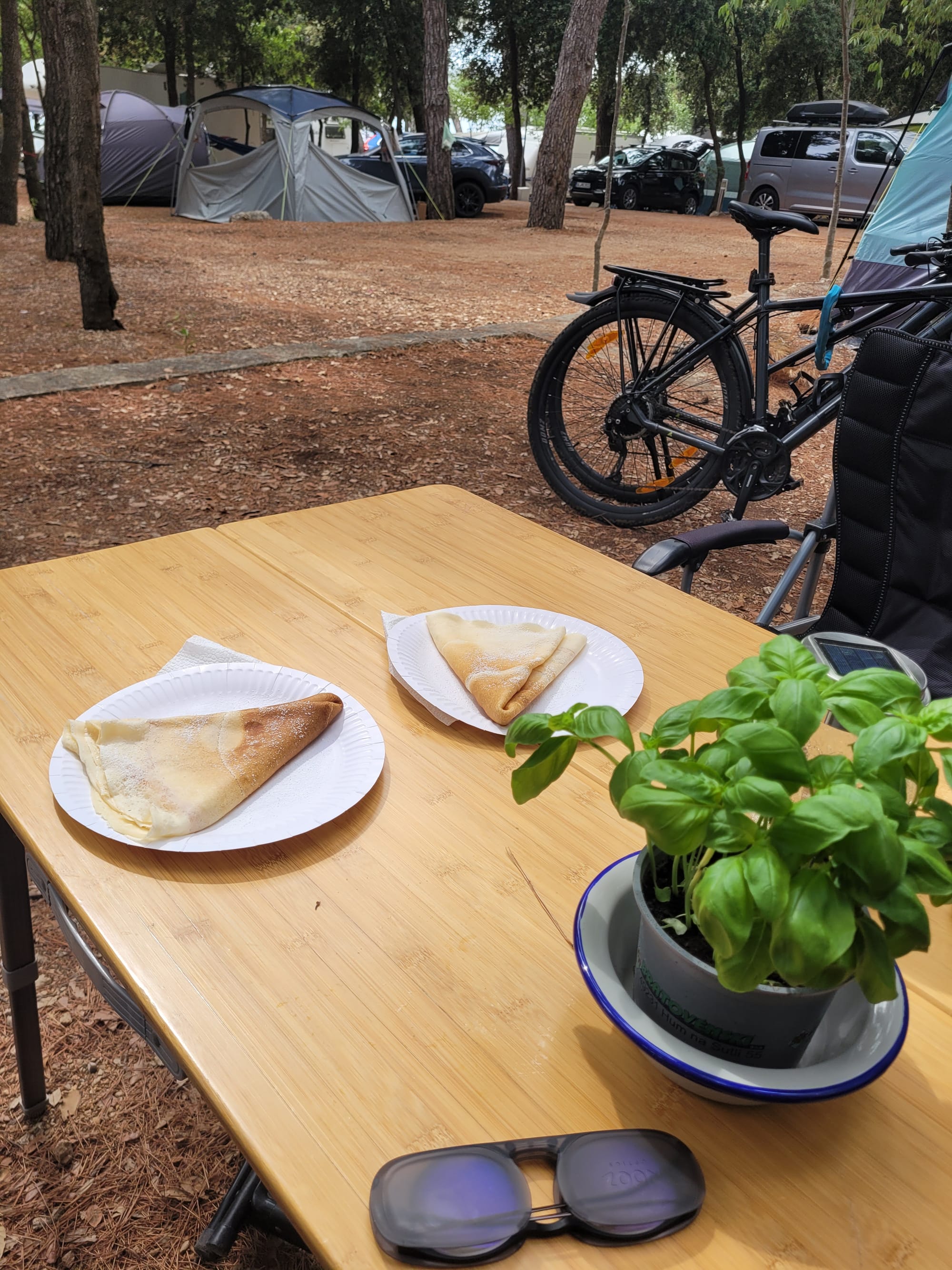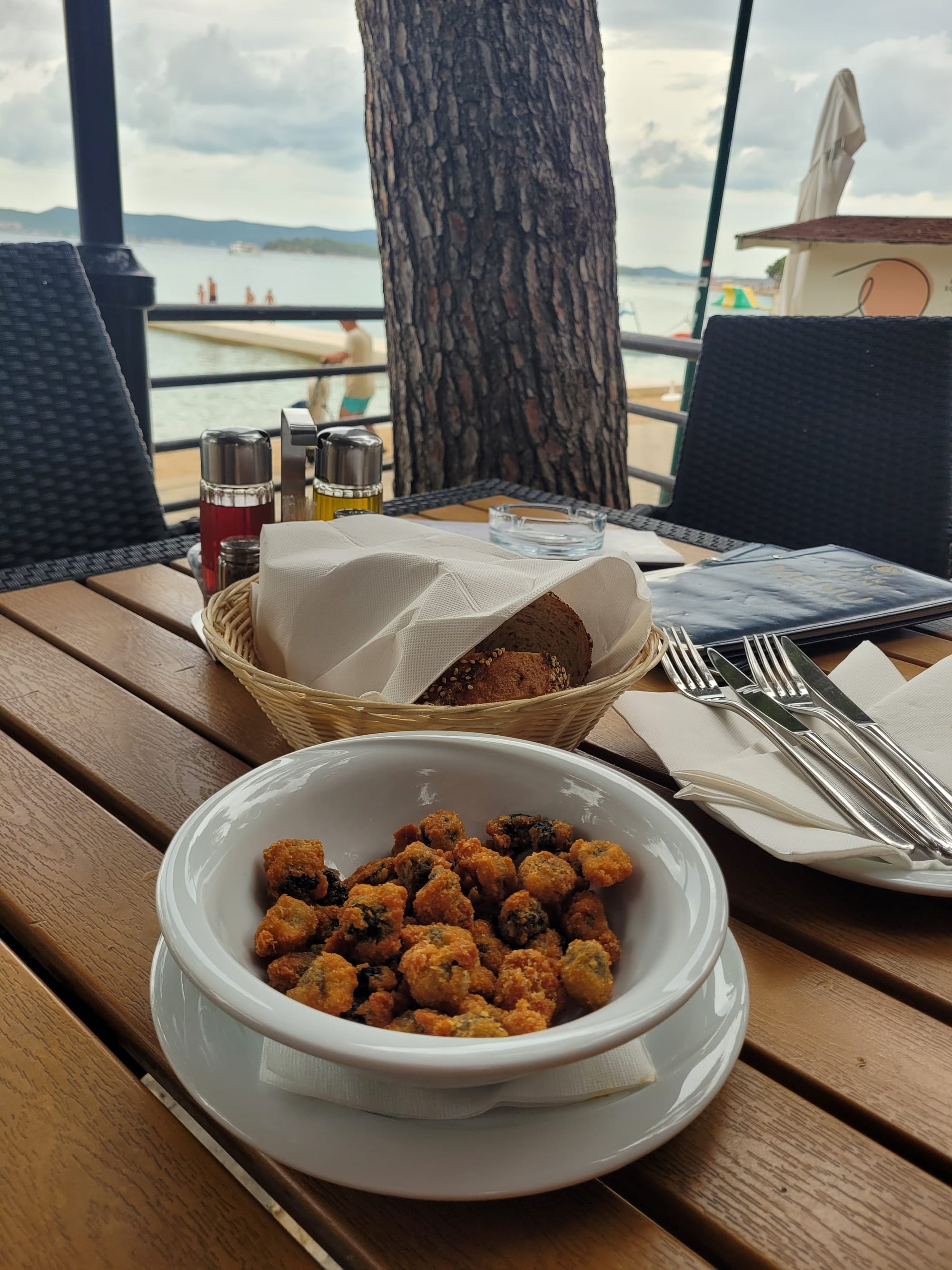 Andreas und ich brauchen wieder eine Nachbesprechung im Campingplatz Restaurant. Heute bekommen wir frittierte Oliven on the house. 🤗