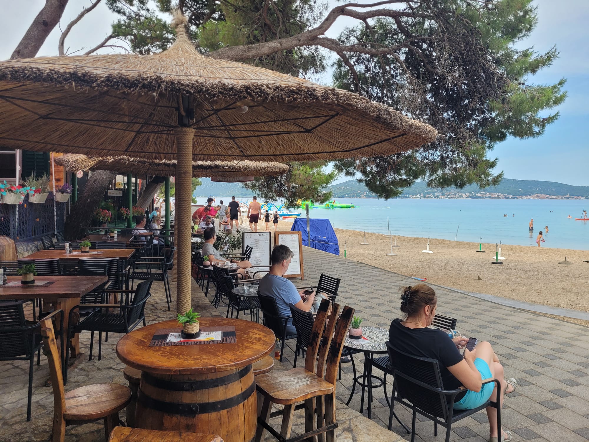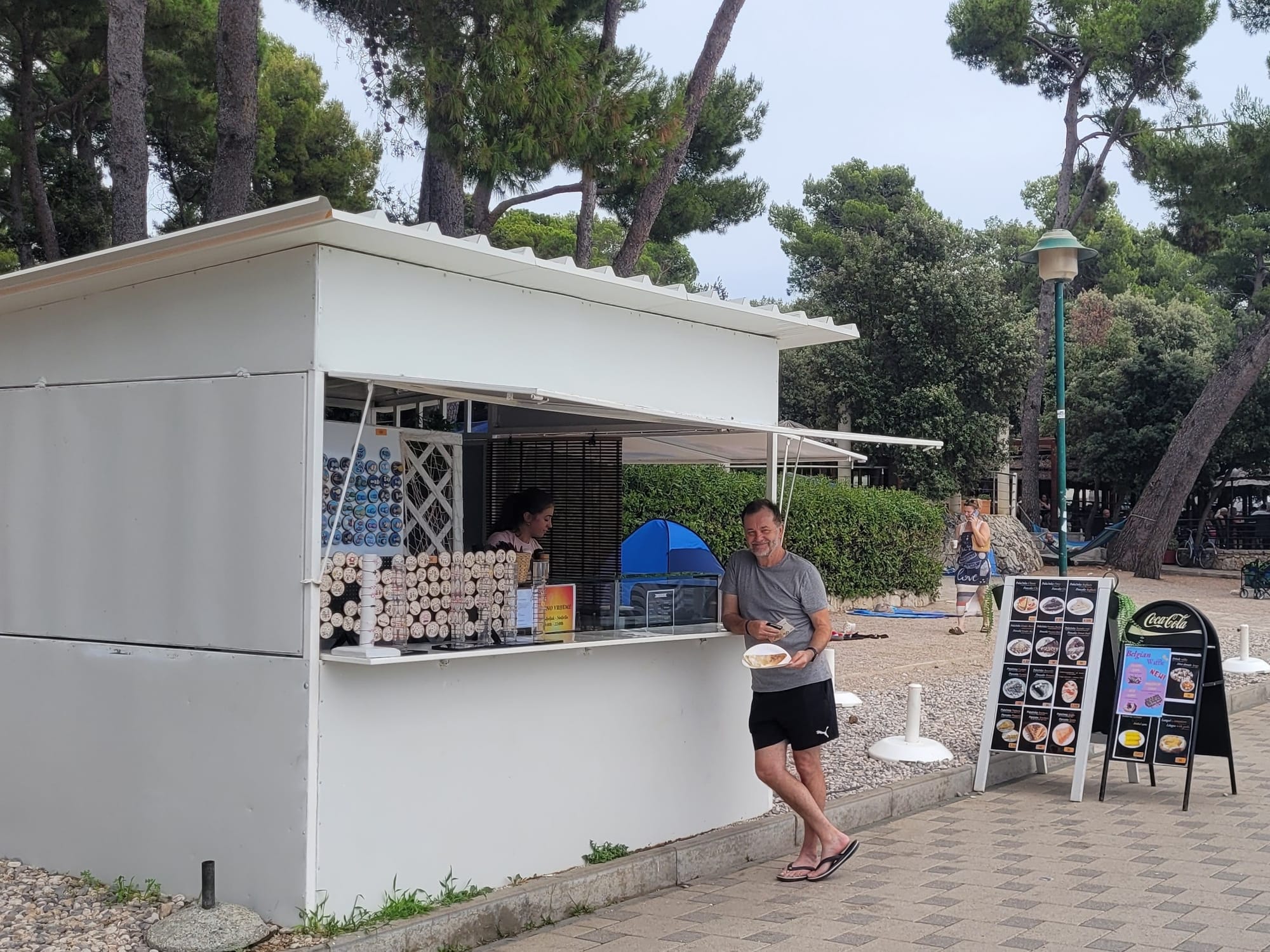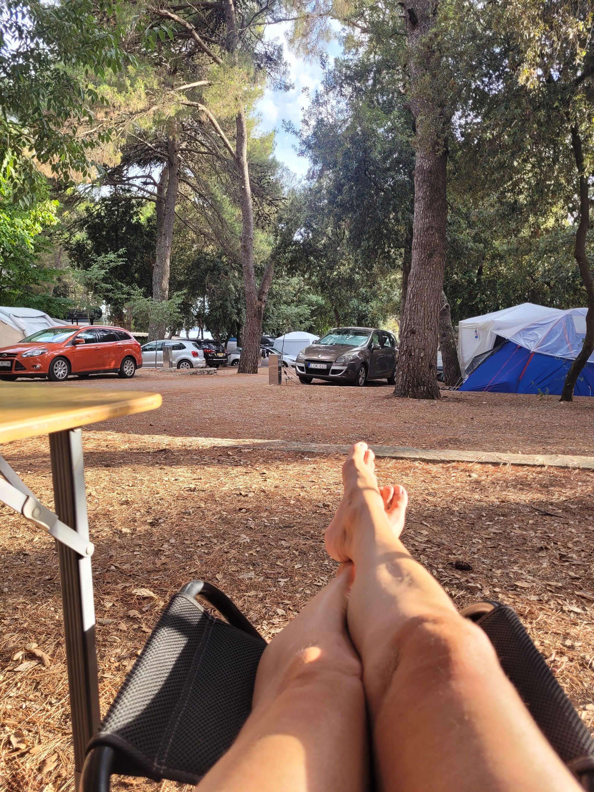 Andreas und ich brauchen wieder eine Nachbesprechung im Campingplatz Restaurant. Heute bekommen wir frittierte Oliven on the house. 🤗