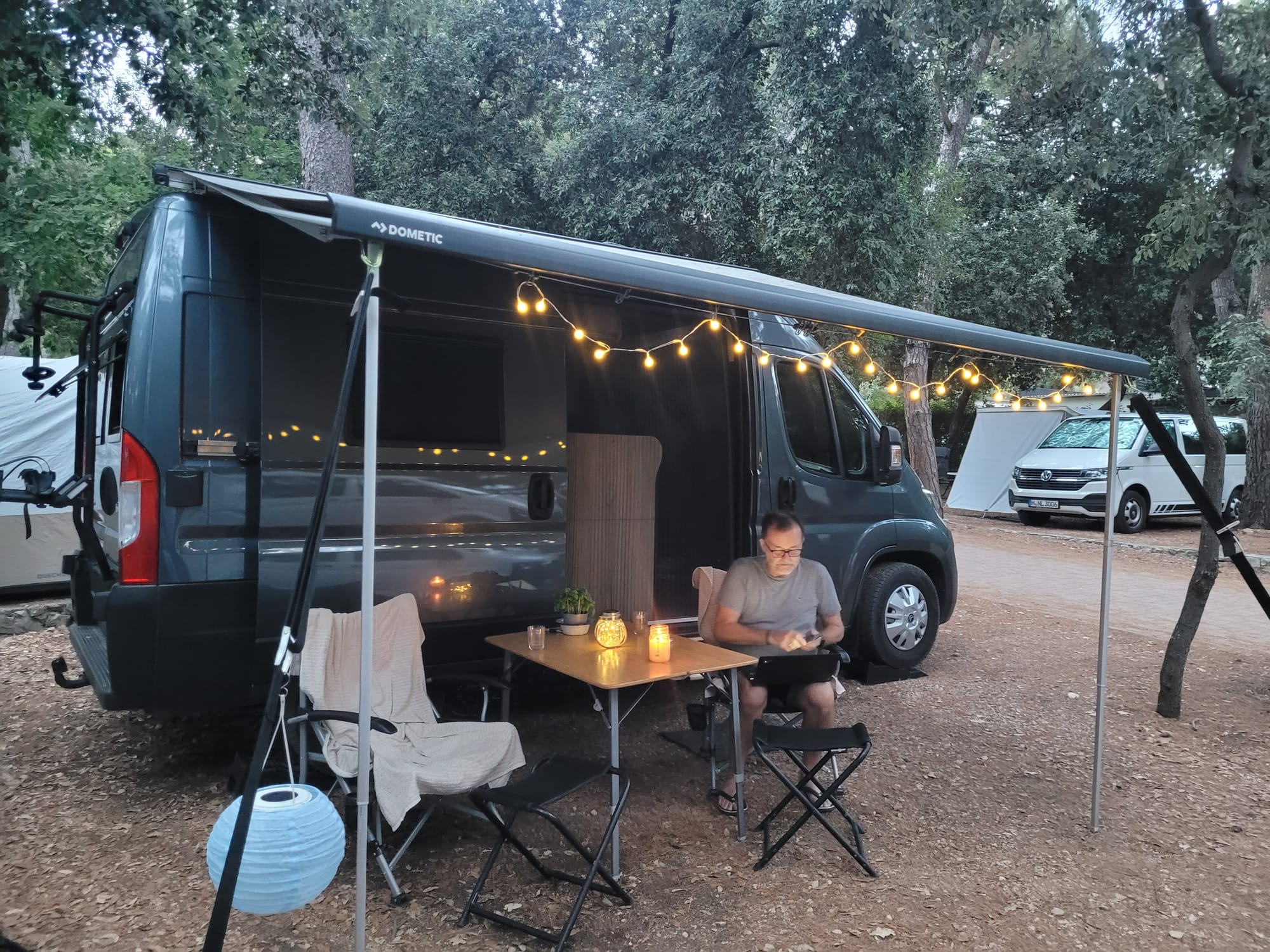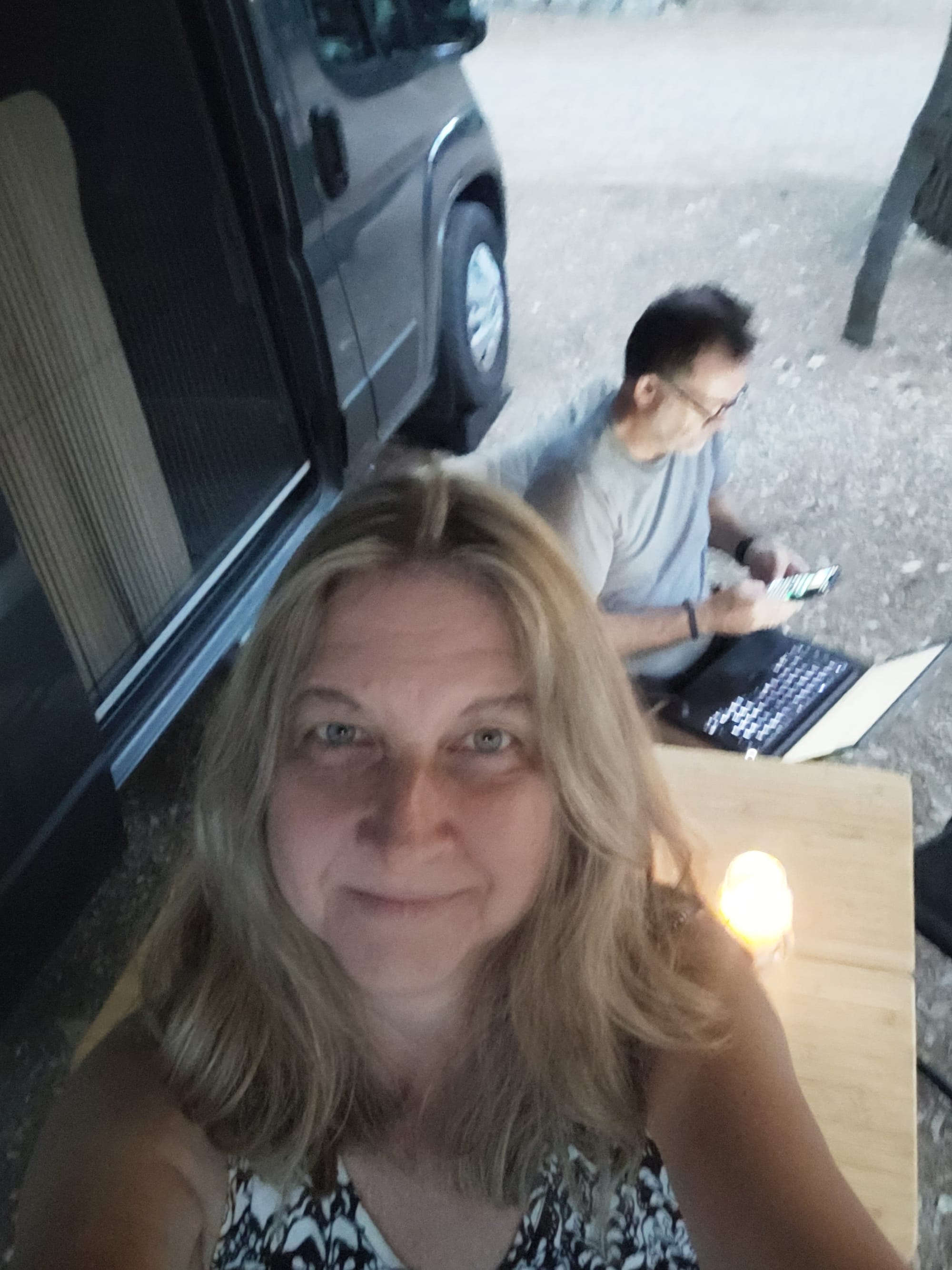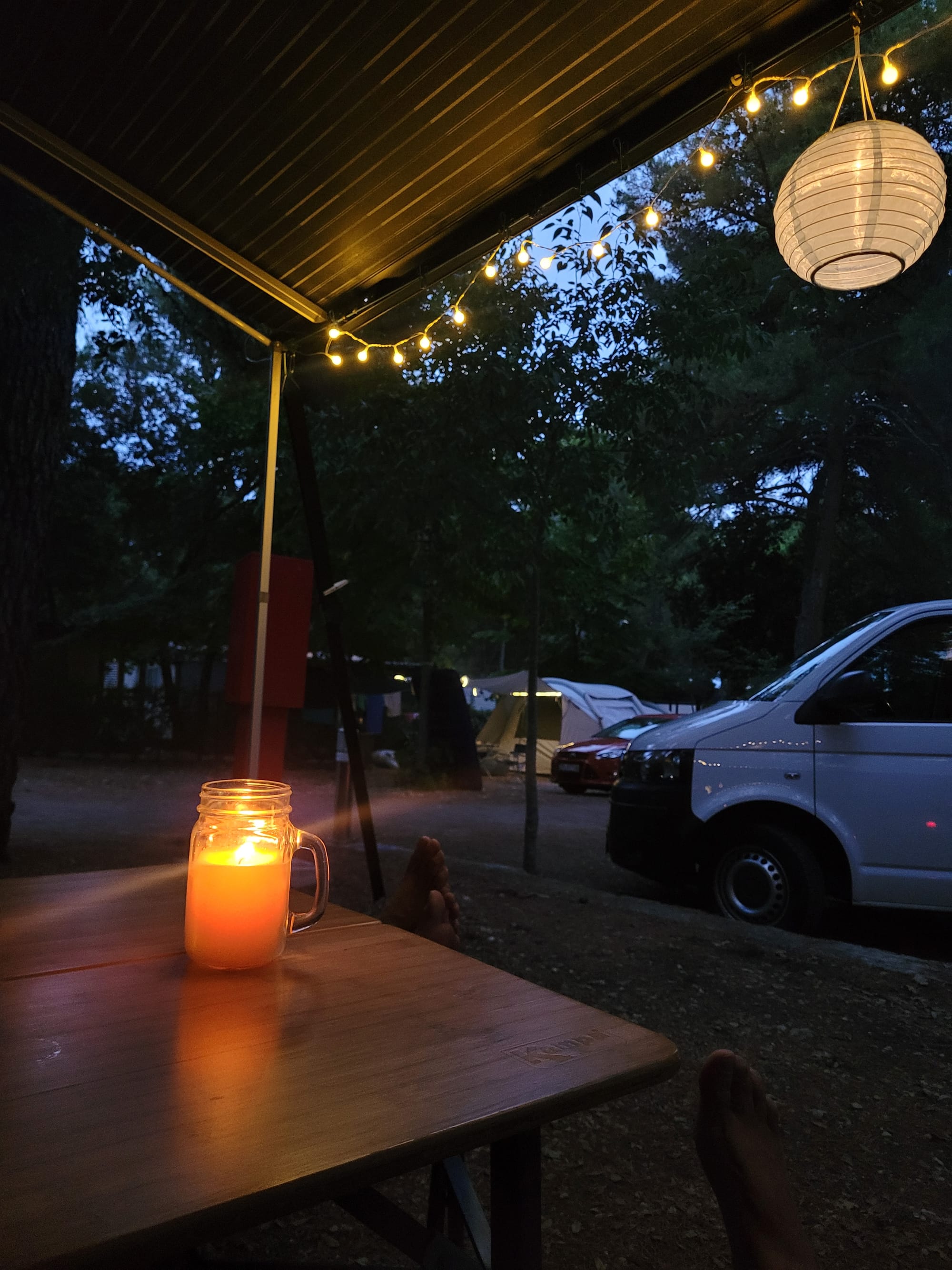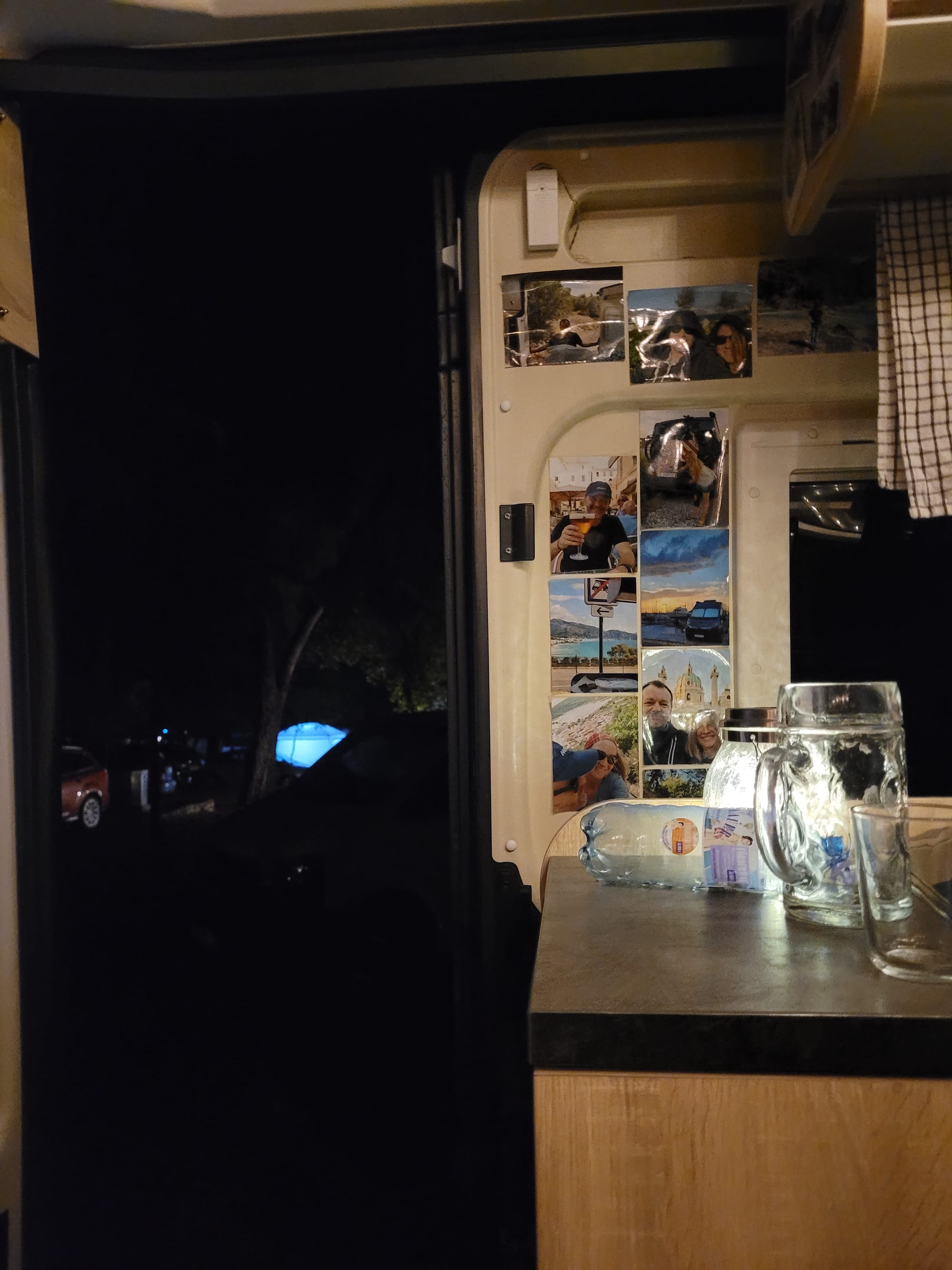 Schließlich beschließen wir die Markise einzukurbeln und flüchten dann in den Luigi. Nach einer Trocknung - das nasse Gewand schmeißen wir hinaus in den Regen, ist eh schon wurscht - verbringen wir den restlichen Abend im Camper.