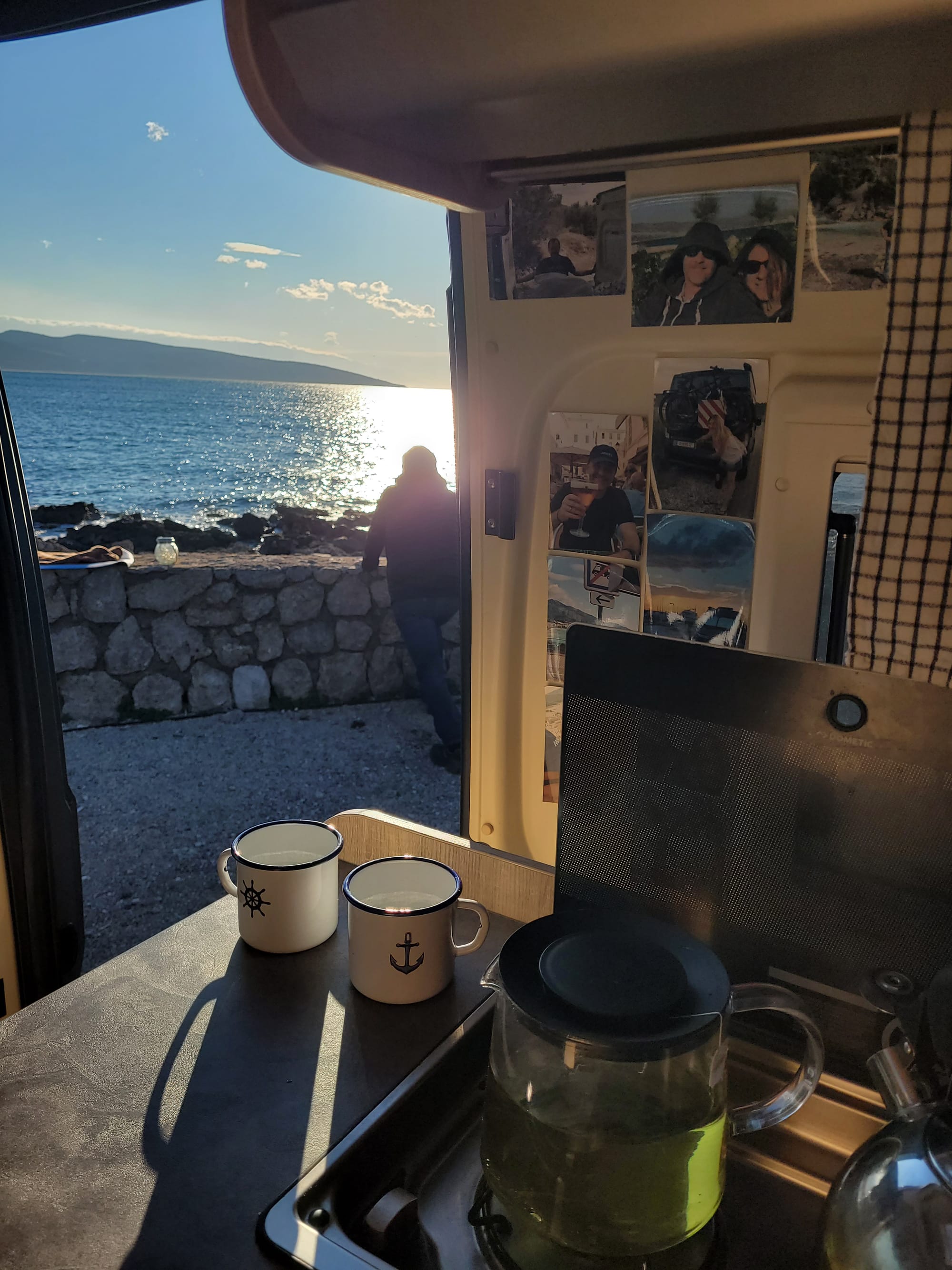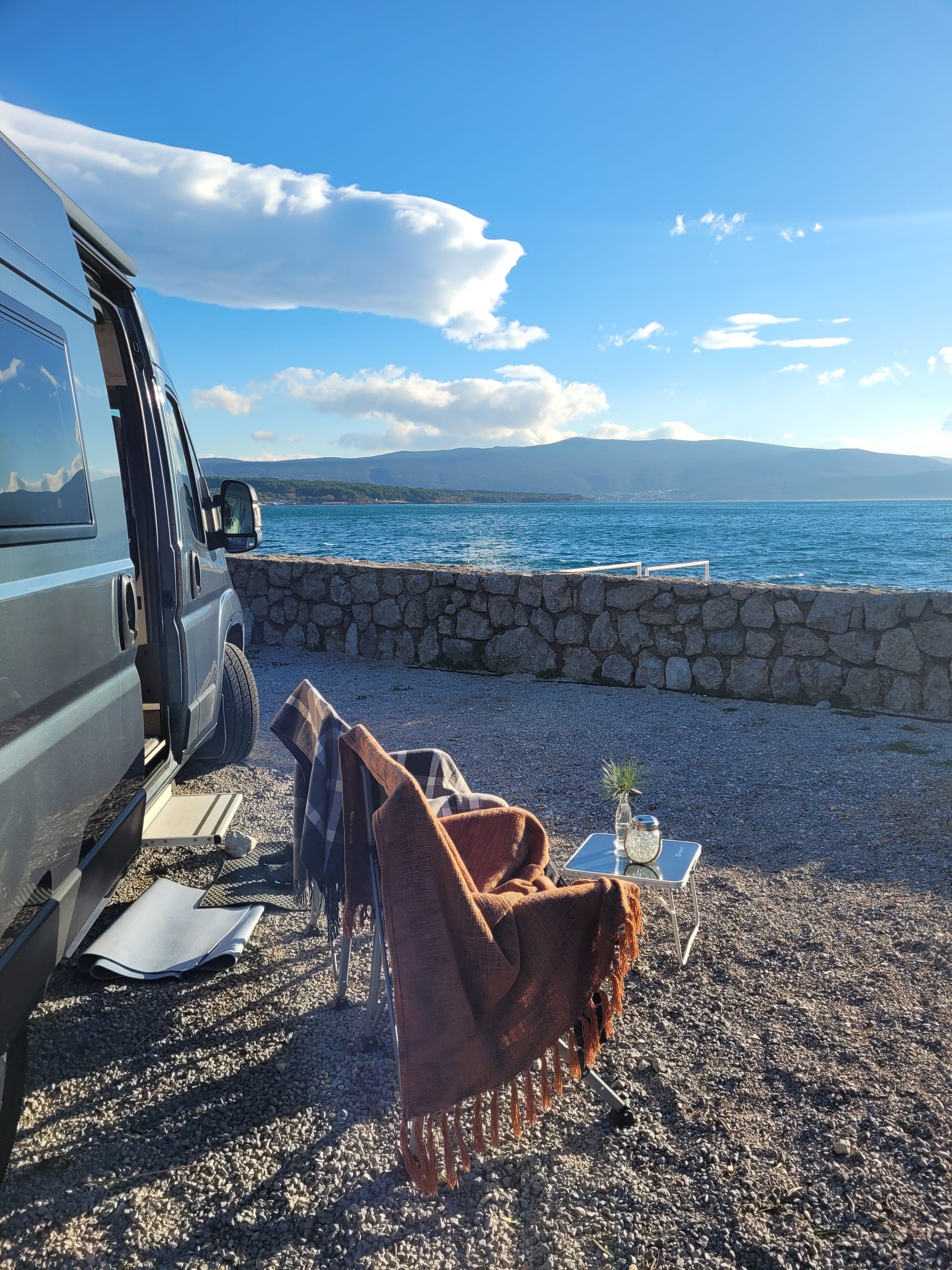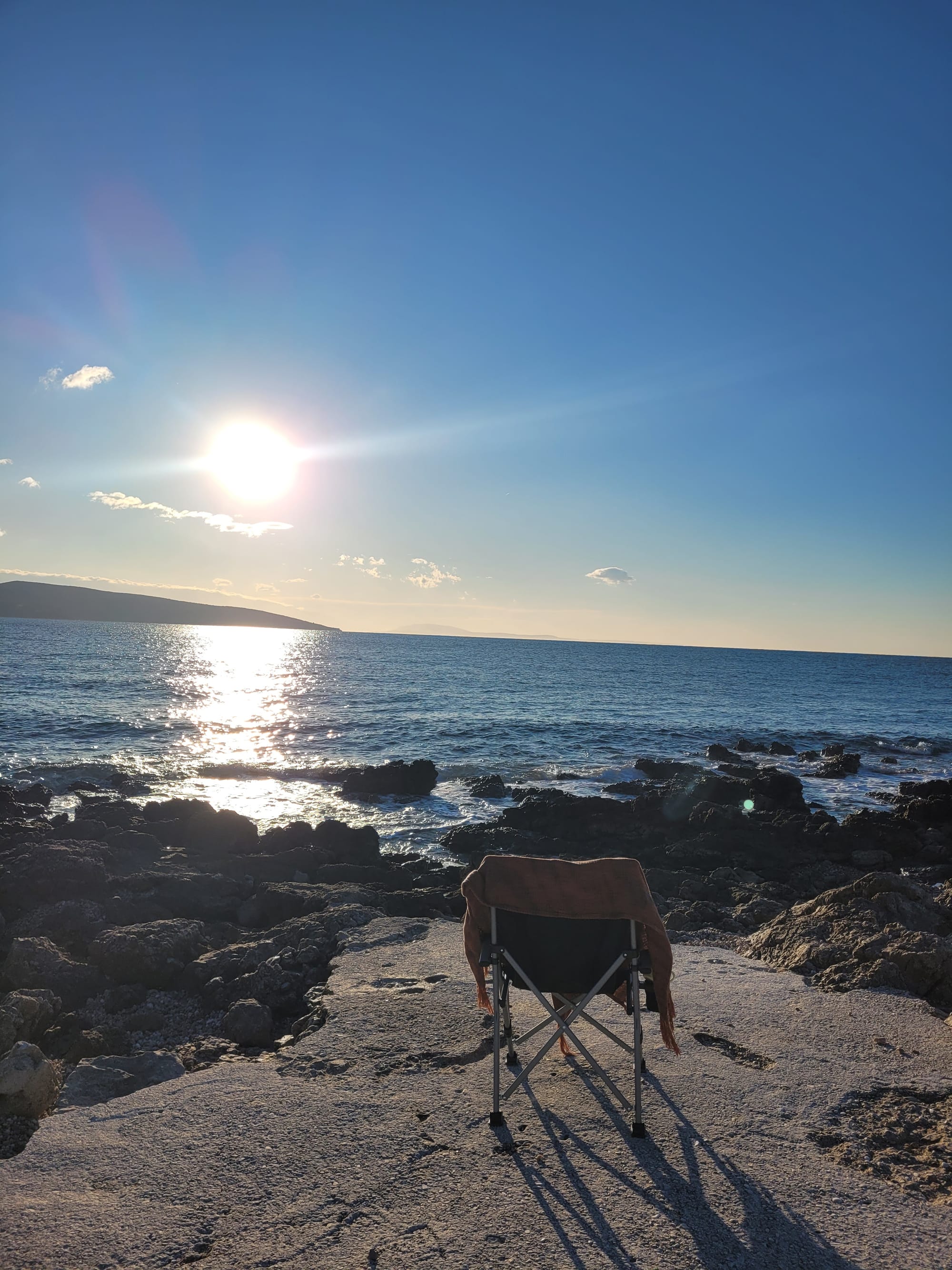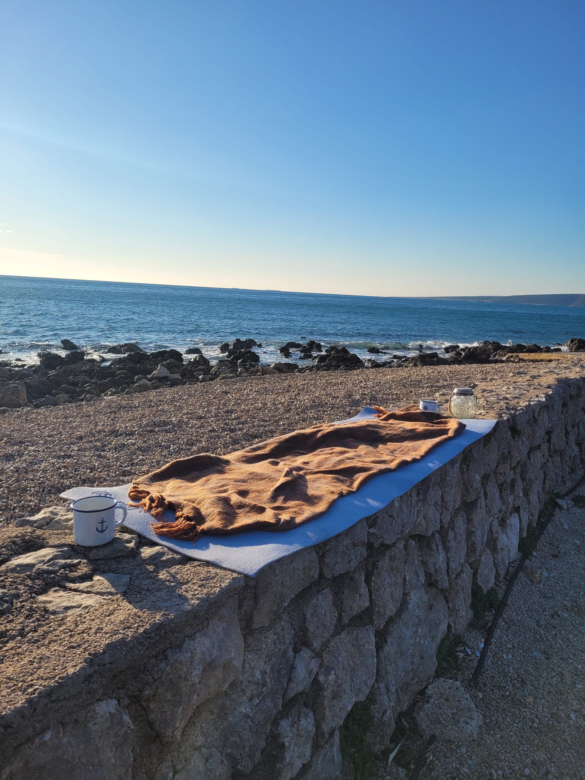 Zum Morgenkaffee wird das Wetter milder. Ich stelle unsere Sessel auf und nehme den Kaffee direkt am Meer.