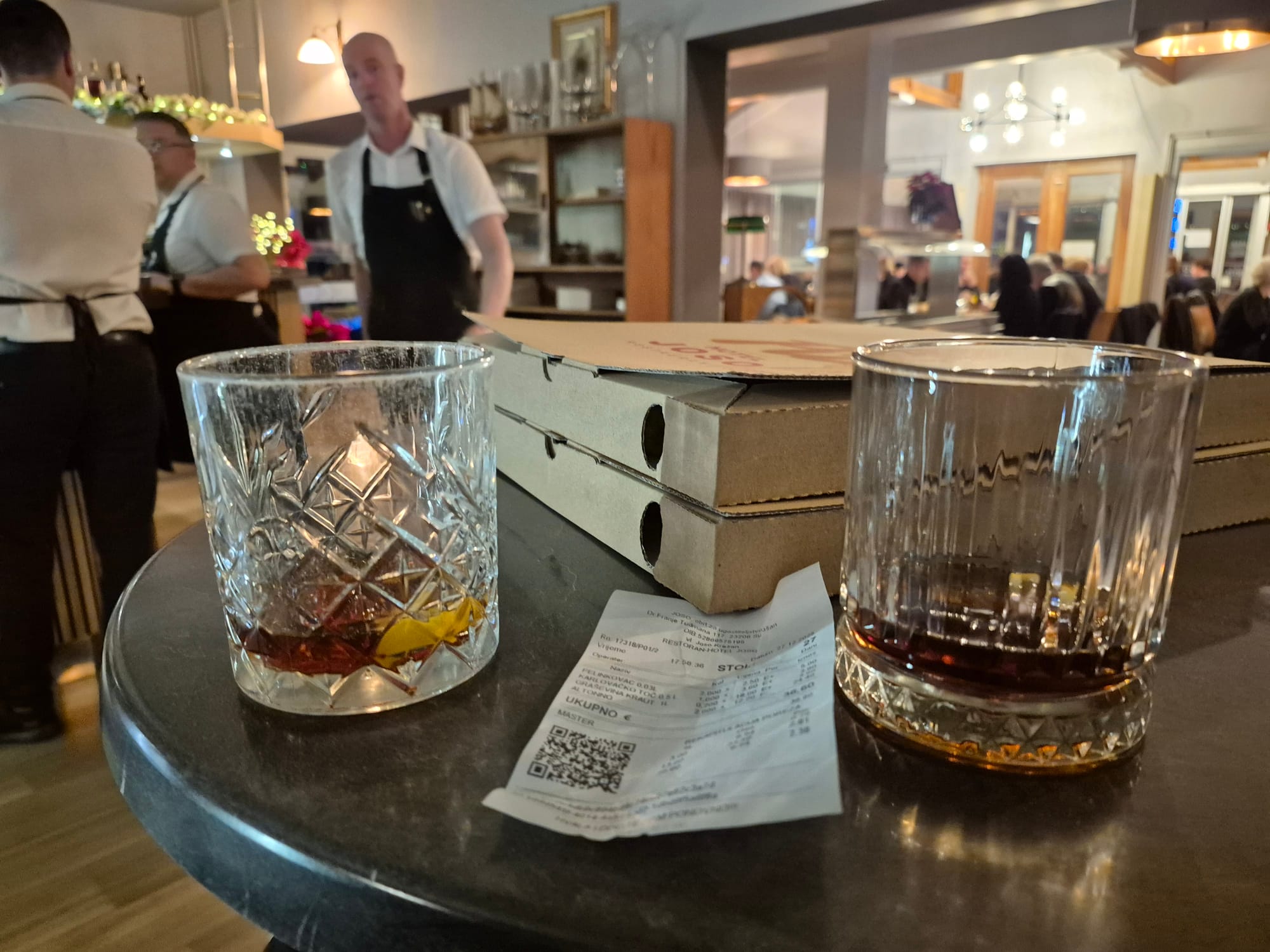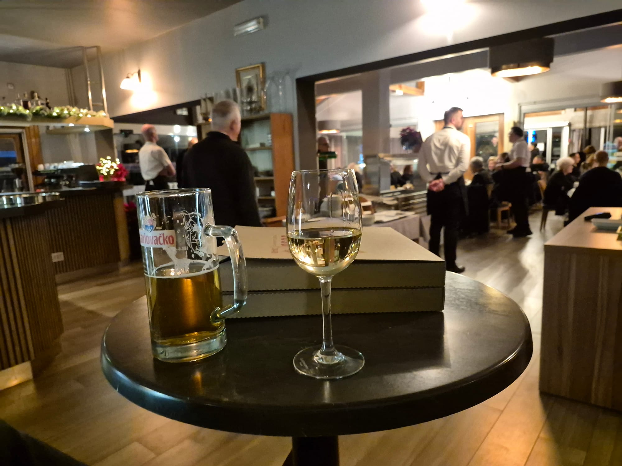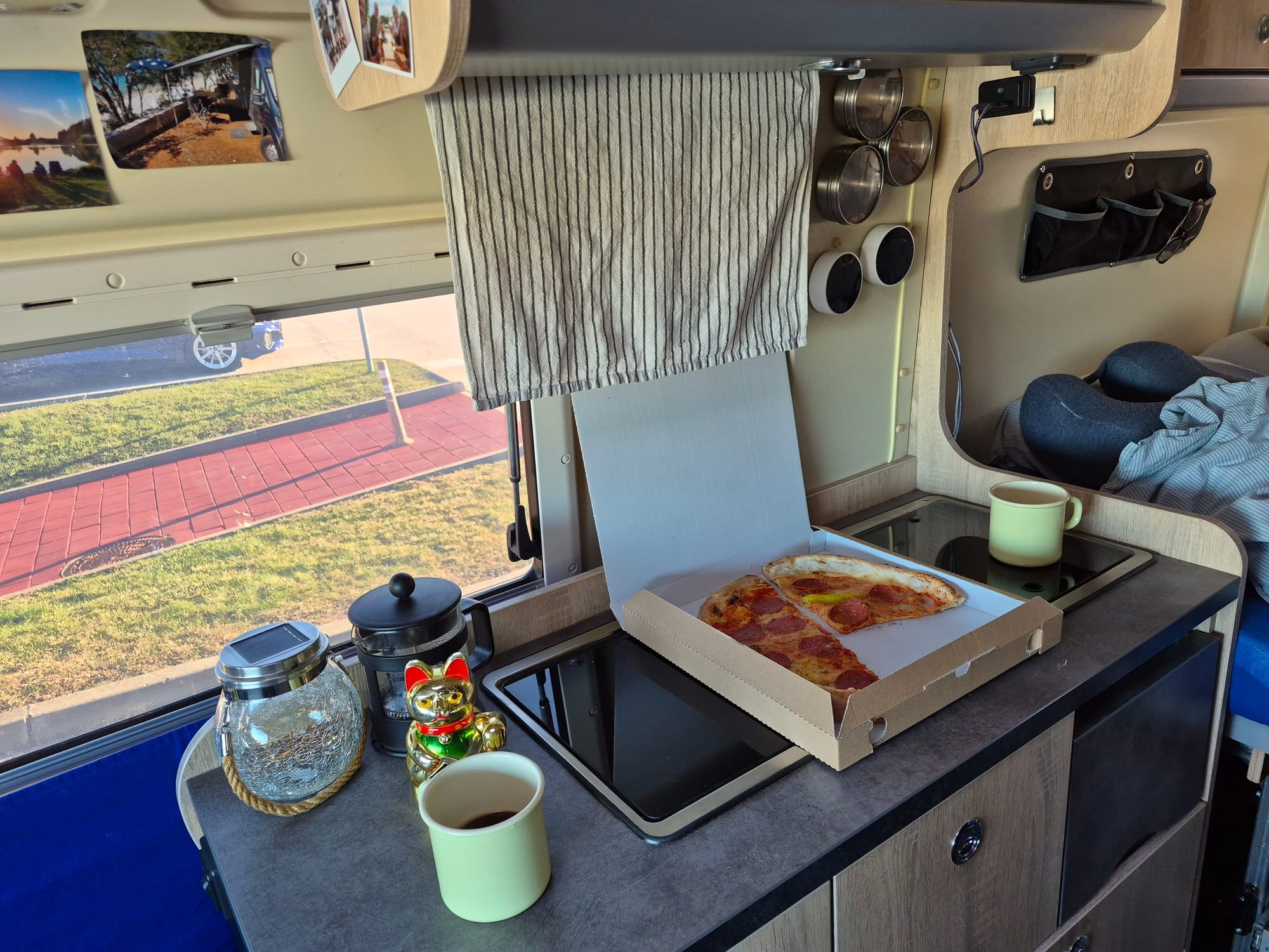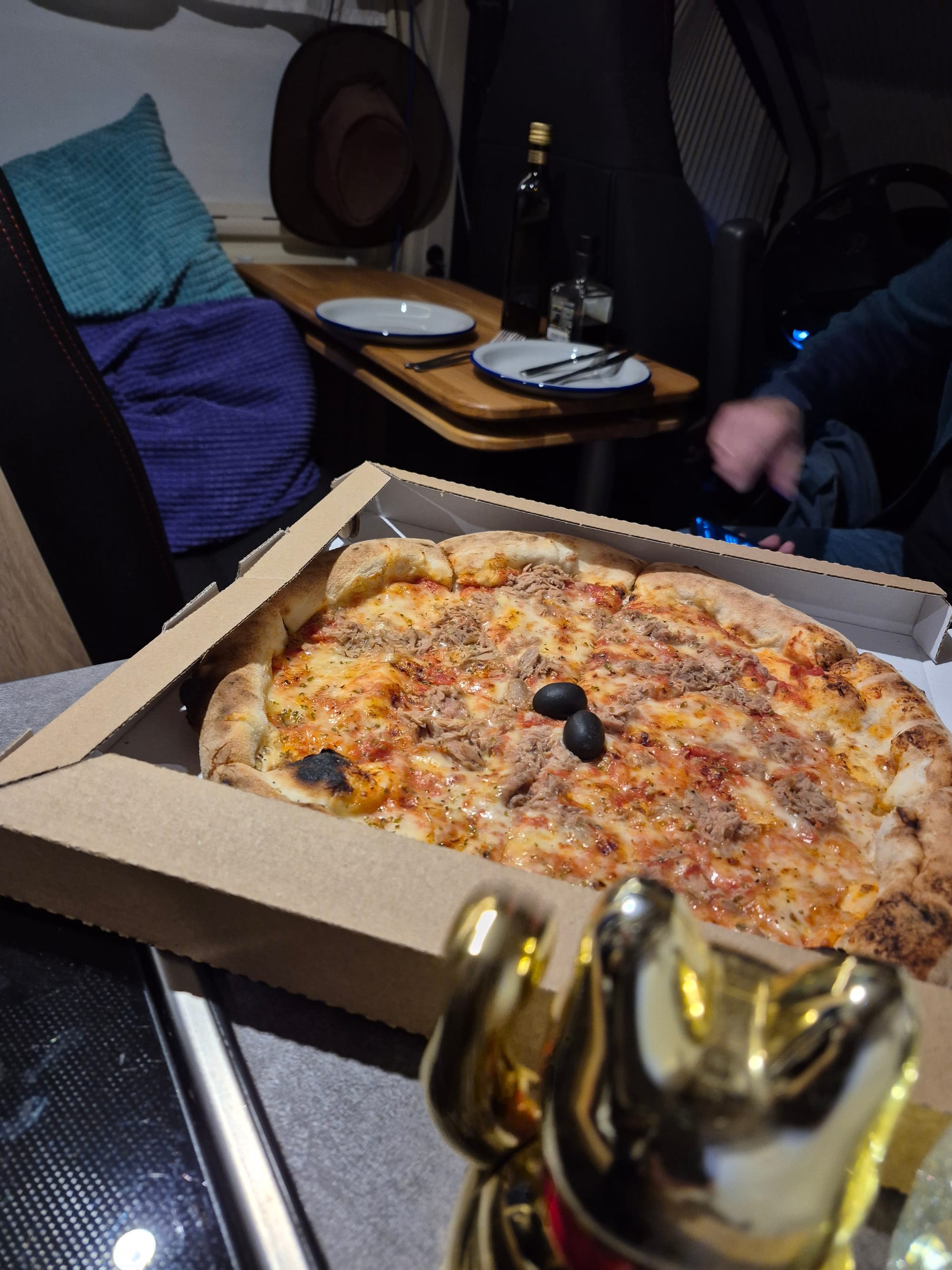 Der hat heute allerdings eine geschlossene Gesellschaft. Wir können aber eine Pizza mitnehmen und warten wieder auf dem Angestellten-Tisch darauf.