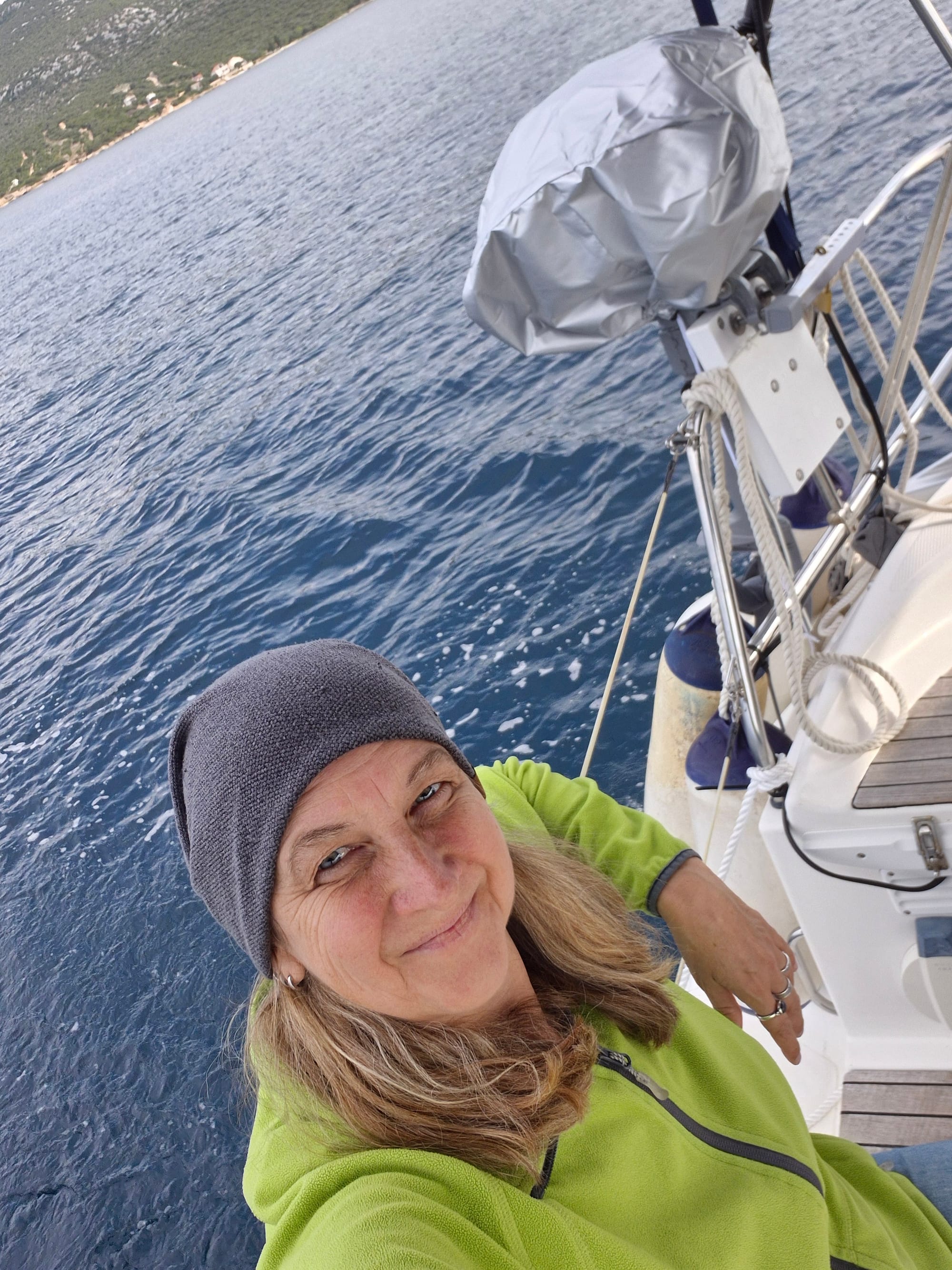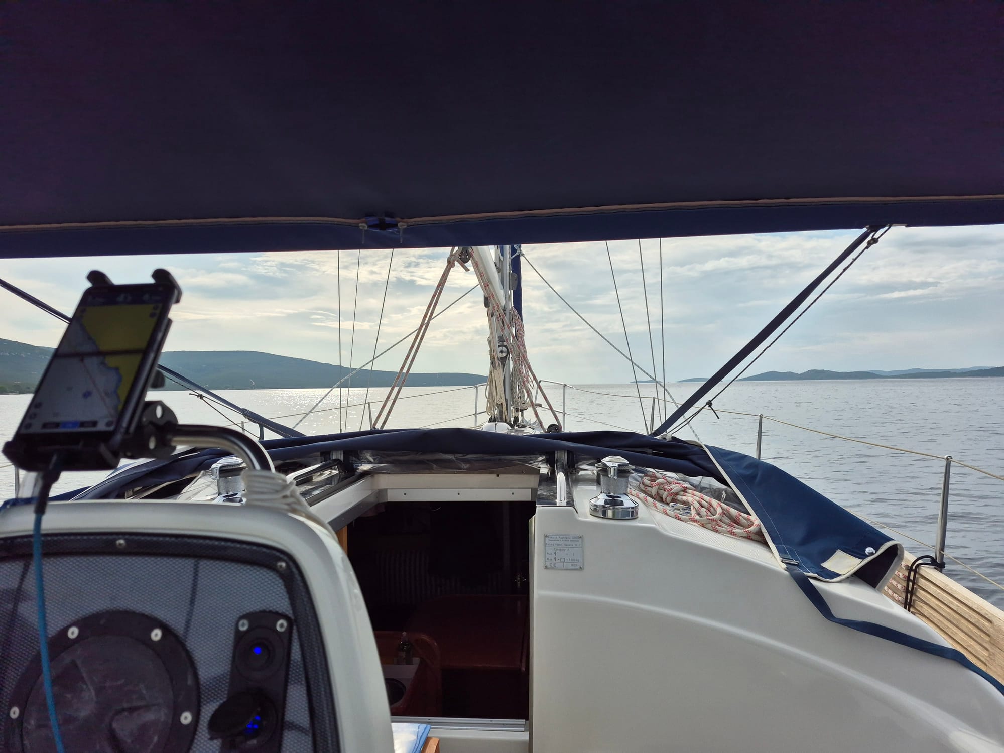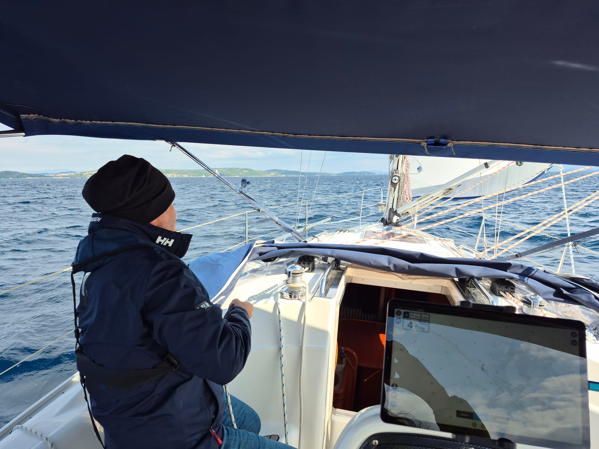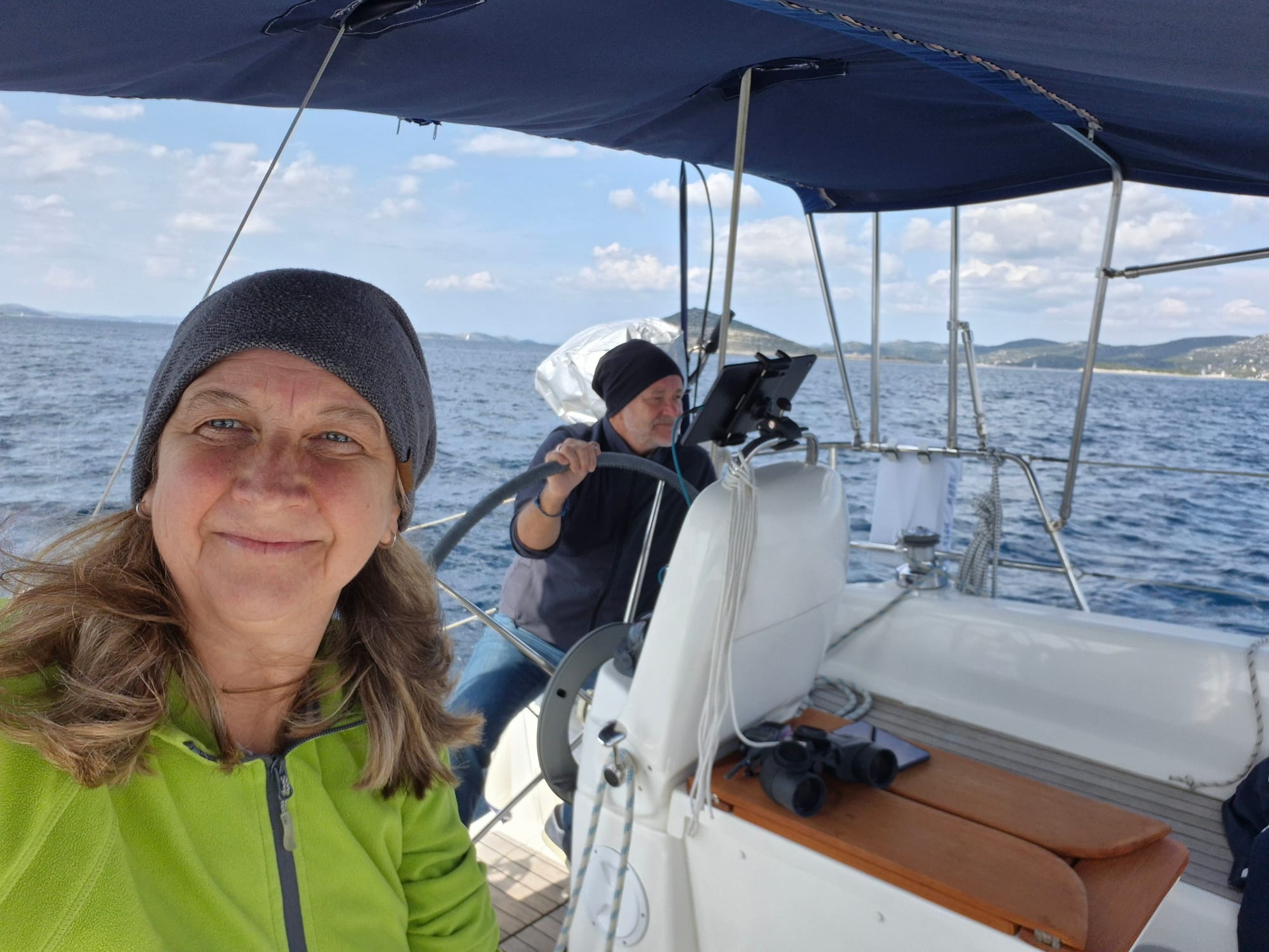 Der Wind frischt auf, jetzt haben wir 25 Knoten Wind, gegen 19:00 ist es finster und nur die Mondsichel leuchtet uns ein bisschen den Weg. Die Life und die Imagine kreuzen Richtung Tribunj, den direkten Weg gibt's bei dem Wind nicht 😄. Von der Imagine sieht man immer nur die Beleuchtung, Rot, Weiß, Grün, je nachdem in welche Richtung sie sich zu uns oder von uns weg bewegt.