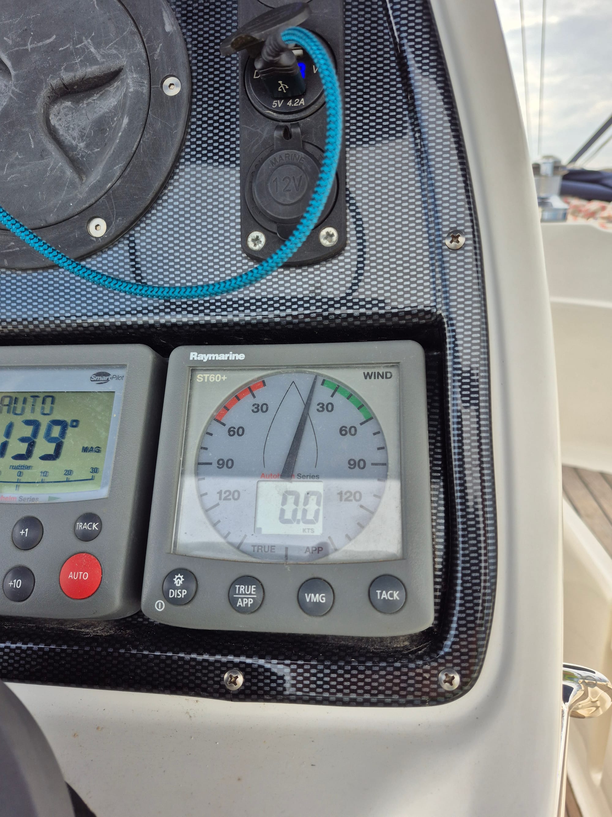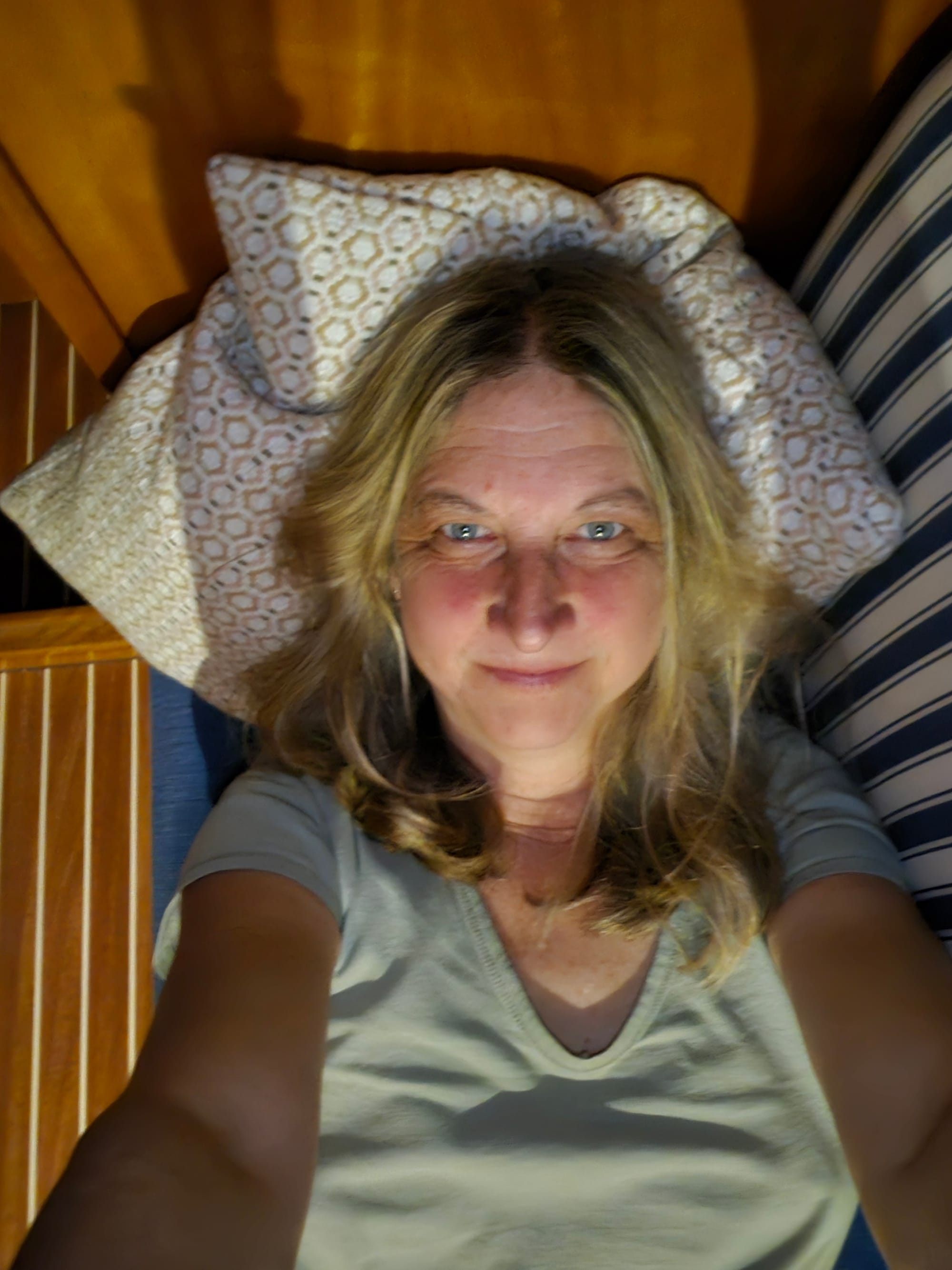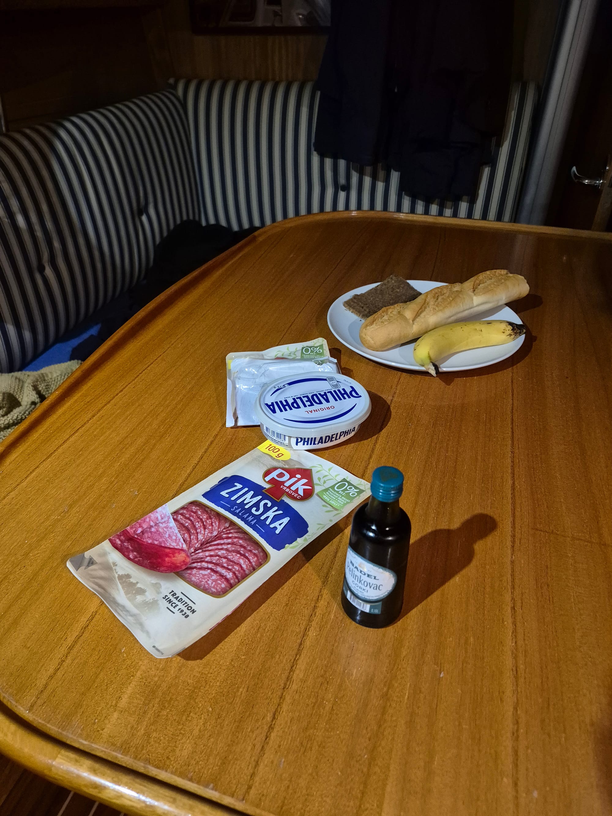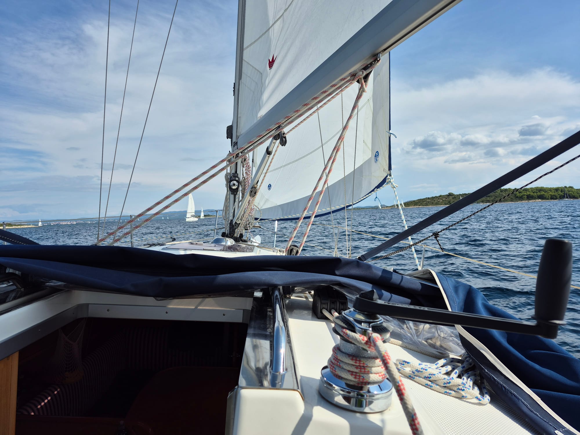 Der Wind frischt auf, jetzt haben wir 25 Knoten Wind, gegen 19:00 ist es finster und nur die Mondsichel leuchtet uns ein bisschen den Weg. Die Life und die Imagine kreuzen Richtung Tribunj, den direkten Weg gibt's bei dem Wind nicht 😄. Von der Imagine sieht man immer nur die Beleuchtung, Rot, Weiß, Grün, je nachdem in welche Richtung sie sich zu uns oder von uns weg bewegt.