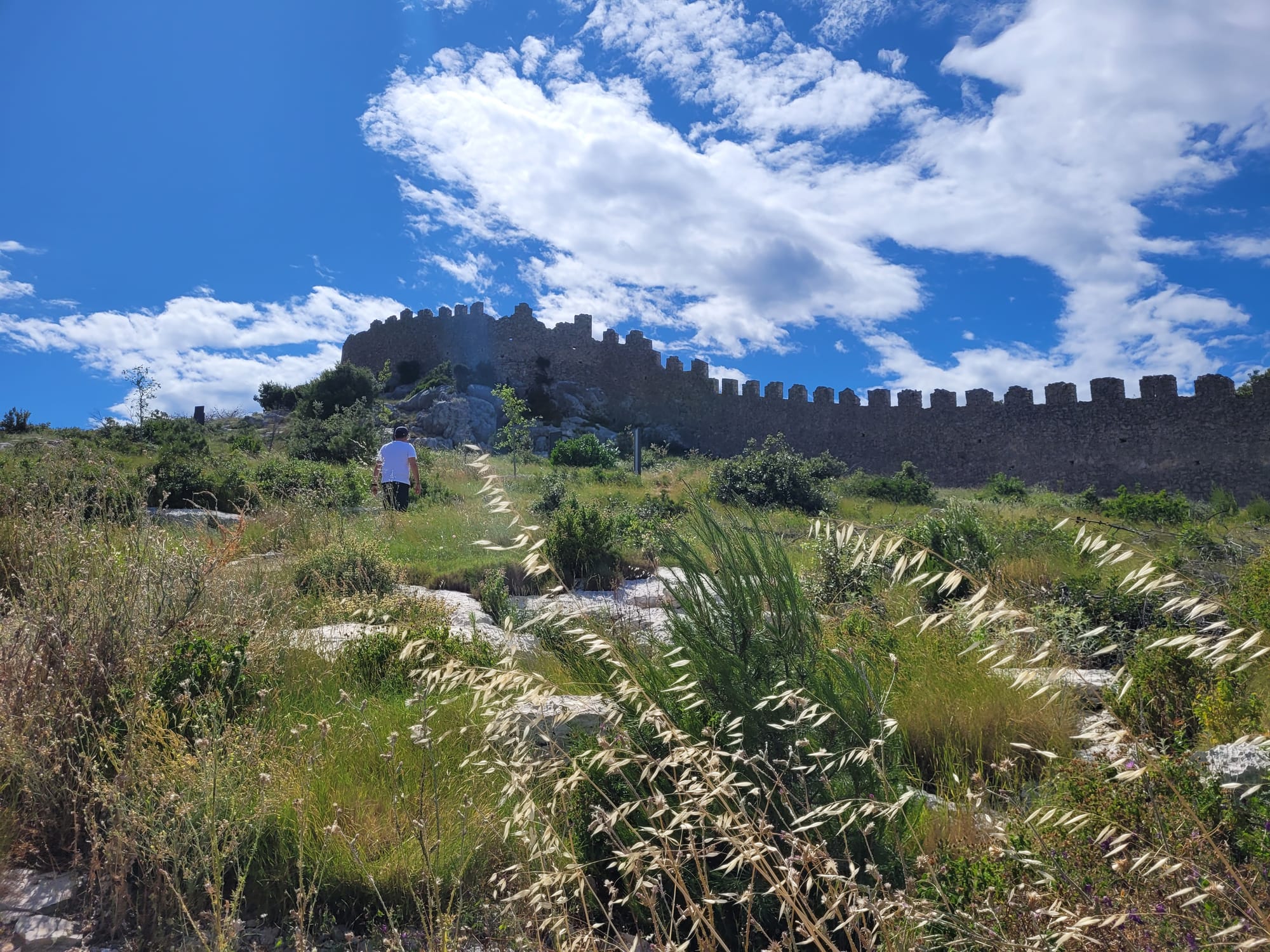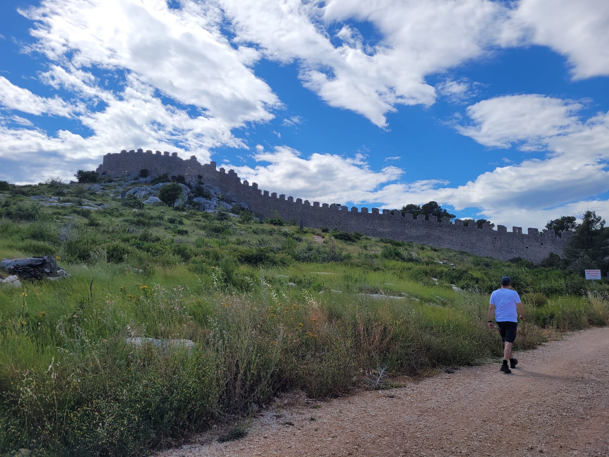 Dort angekommen steigen wir den Hügel, die Mauer entlang, hoch.