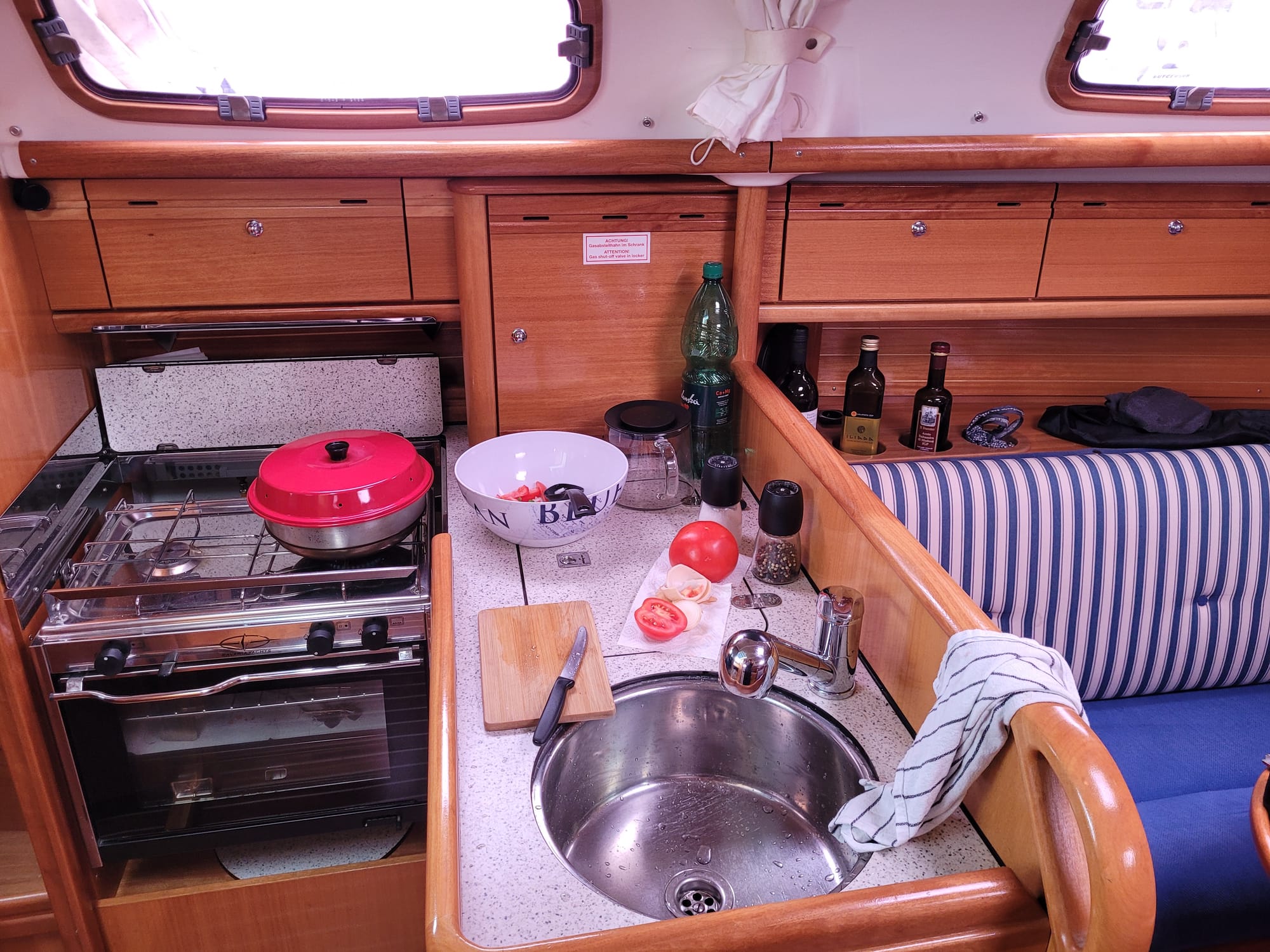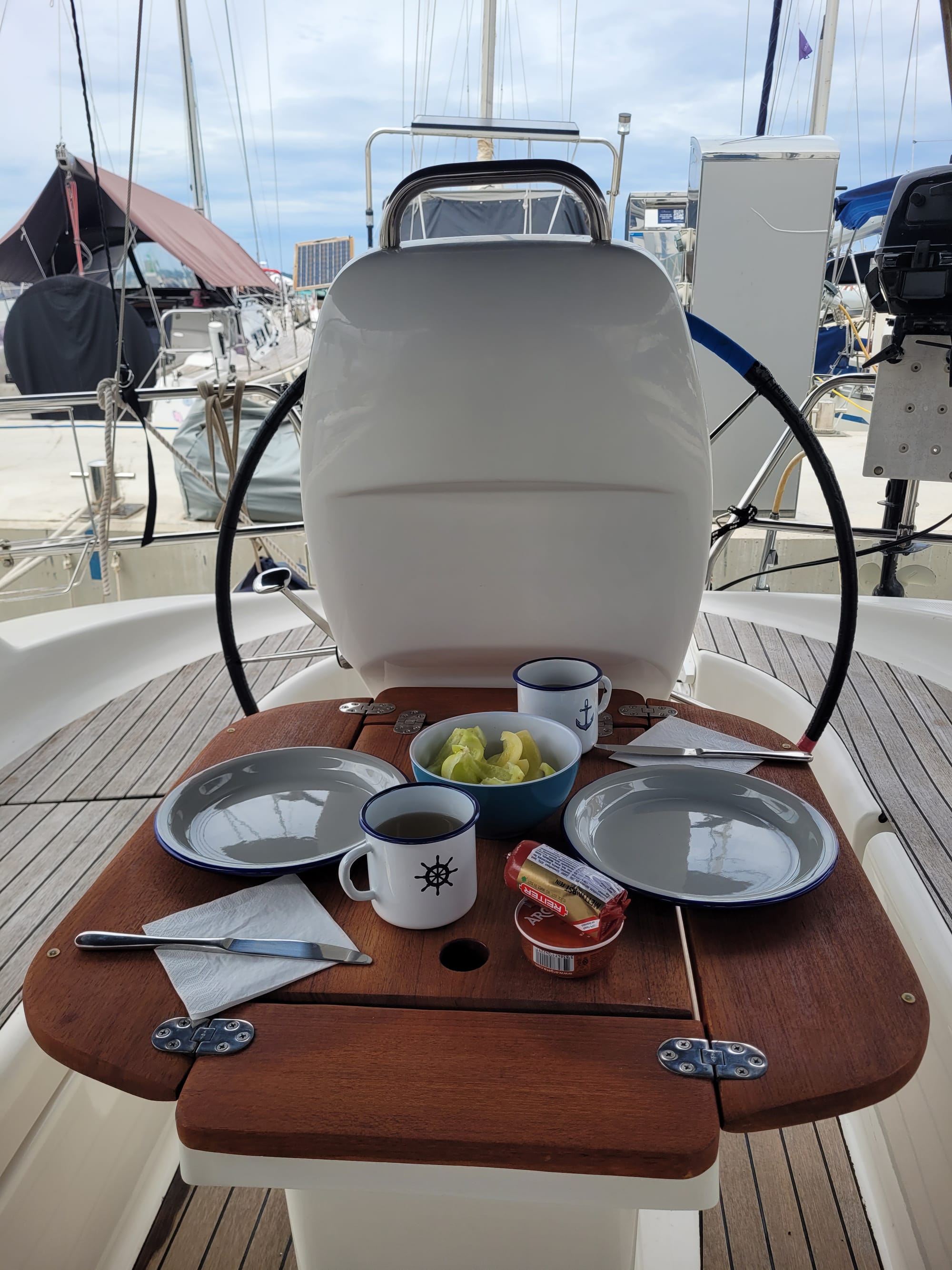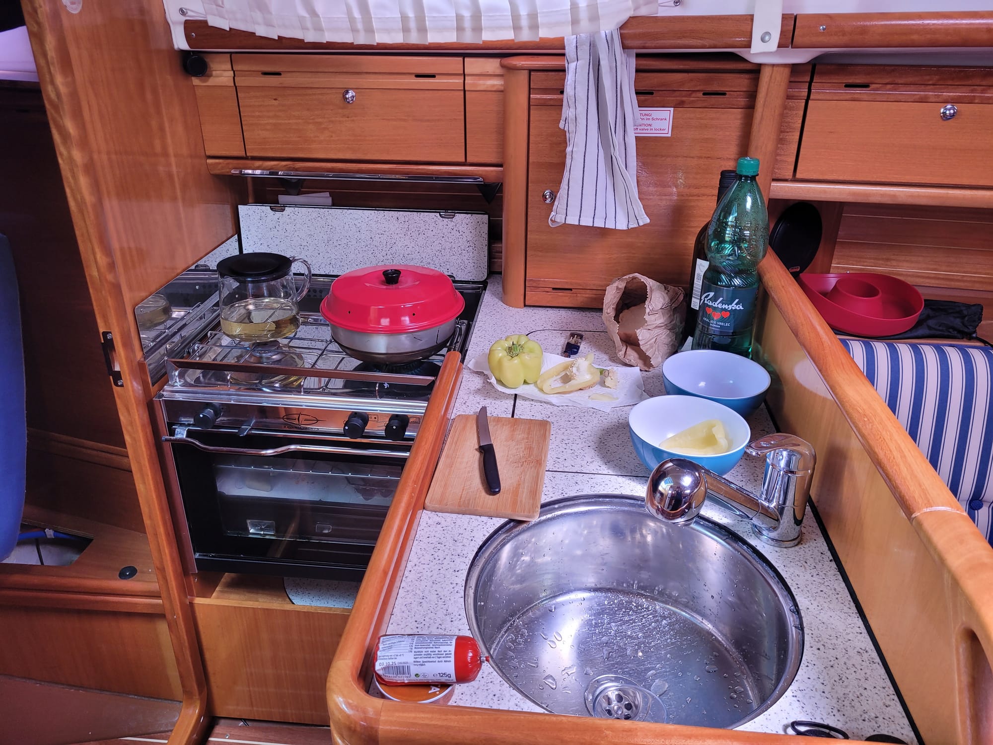 Jetzt beginnen wir so langsam immer mehr Utensilien vom Luigi auf das Segelboot zu tragen. Als erstes gibt es einmal ein Frühstück. Und der Omnia kommt auch gleich zum Einsatz.