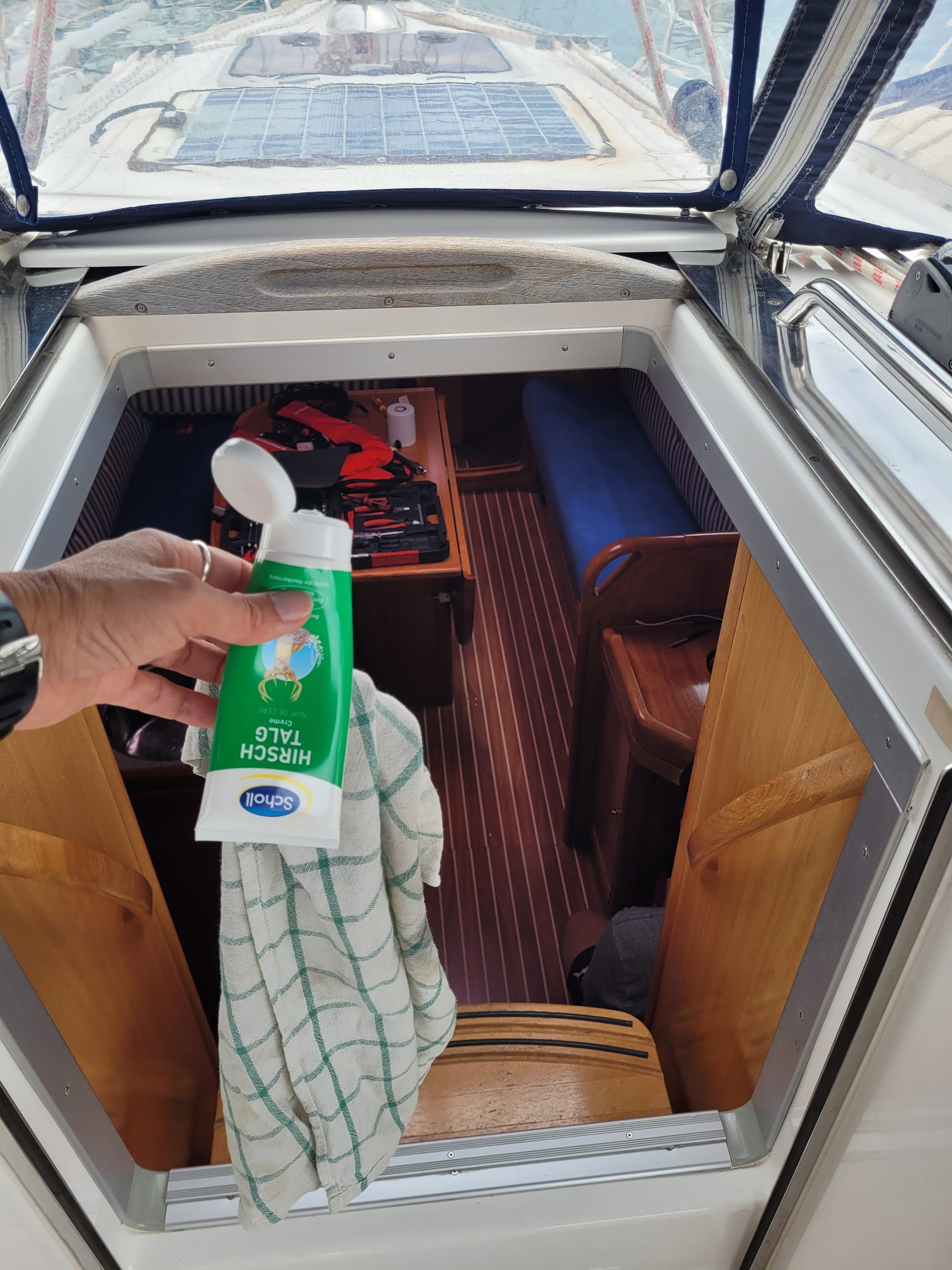 Und dann geht's an die Arbeit. Ich bekomme den Auftrag die Dichtungen aller Fenster zu säubern und einzufetten.