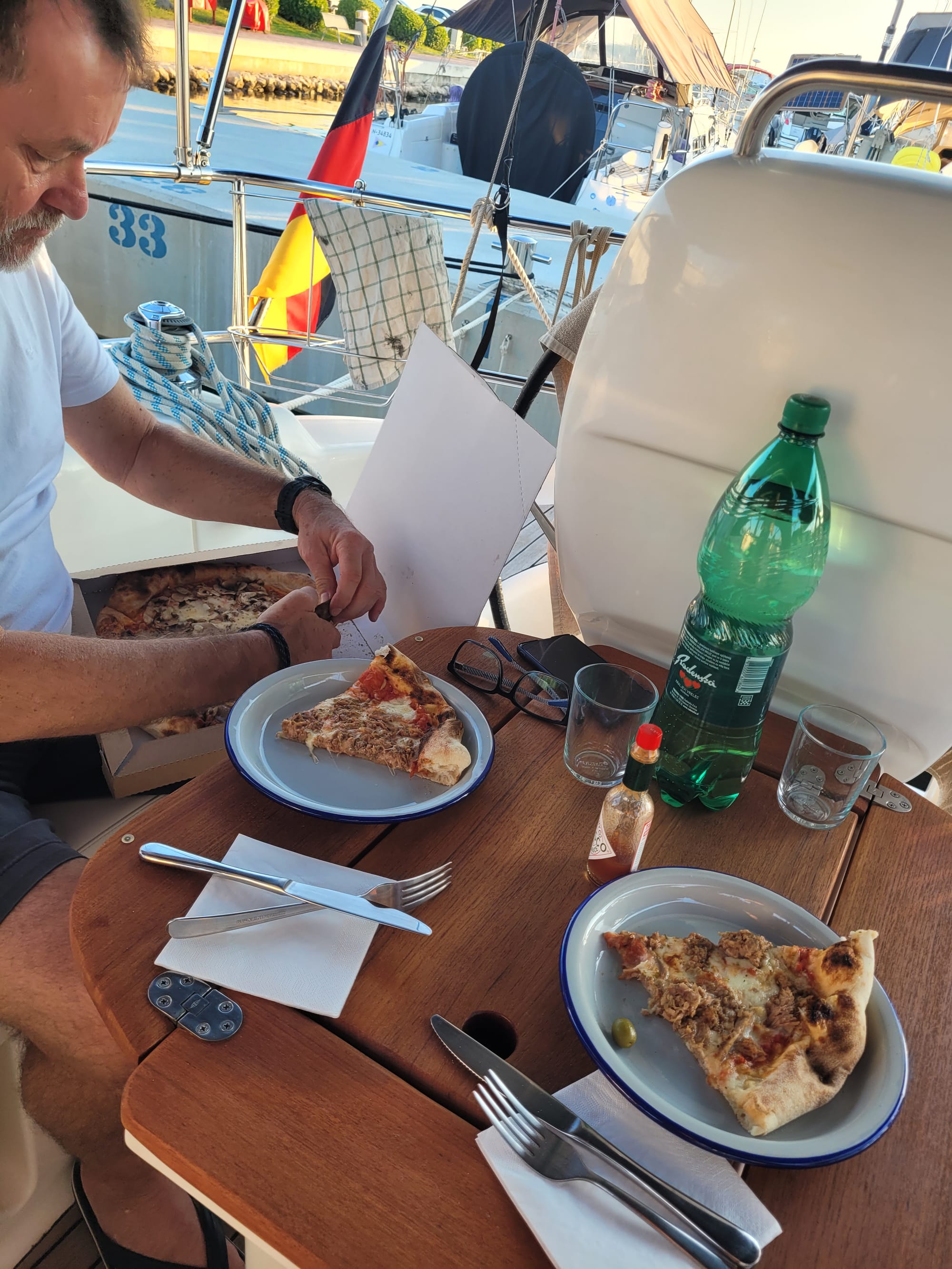 Jetzt mag ich nicht mehr kochen und Andreas will eine Pizza. Wir beschließen zum Marina Restaurant zu gehen obwohl es da wahrscheinlich keine geben wird. Wir machen uns schon auf den Weg da kommt Karl zu uns und fragt ob er uns Pizzen mitnehmen soll, weil er jetzt welche mit dem Auto holt. Juhu - unsere Rettung. 🤗