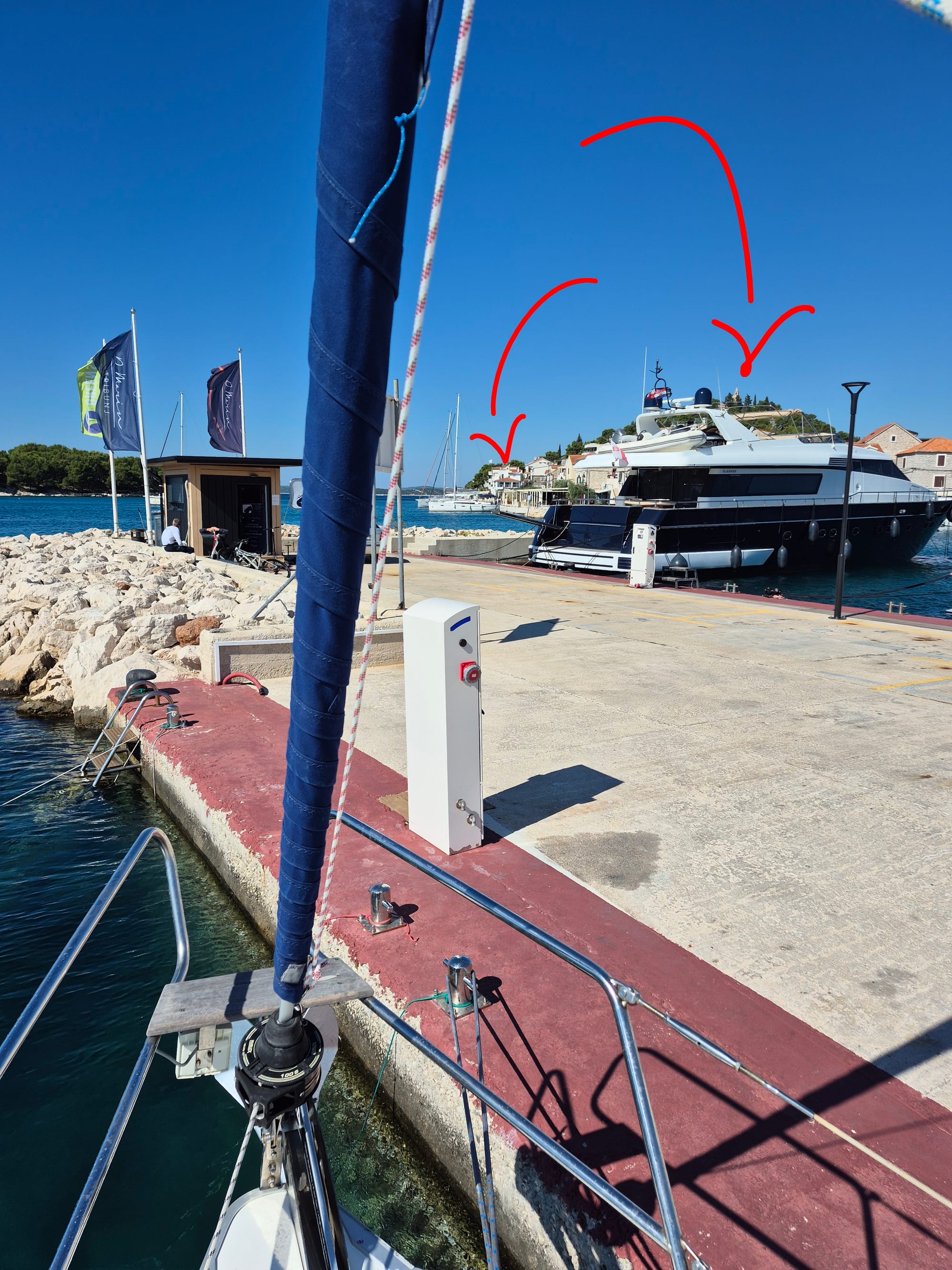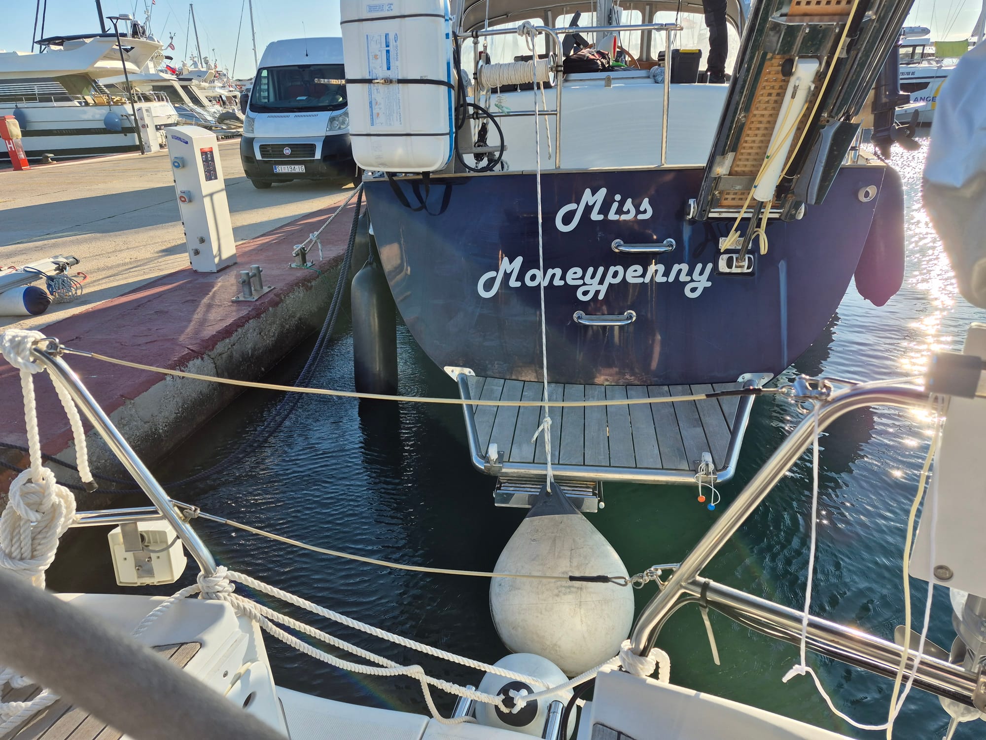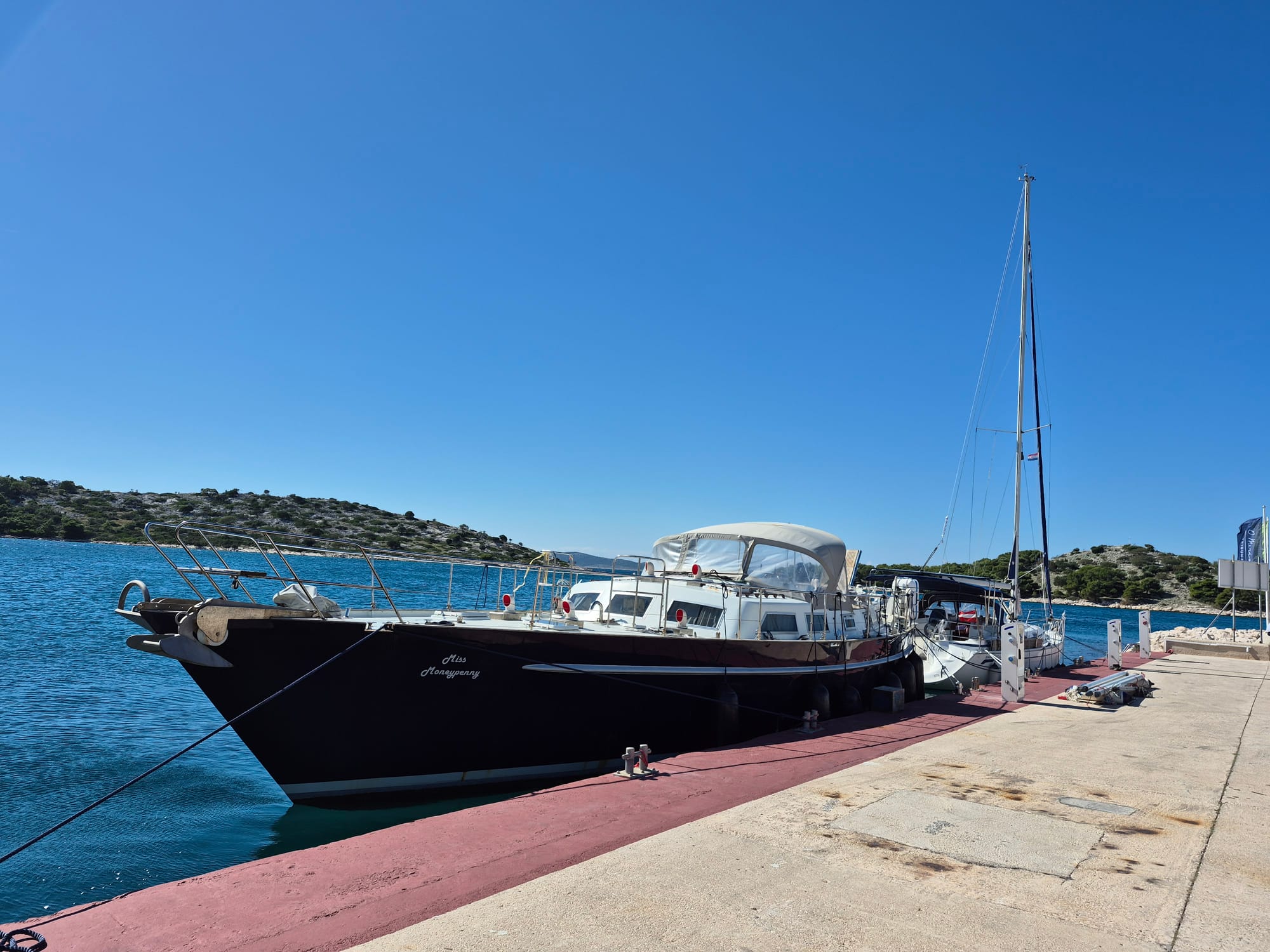 In der Früh legt sich ein großes Stahlsegelschiff vor uns hin, ganz schön eng aber die kroatische Crew ist gut drauf. Die Miss Moneypenny ist unsere neue Nachbarin. Gegen ihren Kugelfender ist der der Life ein kleines Bällchen.