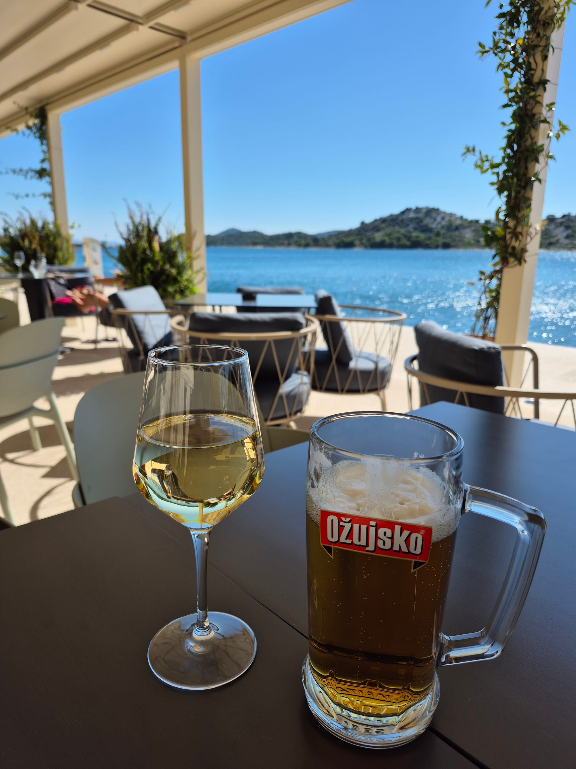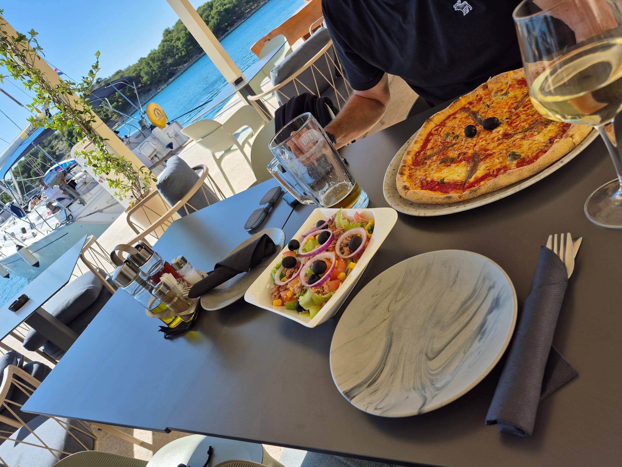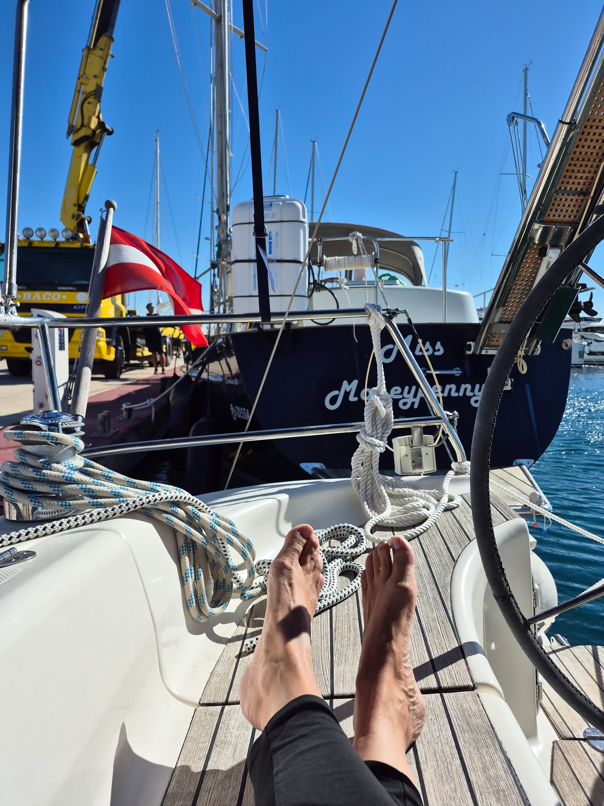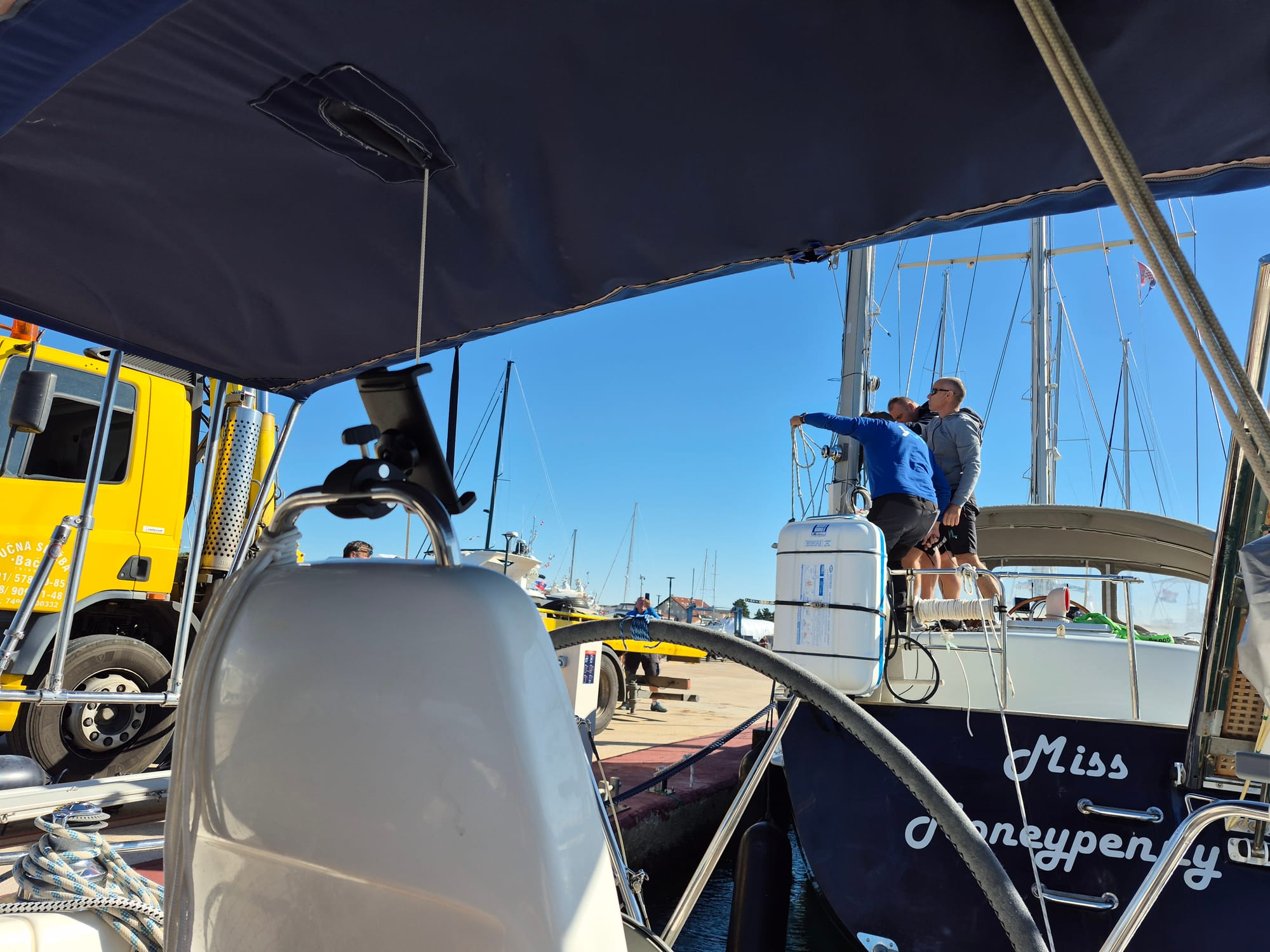 In der Früh legt sich ein großes Stahlsegelschiff vor uns hin, ganz schön eng aber die kroatische Crew ist gut drauf. Die Miss Moneypenny ist unsere neue Nachbarin. Gegen ihren Kugelfender ist der der Life ein kleines Bällchen.