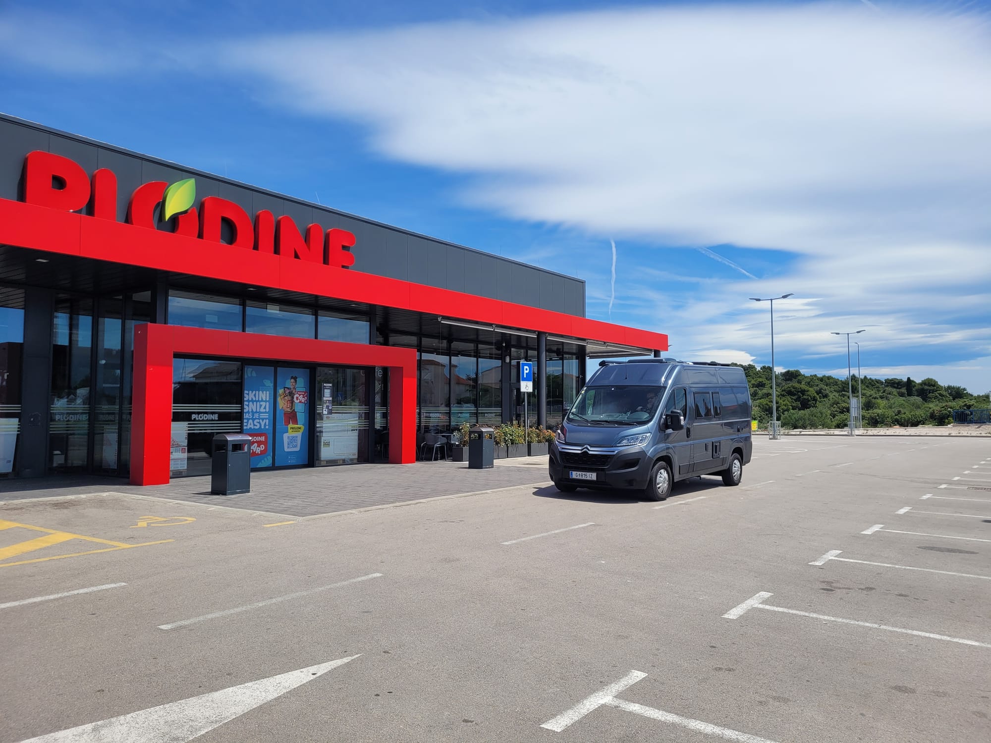 Unterwegs kommen wir bei einem Plodine vorbei, bei dem wir schon öfter eingekauft haben, also beschließen wir dort unsere Käufe zu erledigen.