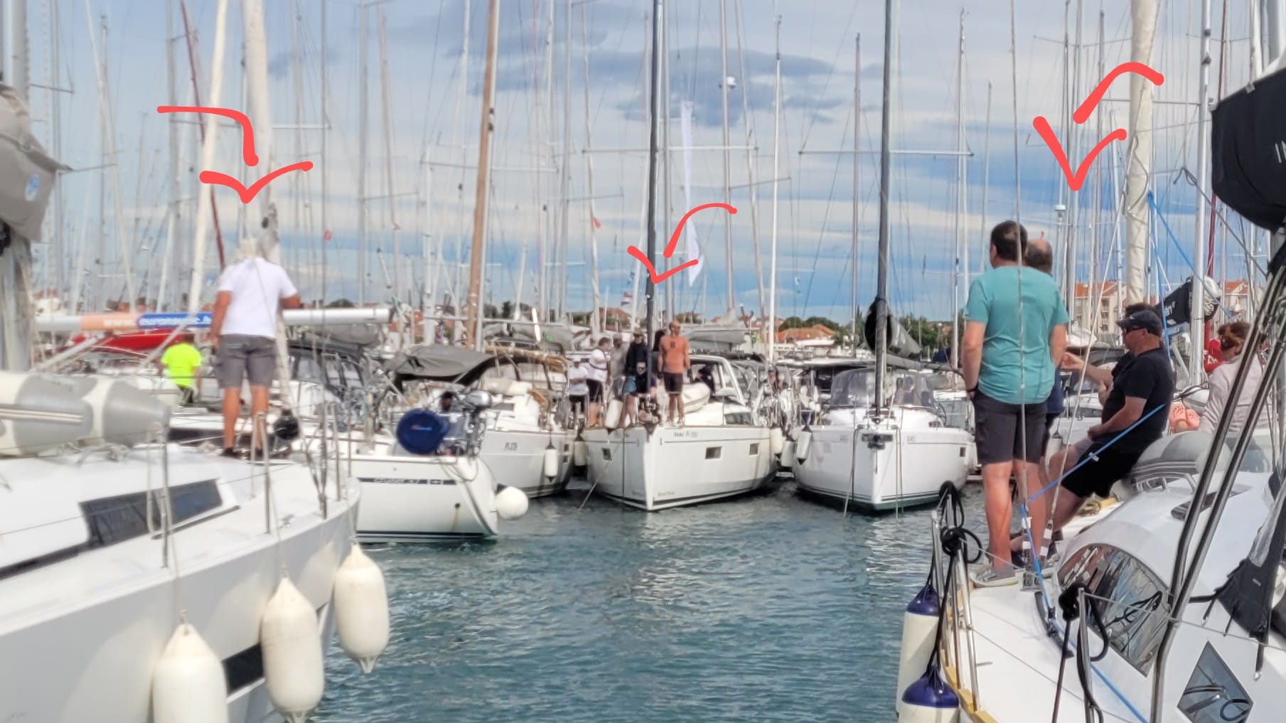 Immer wieder bleiben Schiffe in den Moorings der andere Boote hängen. Und das Hafenkino ist bestens besucht.