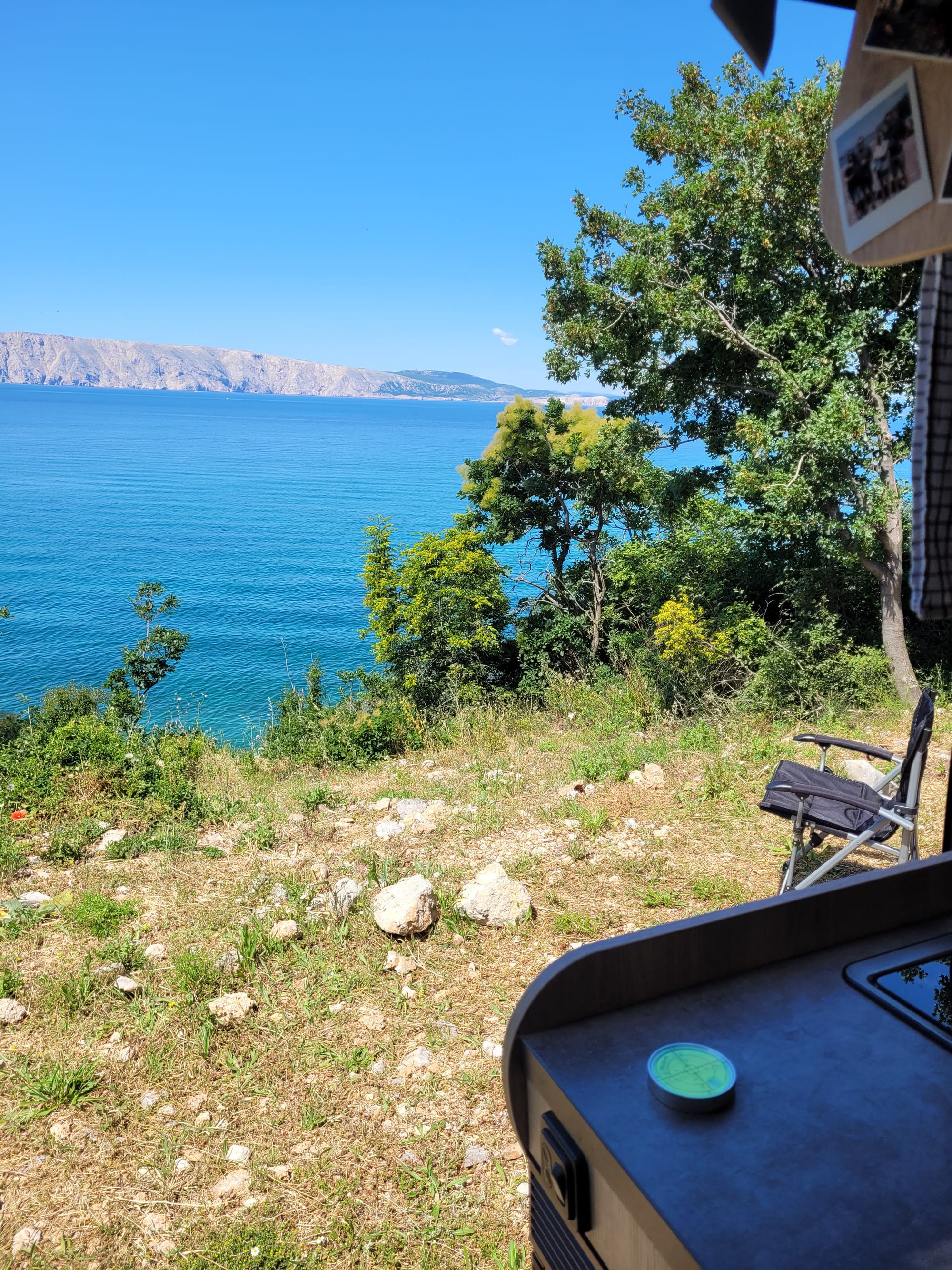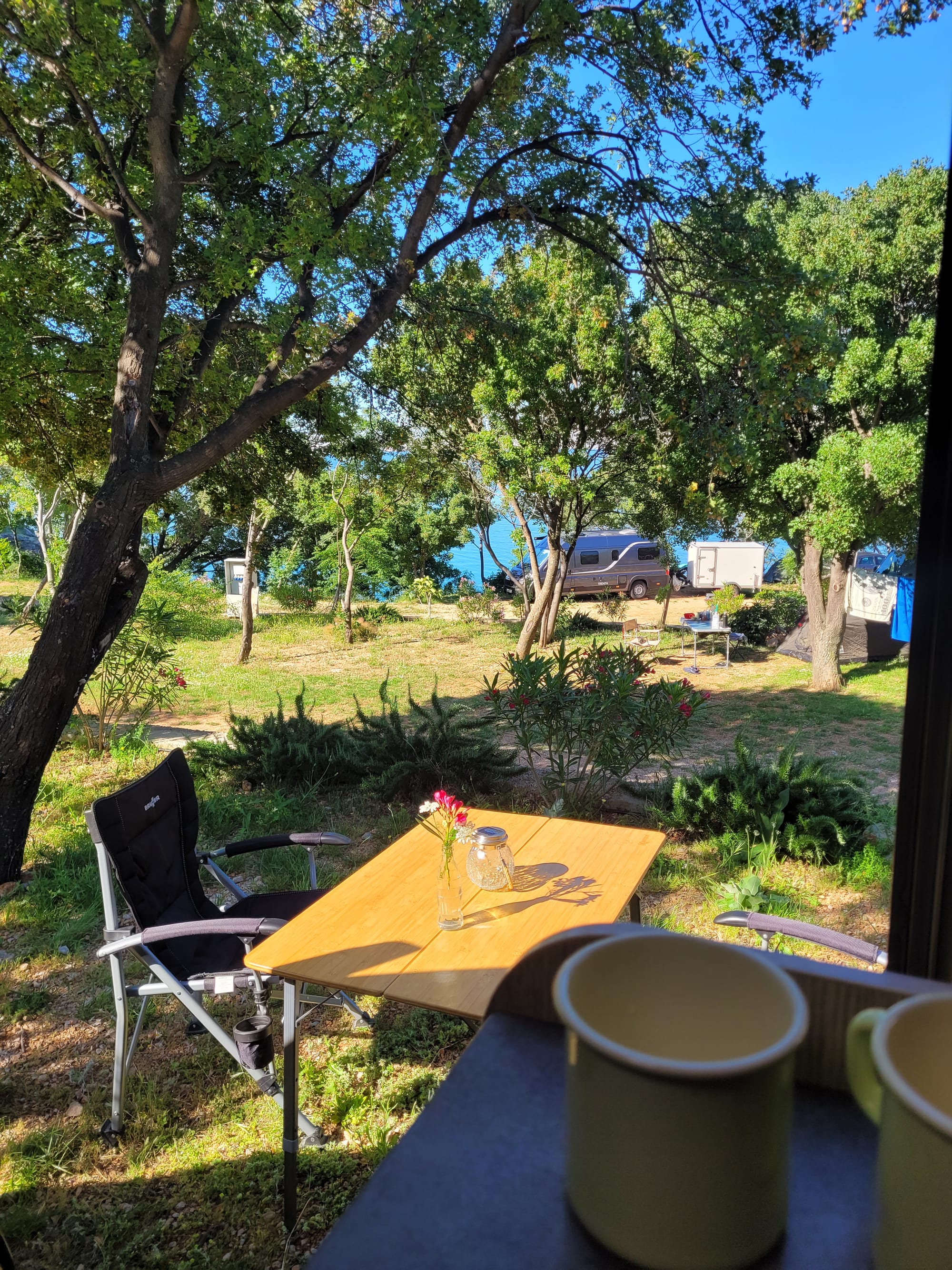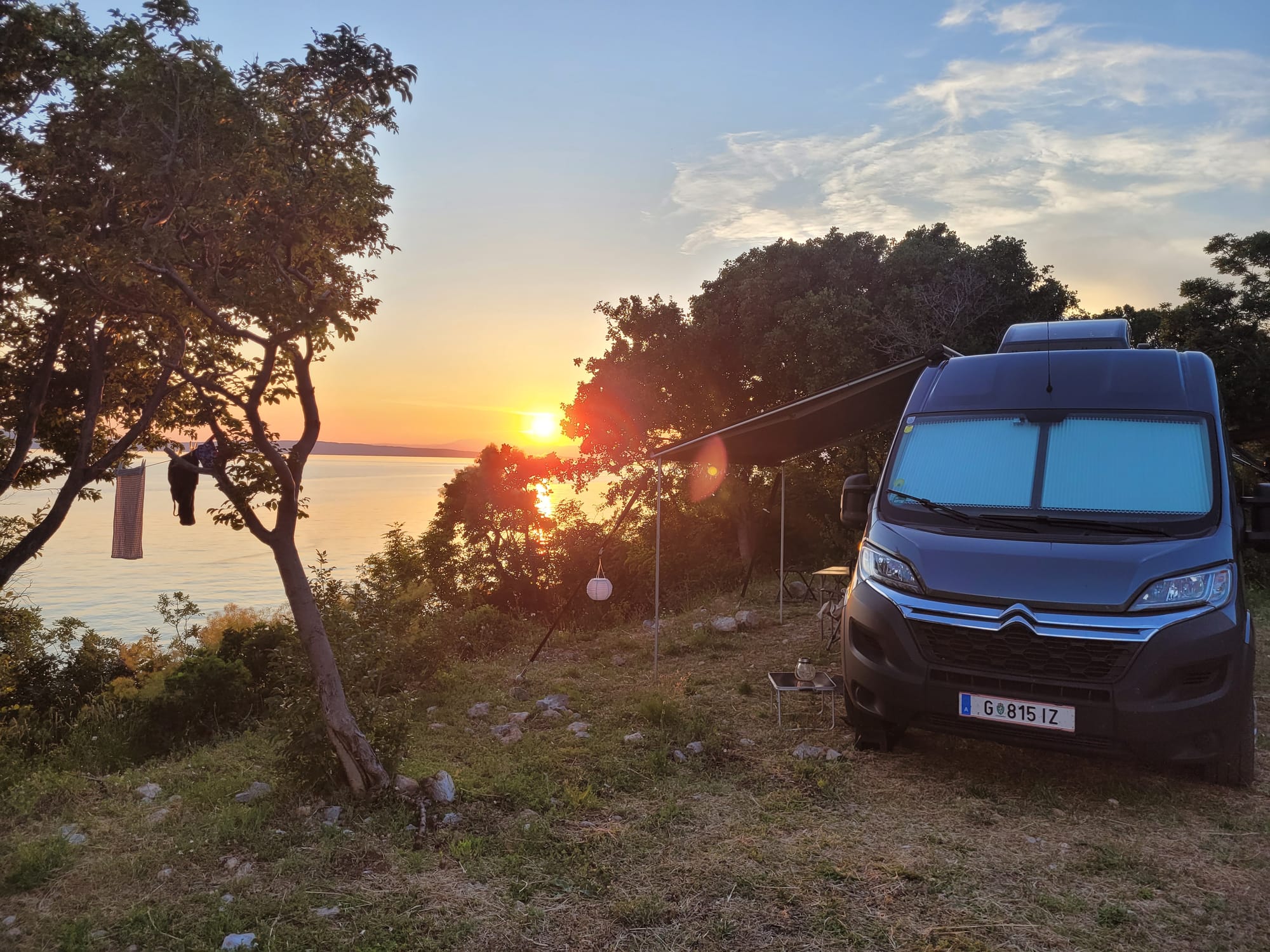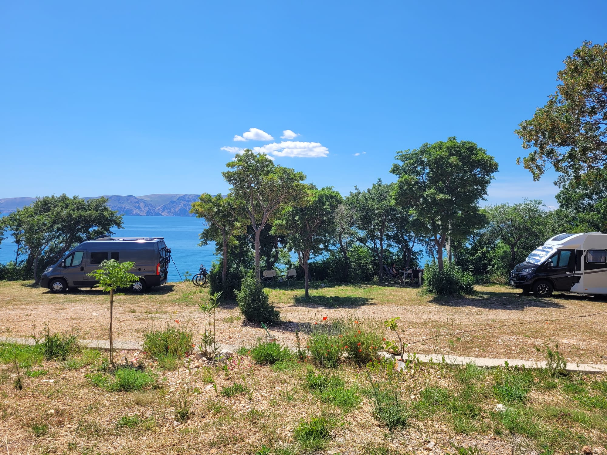 Nach dem Duschen kommt allerdings Wolfi zu uns und erzählt uns, dass sie jetzt den idealen Platz gefunden hätten. Hinter der Sanitäranlage geht der Campingplatz nämlich noch weiter und da kann man ganz alleine direkt am Meer stehen.