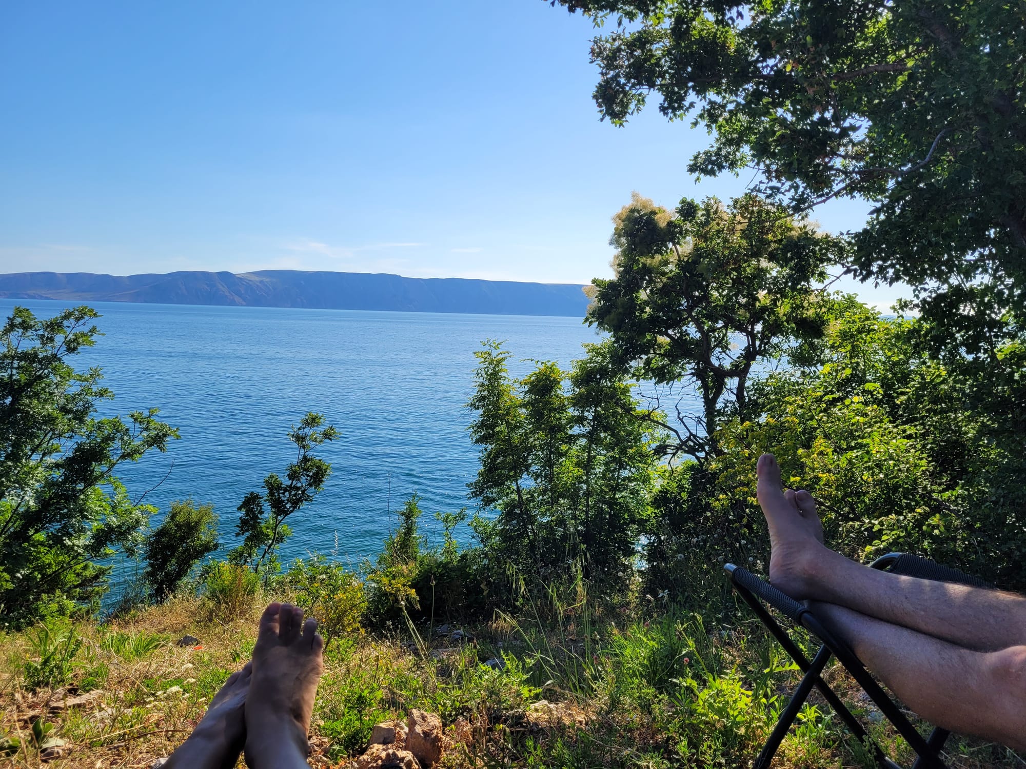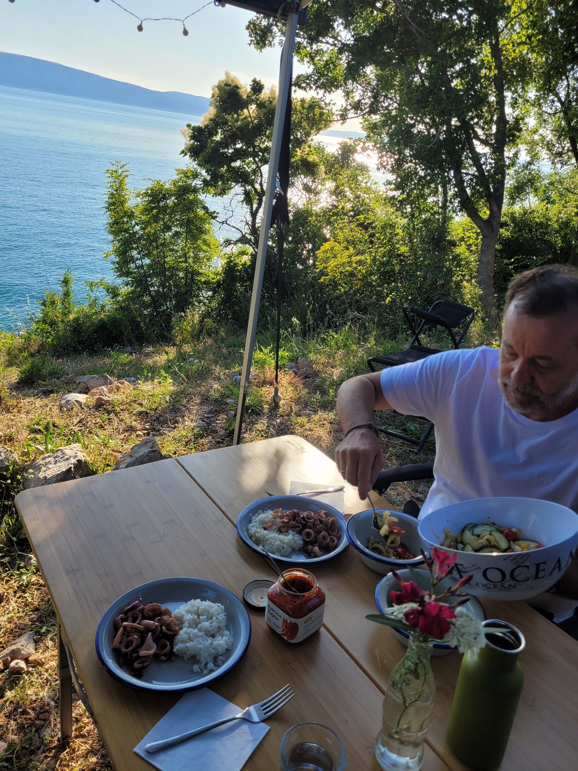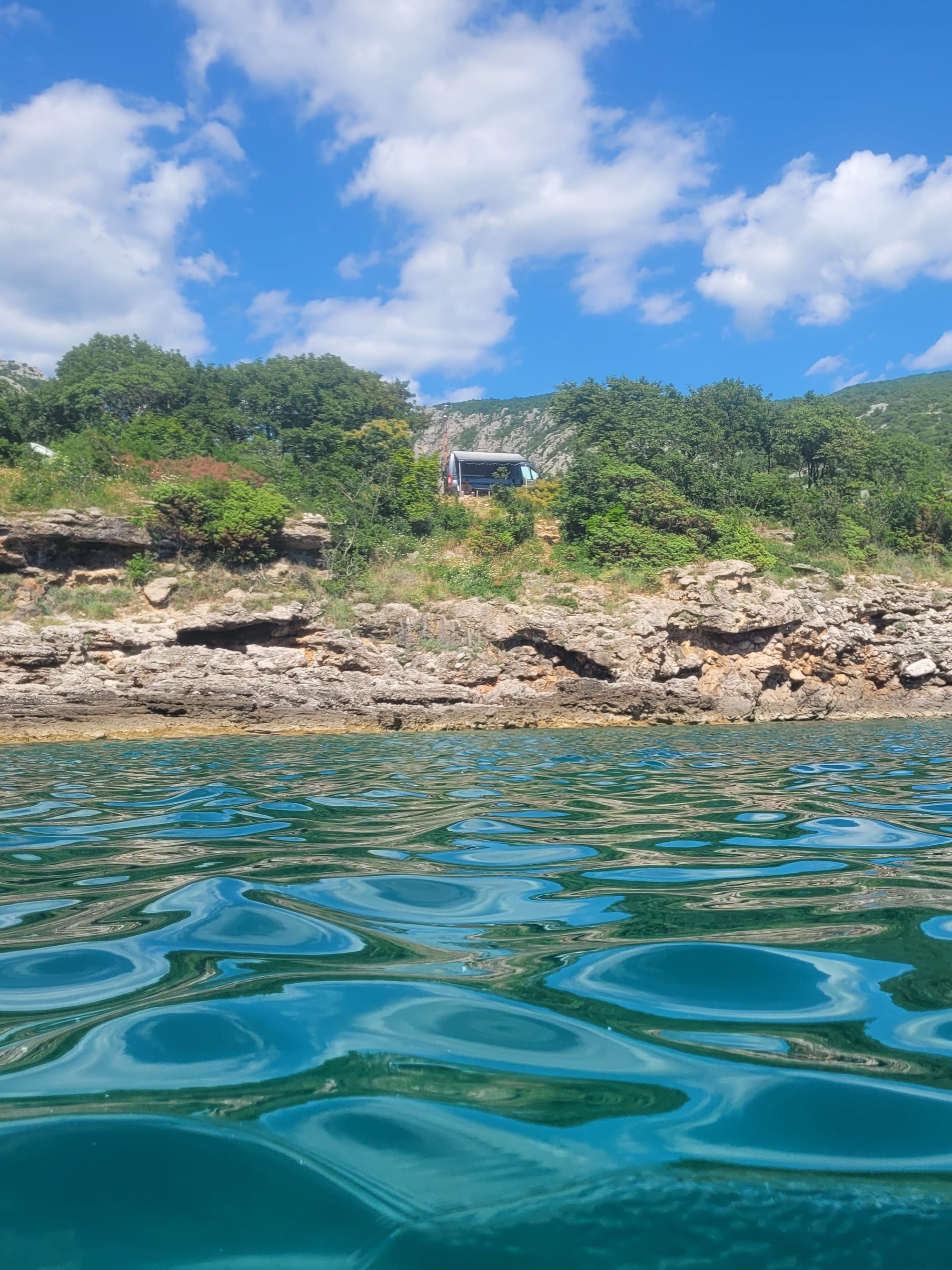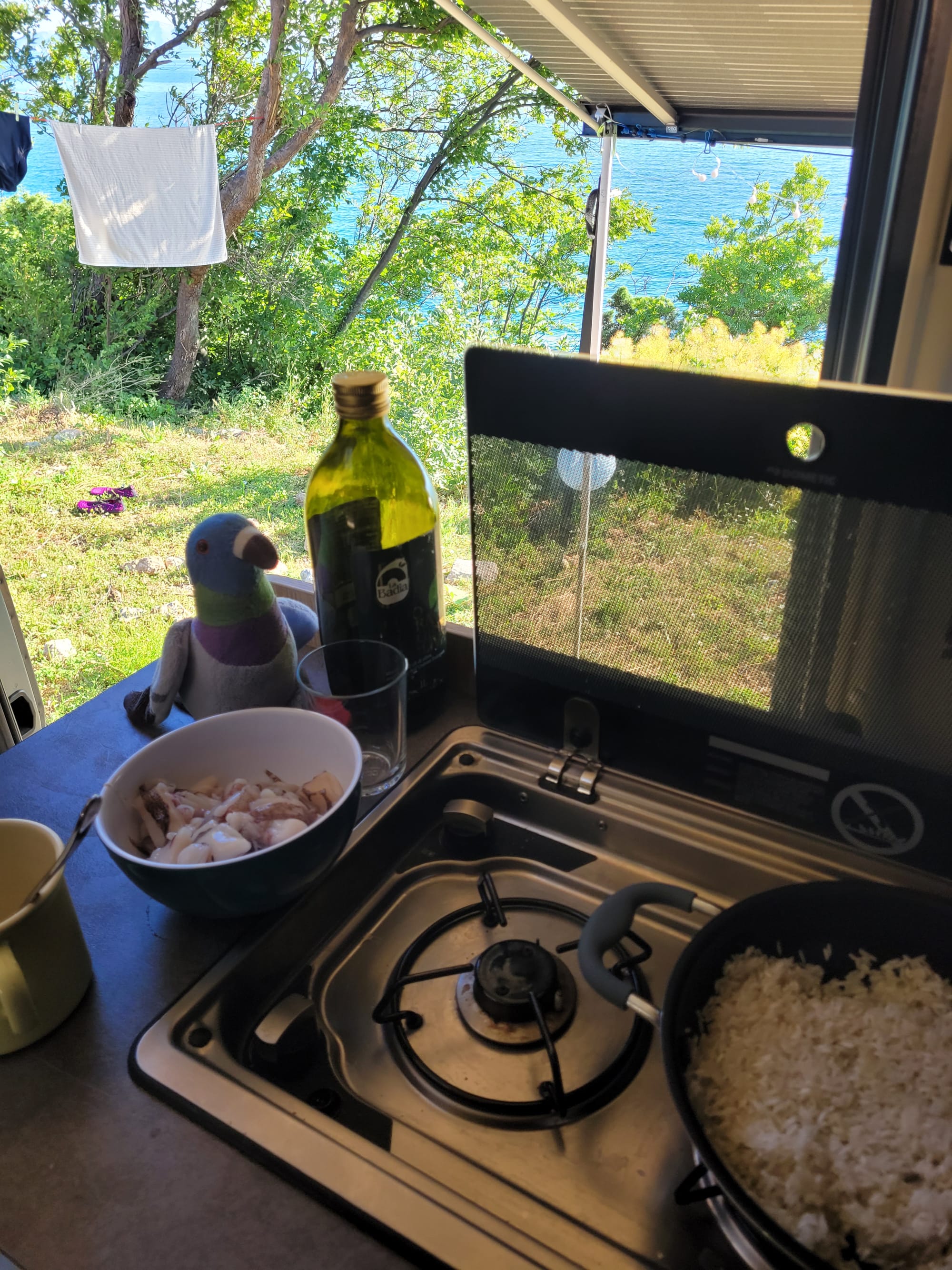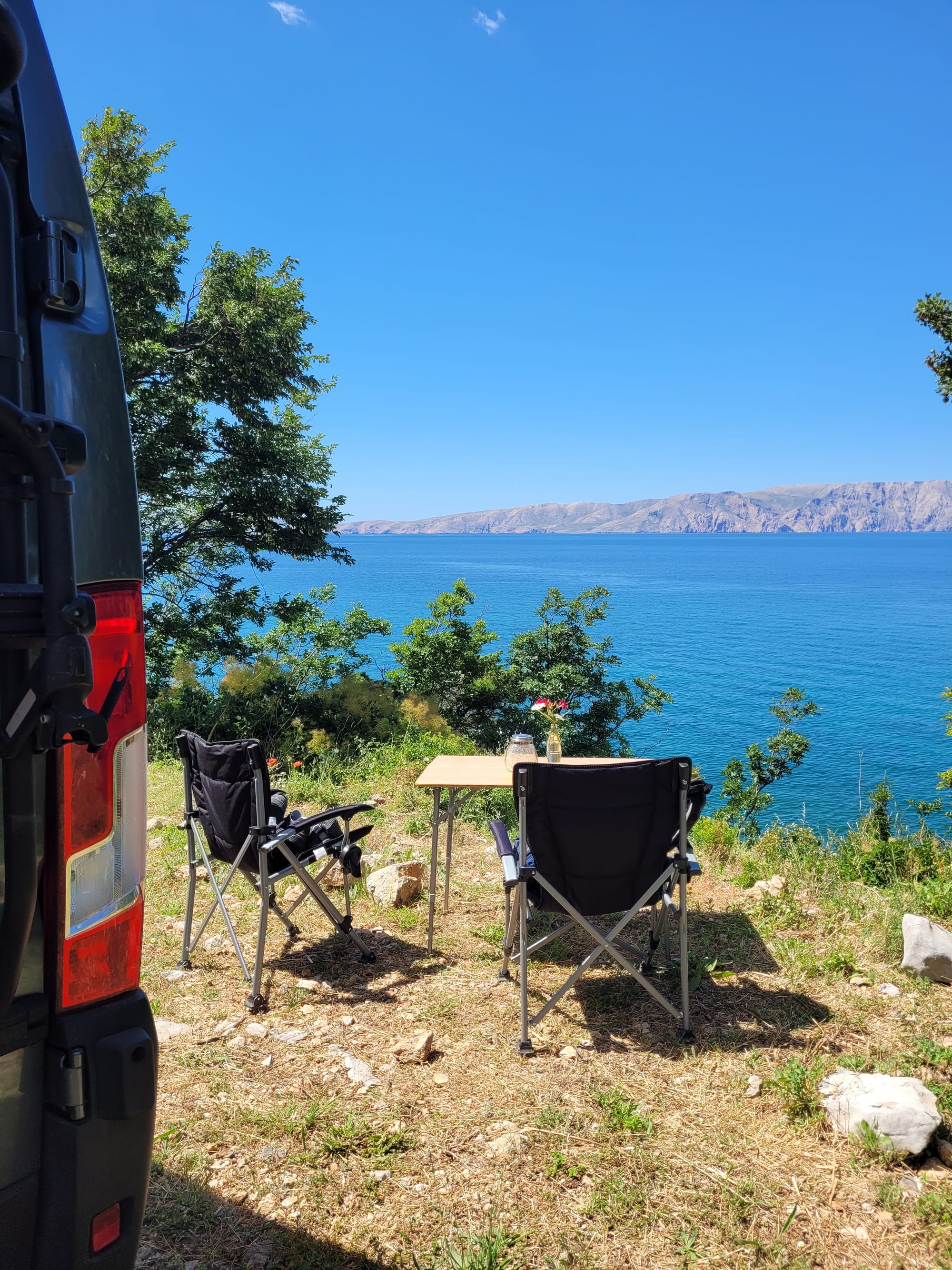Nach dem Duschen kommt allerdings Wolfi zu uns und erzählt uns, dass sie jetzt den idealen Platz gefunden hätten. Hinter der Sanitäranlage geht der Campingplatz nämlich noch weiter und da kann man ganz alleine direkt am Meer stehen.