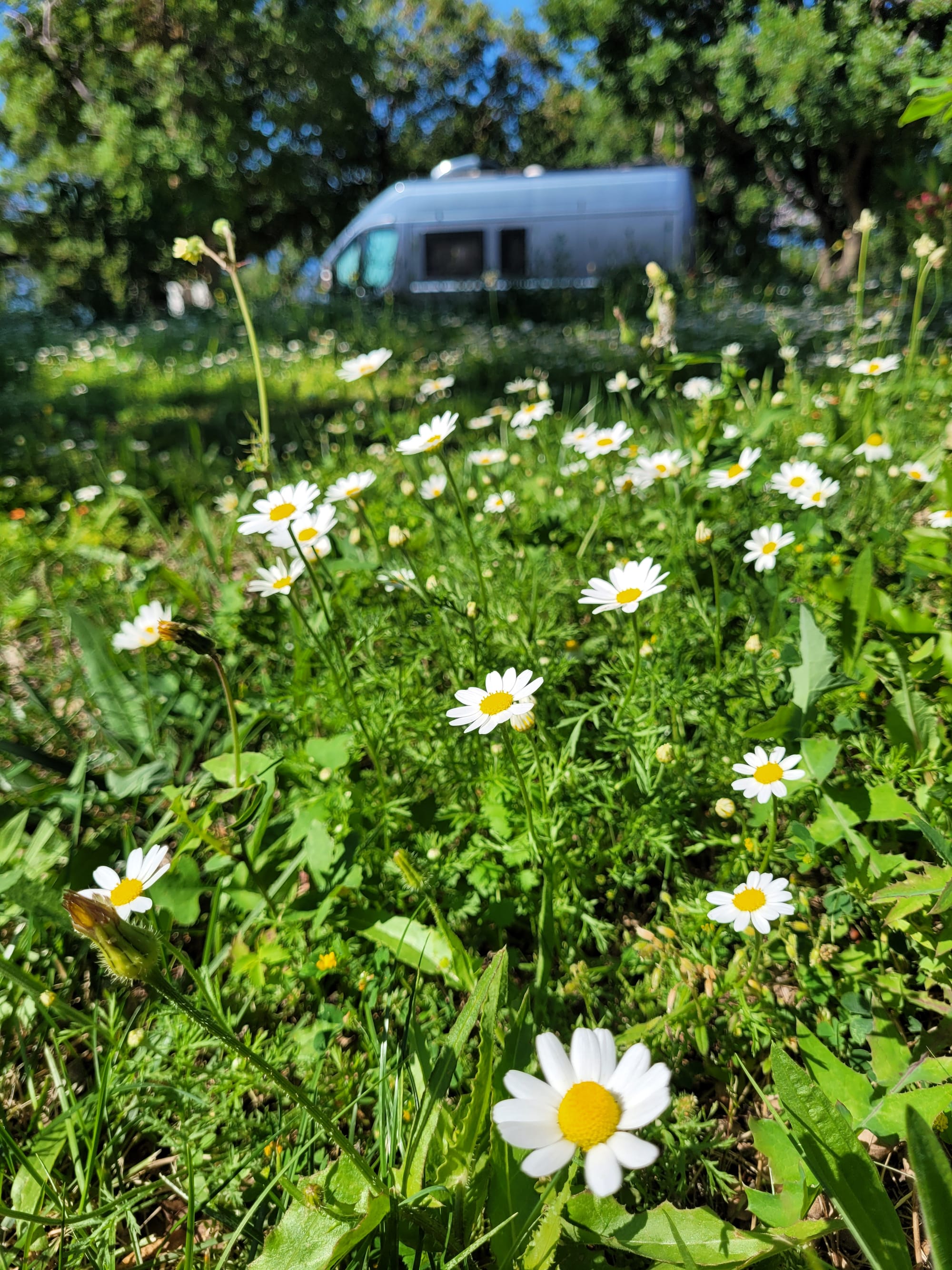 Wir stehen ein paar Reihen weiter weg vom Meer, haben dort aber unsere Ruhe und Schatten und sind umringt von Blumen.