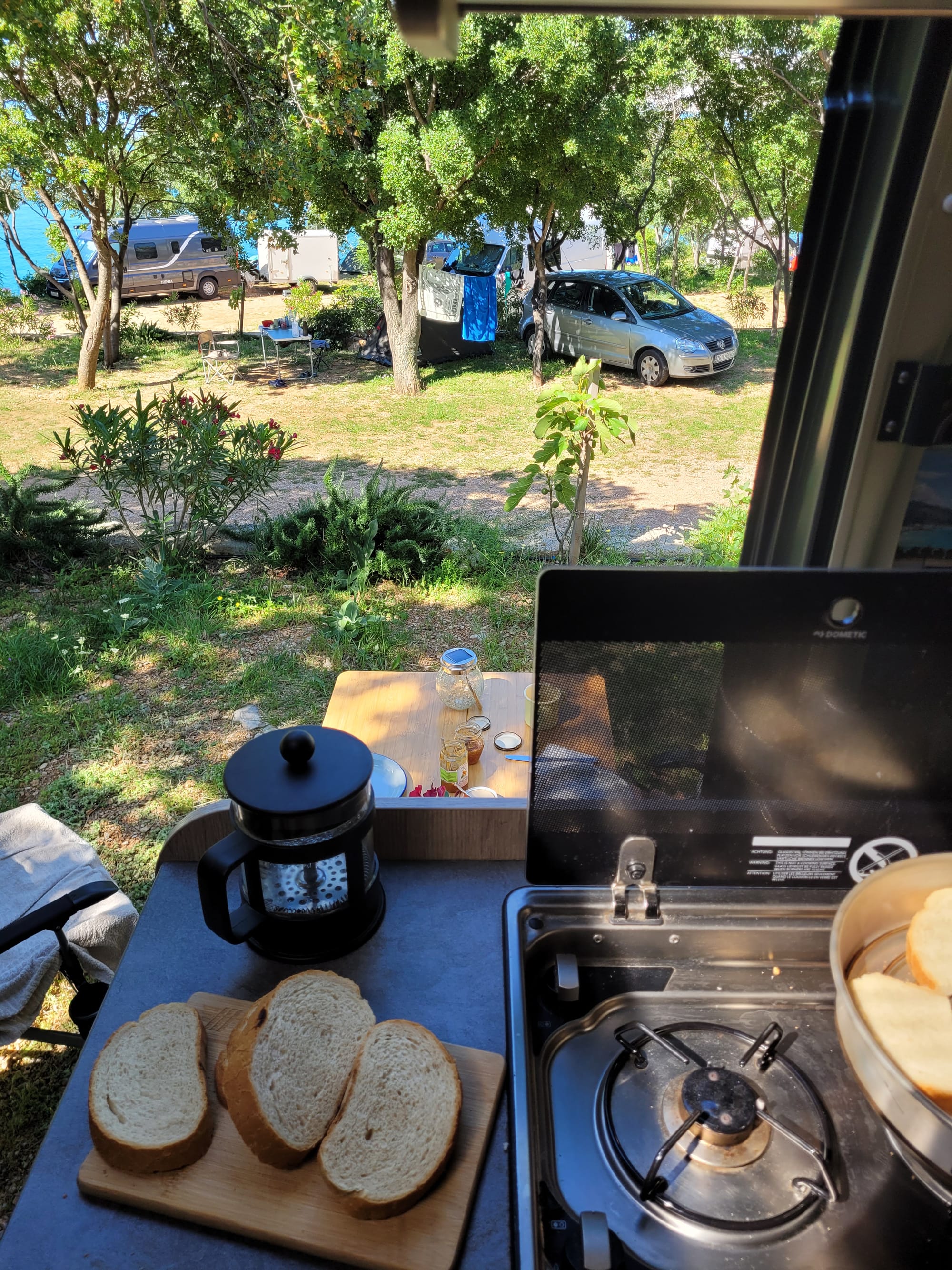 Zufrieden mit unserem Platz bereiten wir uns aus dem frischgekauften aber nicht frischen Brot vom Campingplatz Restaurant ein Toastbrot...