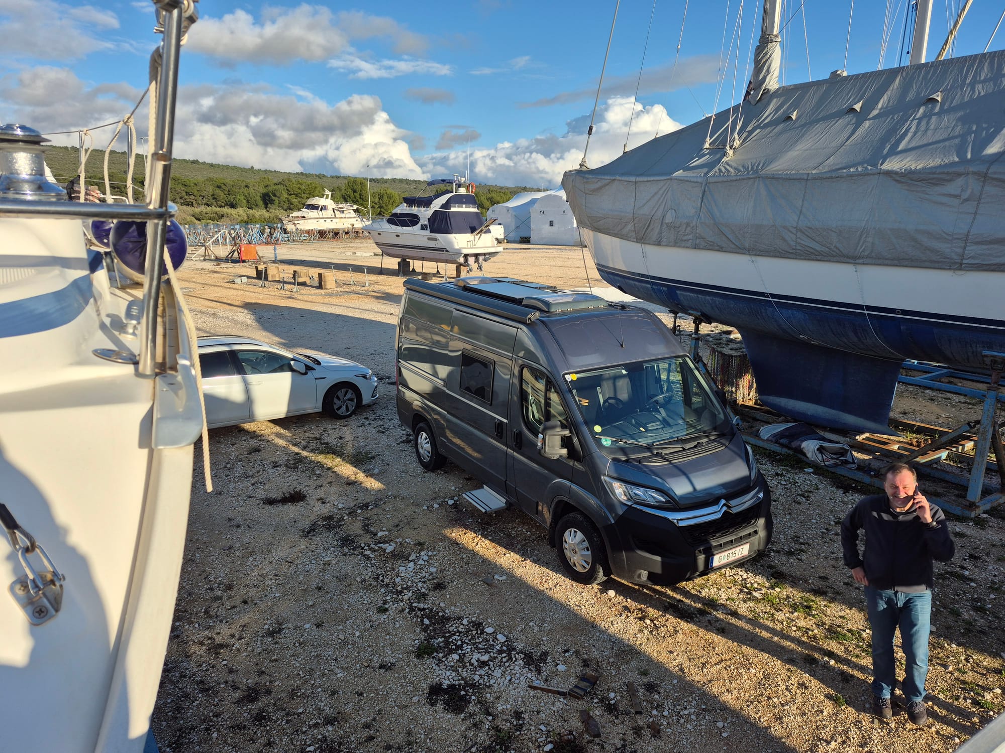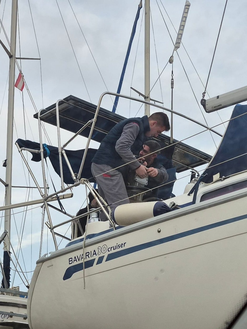 Während der Mechanikerarbeiten meldet sich der Sattler aus Biograd. Die sind jetzt auch zu zweit da um sich unser Bimini anzuschauen. Jetzt ist full house auf der Life.