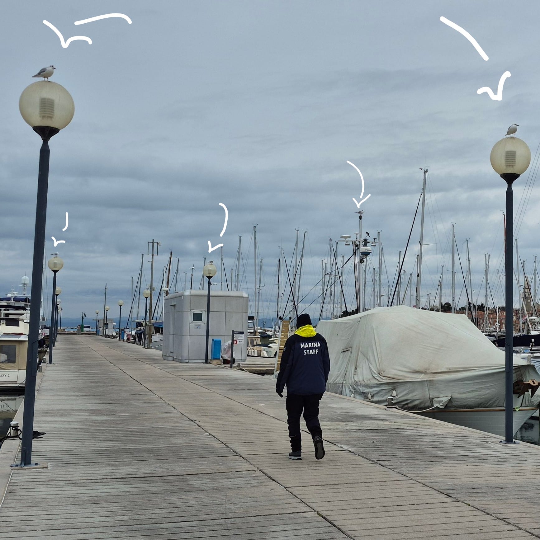 Der Marinero empfängt uns beim Tor, und mit ihm ein Möwenkomitee.