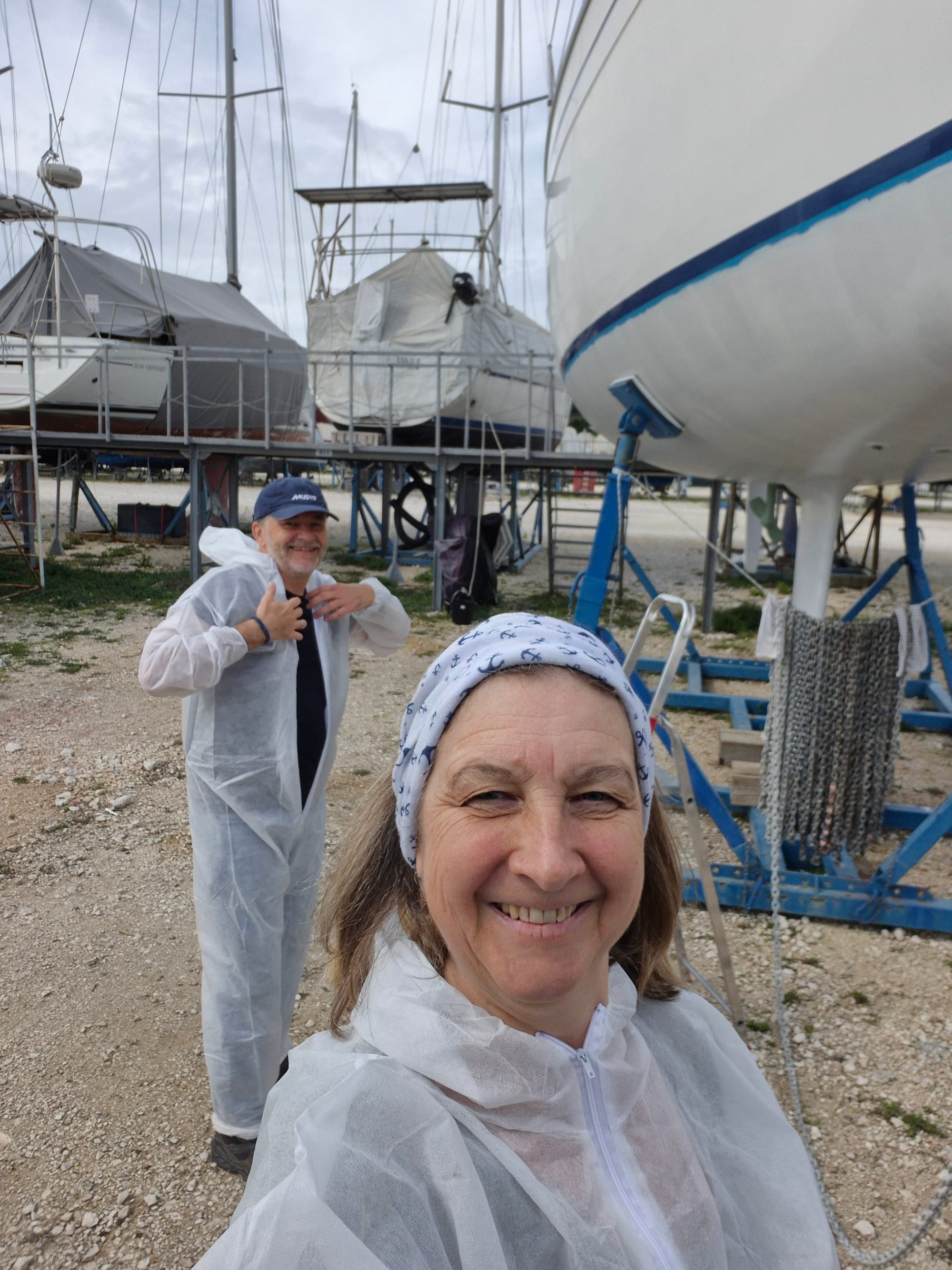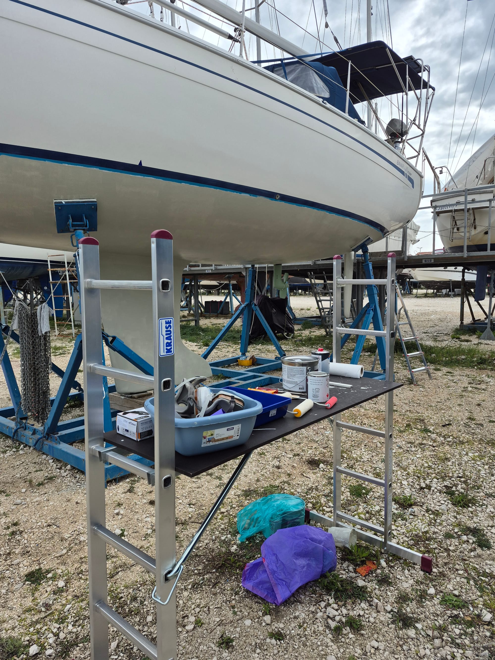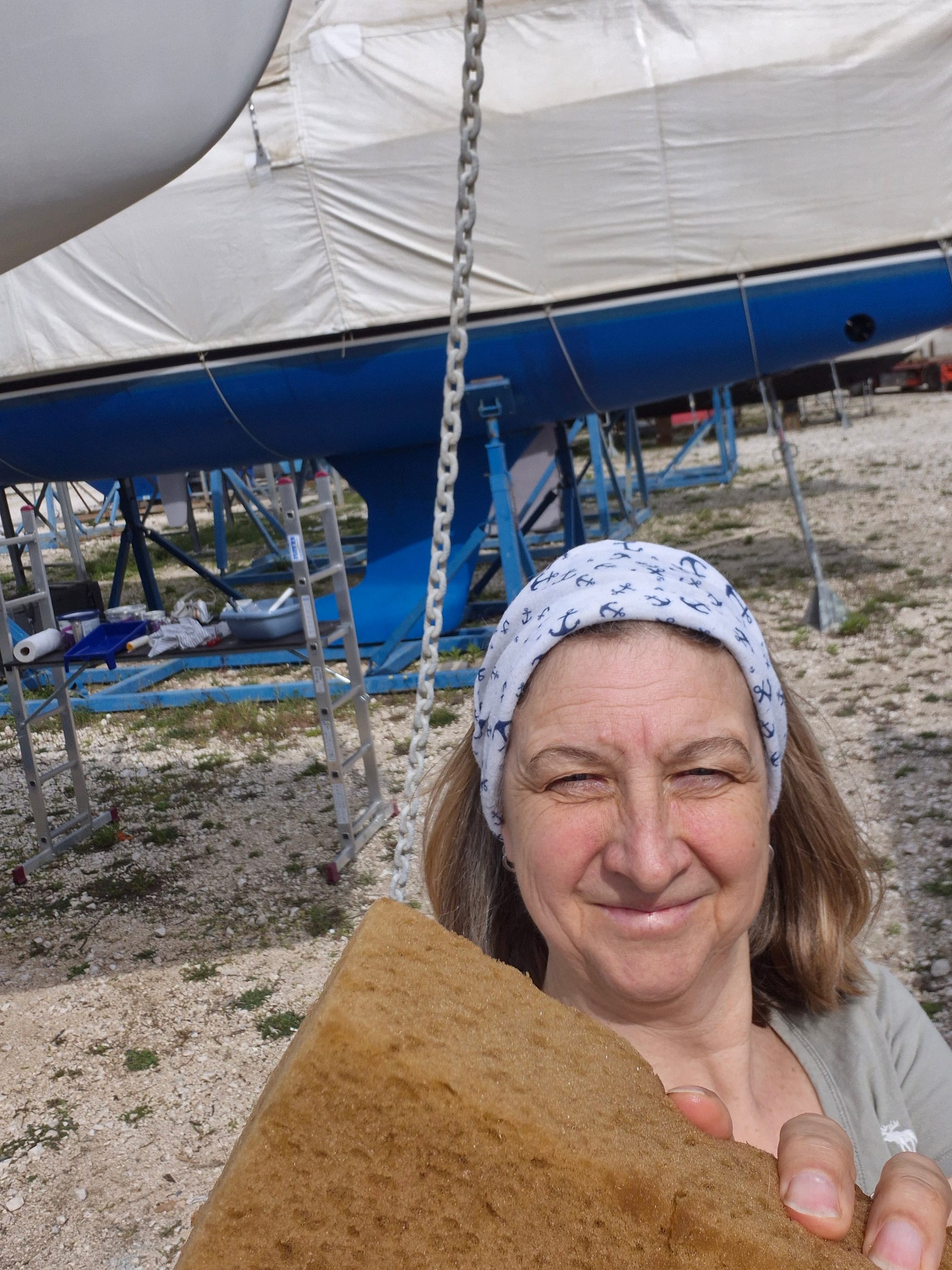 Eineinhalb Stunden später sind wir fertig, die Farbe ist verteilt, am Unterwasserschiff...