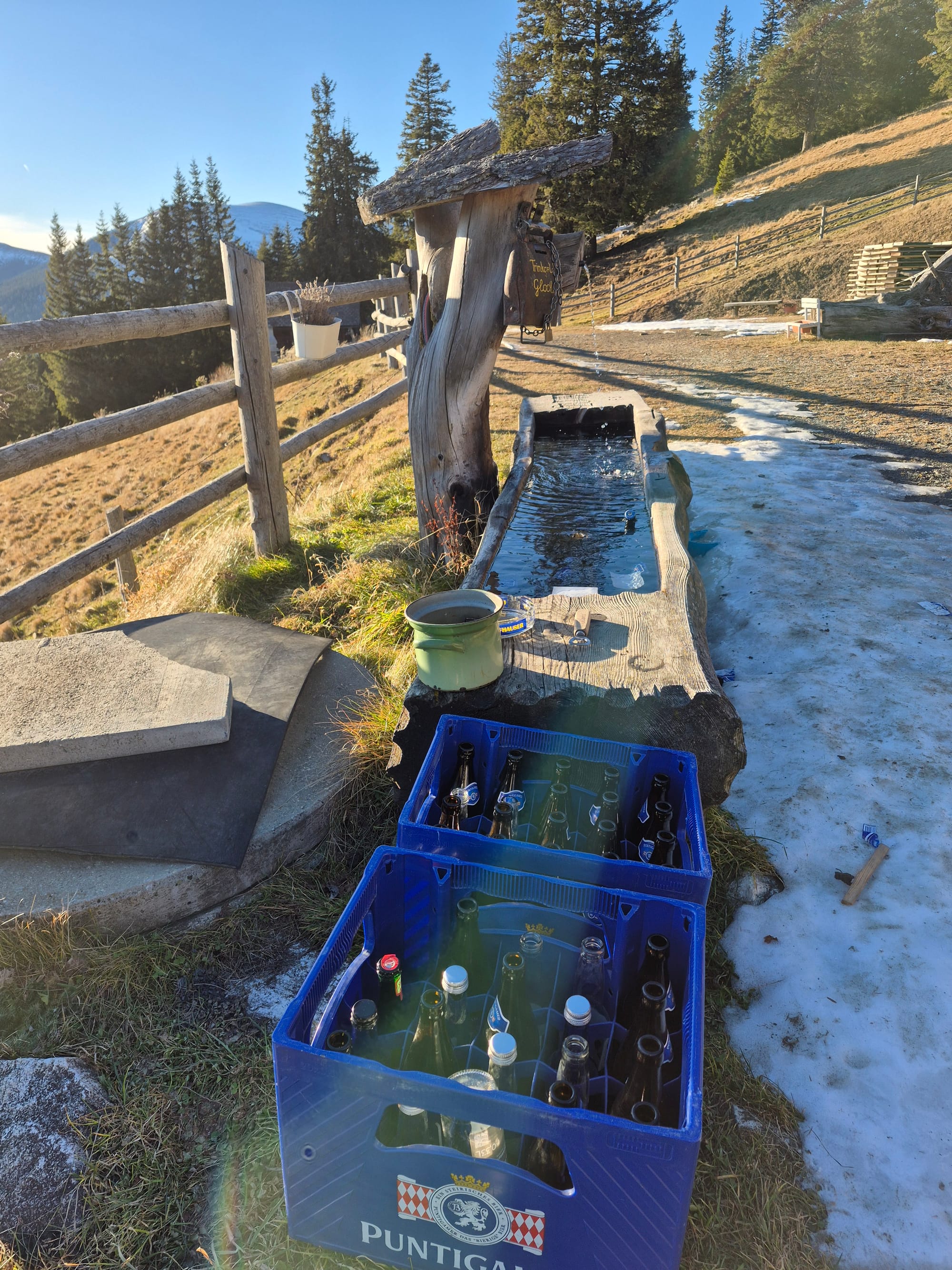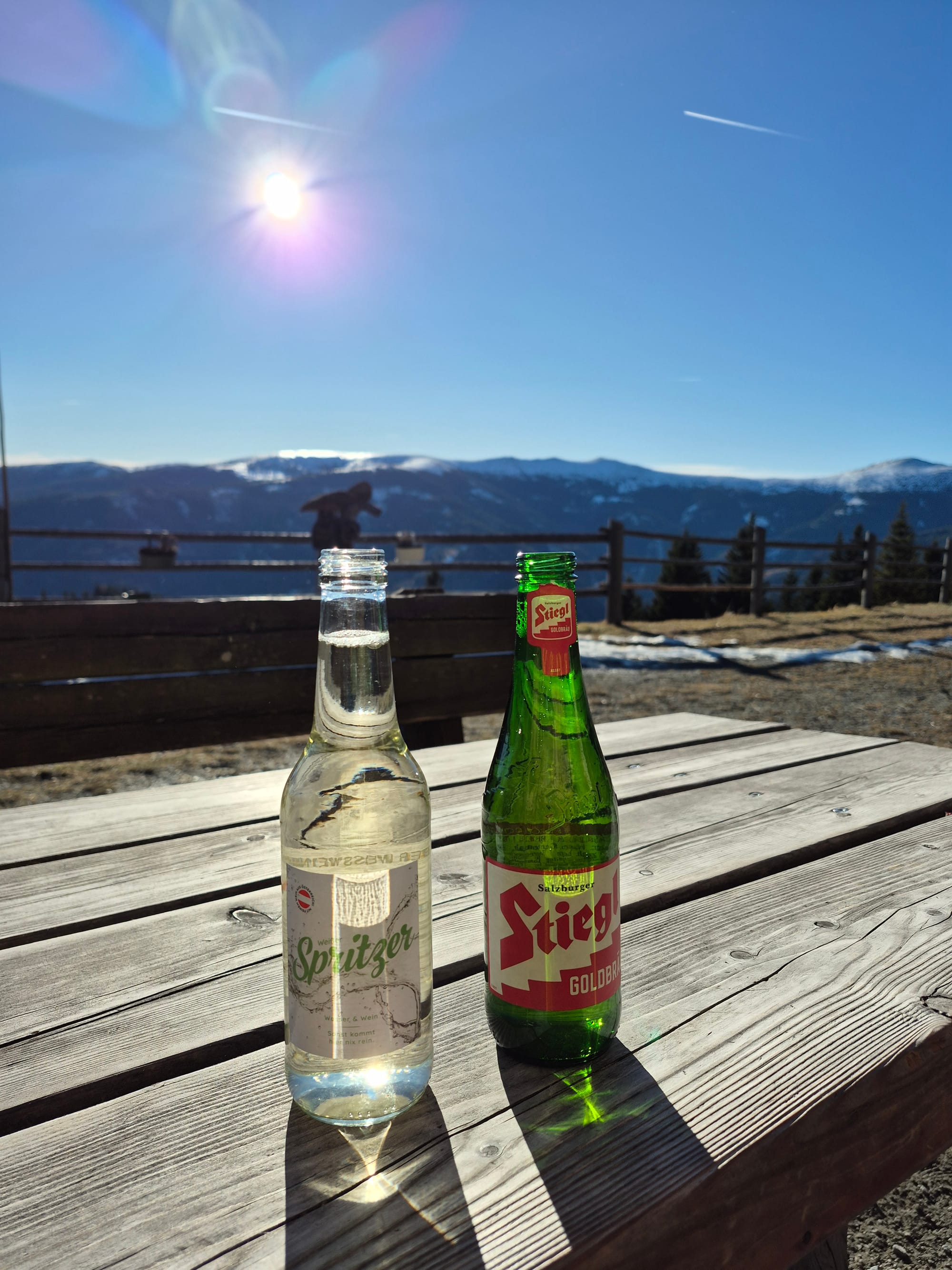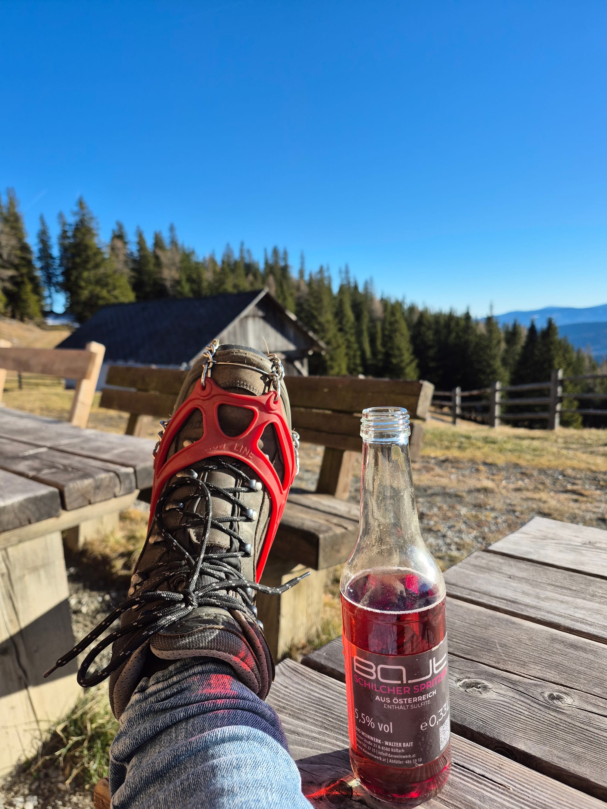 Dann entdecke ich, dass der Selbstbedienungsbrunnen, der bis jetzt nur Bier und Limonade hatte, sein Sortiment erweitert hat. Es gibt jetzt auch weißen und Schilcherspritzer. 🤗