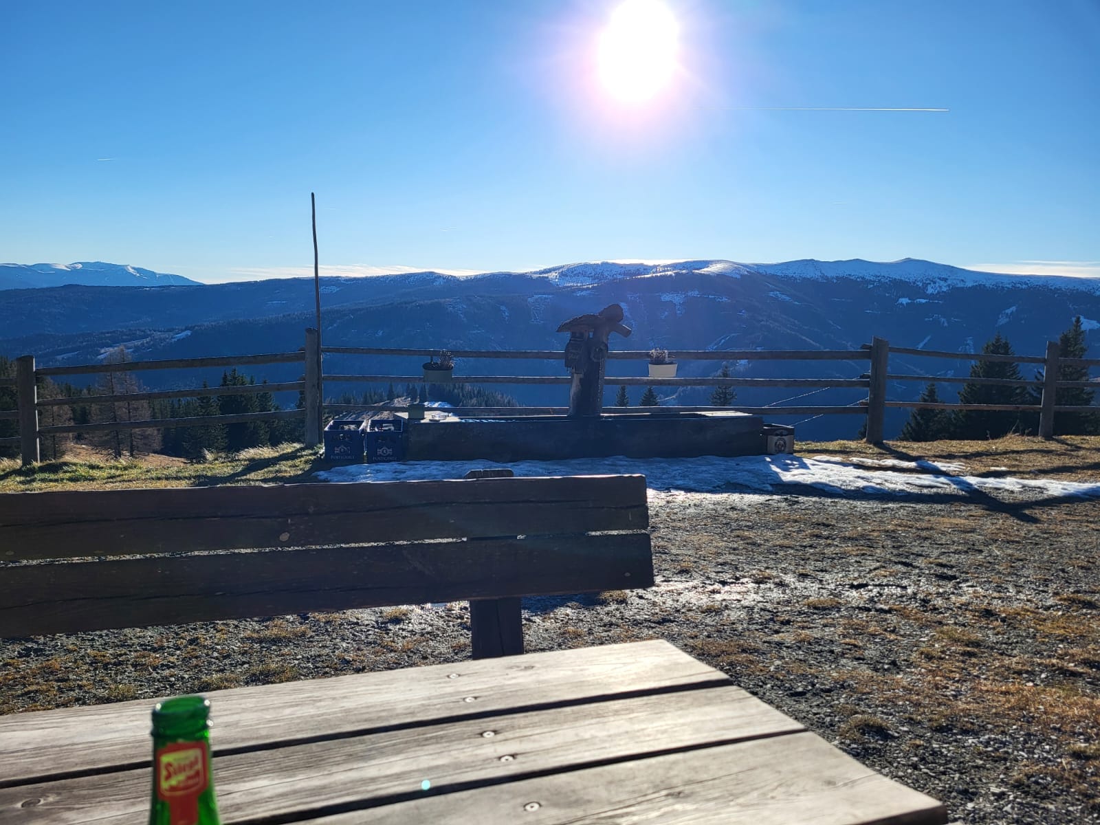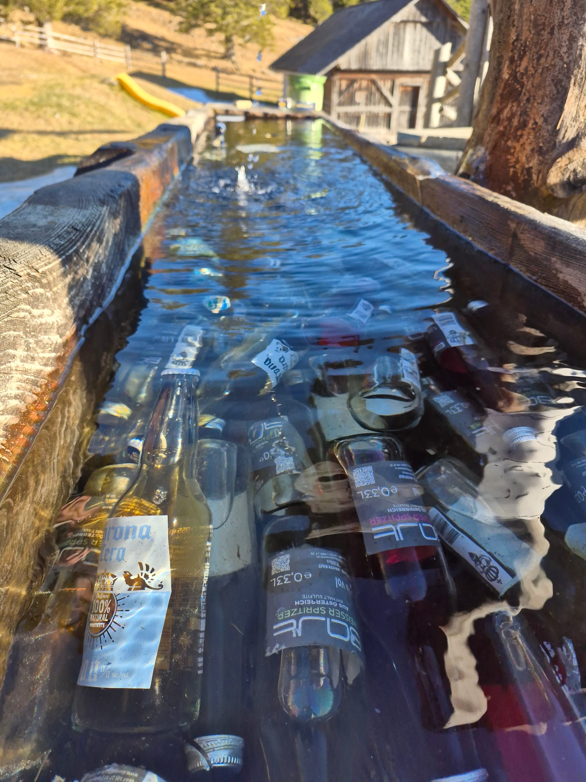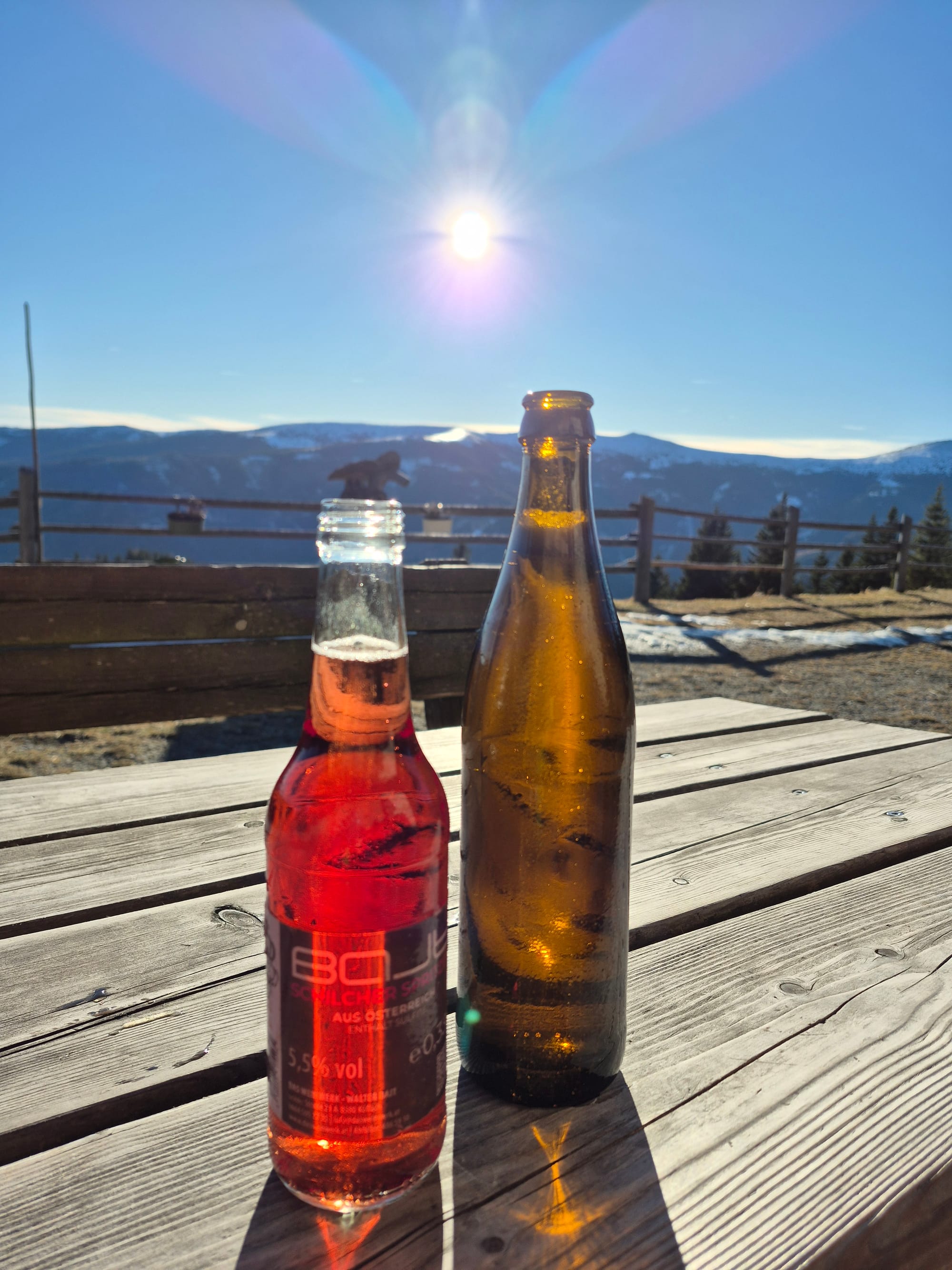 Dann entdecke ich, dass der Selbstbedienungsbrunnen, der bis jetzt nur Bier und Limonade hatte, sein Sortiment erweitert hat. Es gibt jetzt auch weißen und Schilcherspritzer. 🤗