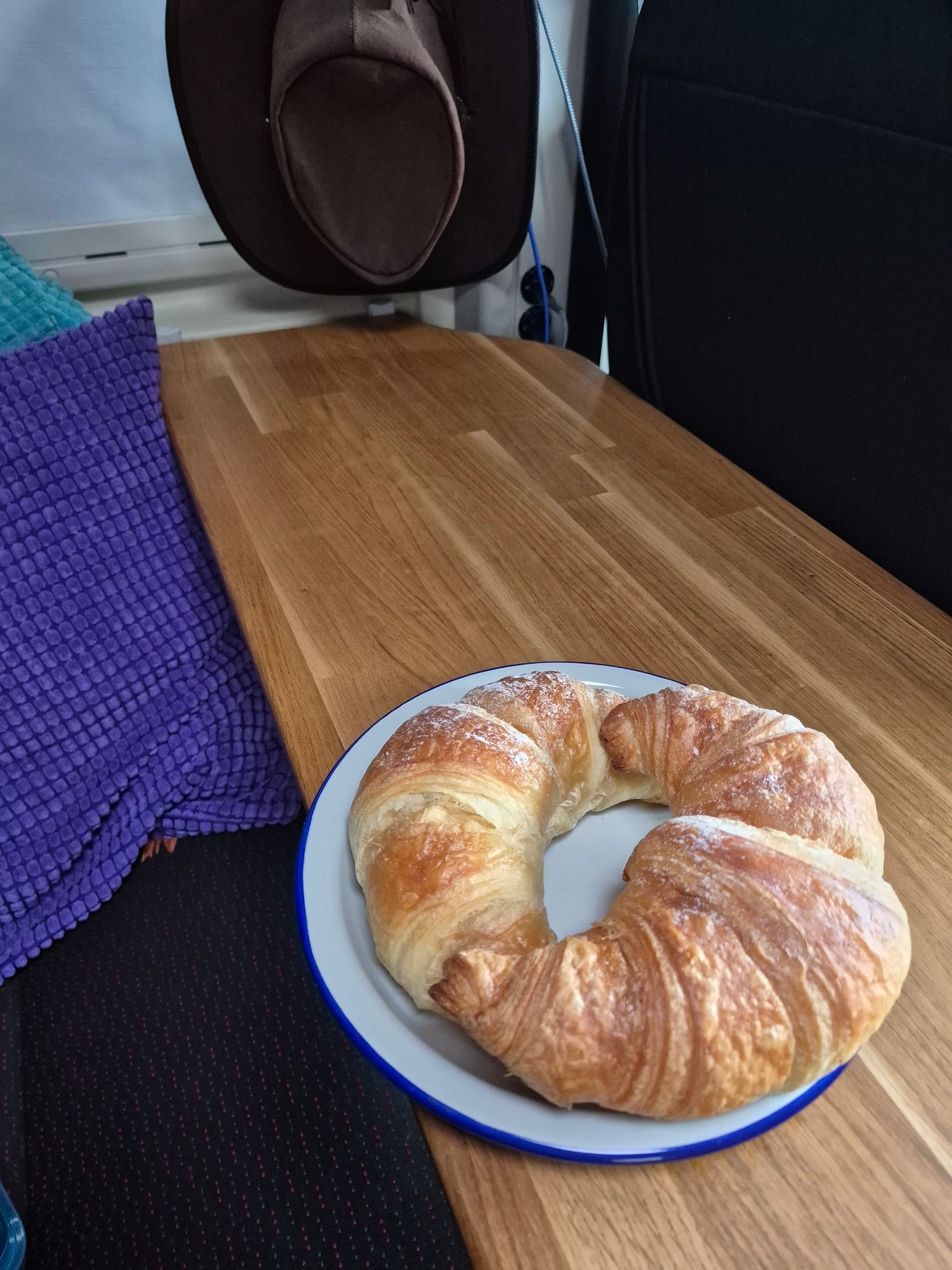 Um 8:00 genügt uns ein Blick aus dem Fenster um zu beschließen, dass wir den Vormittag im Bett verbringen - es ist total grau. Schnell schlafen wir wieder ein und wachen erst um 11:00 auf. Als Andreas den Empfang seines Handys wieder aktiviert sieht er die Nachricht von Robert: Frühstück hängt auf Luigis Radträger.