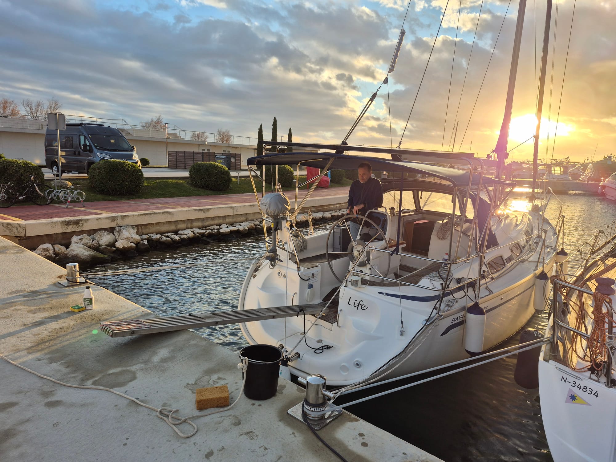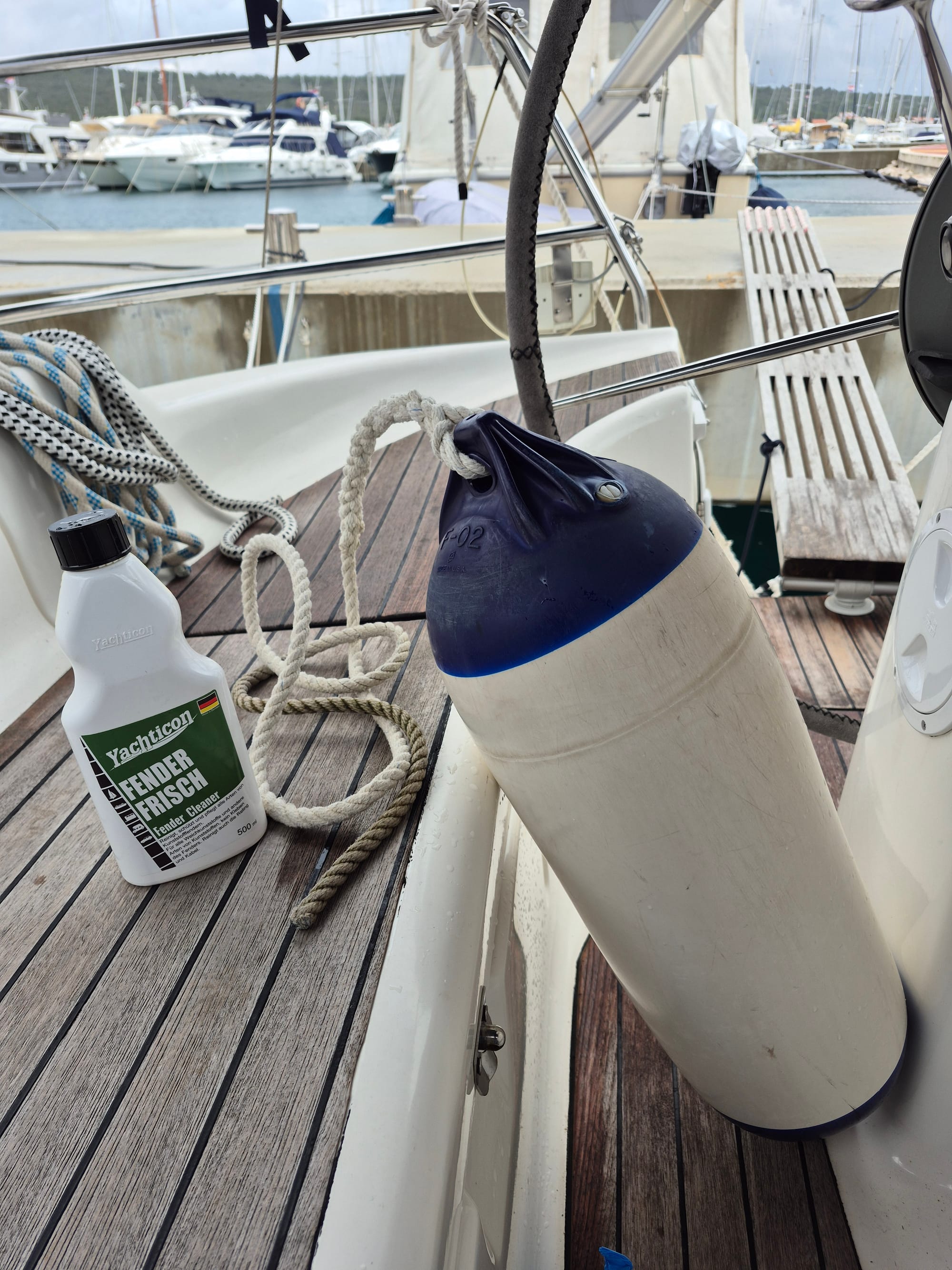 Ich putze alle 6 Fender und dann auch noch das Deck. Da haben unsere Freunde, die Möwen, einiges hinterlassen. 💩💩